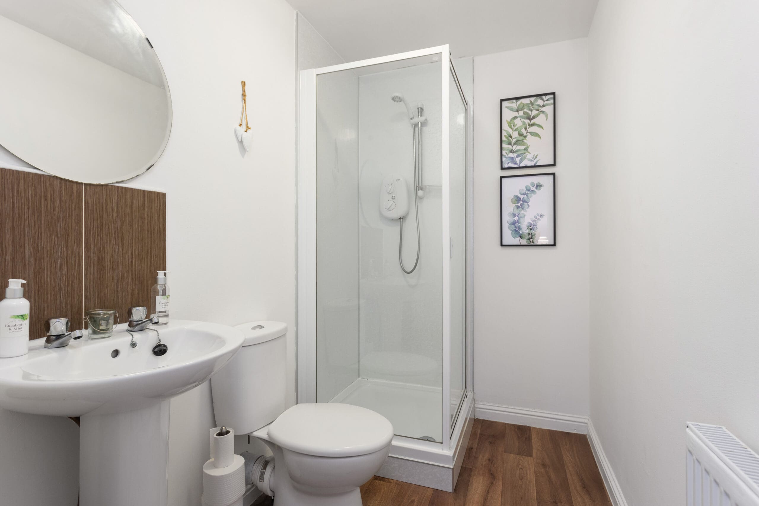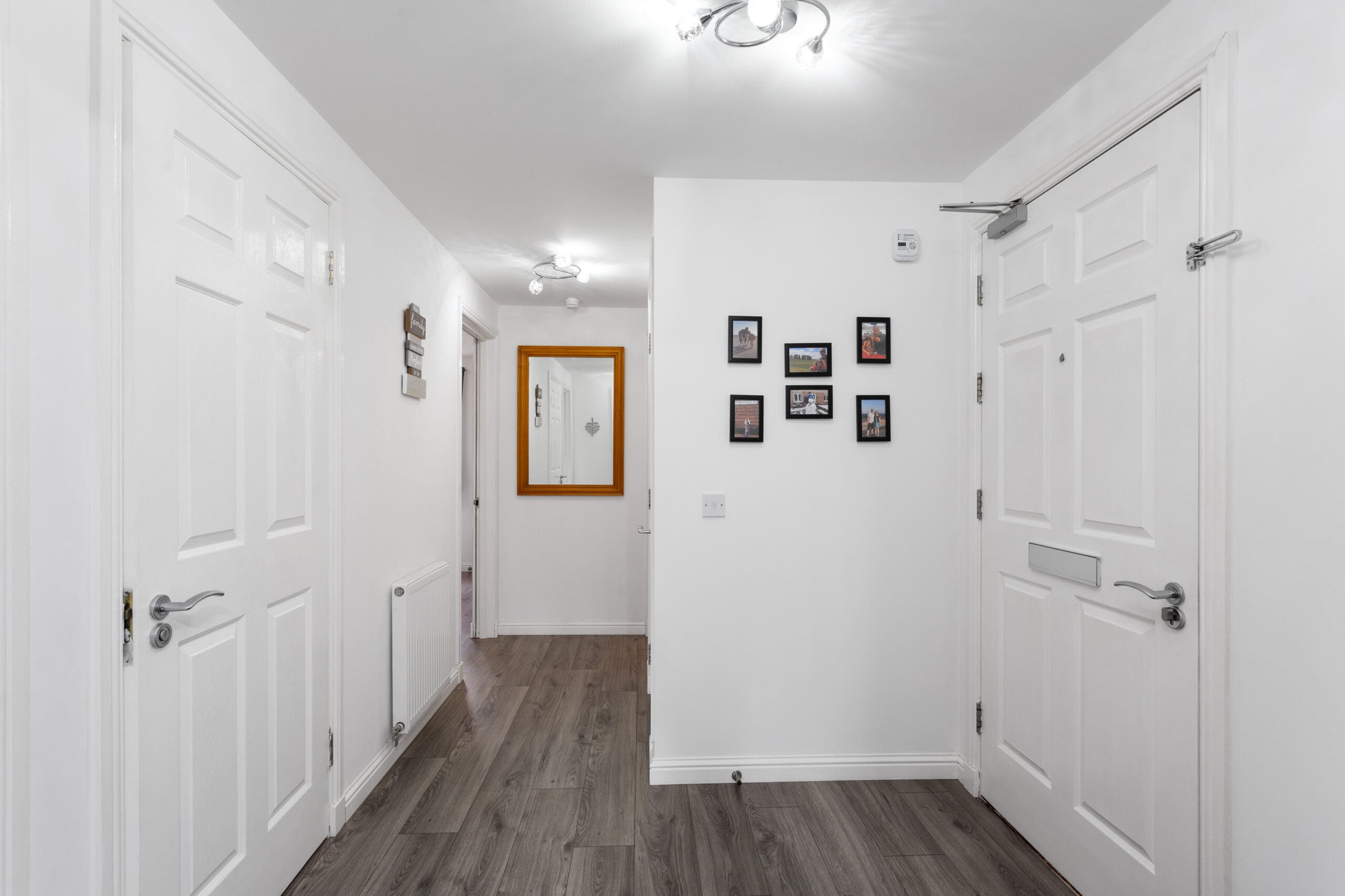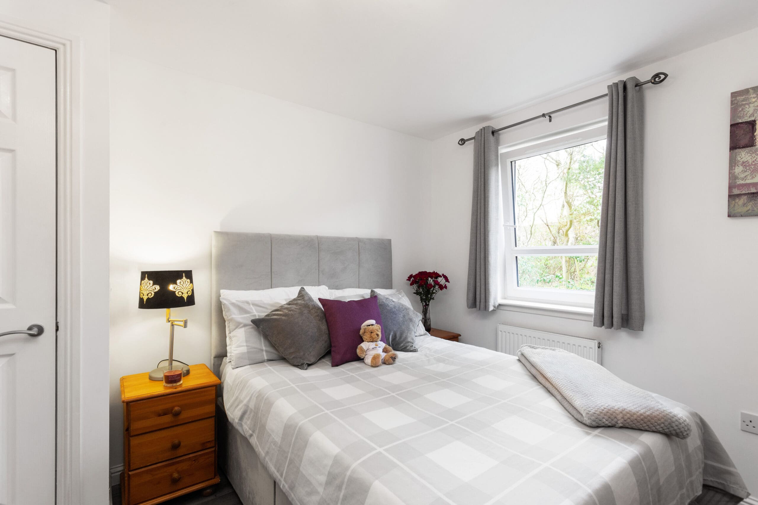 Retreat to the master bedroom, a sanctuary of calm with fitted wardrobes, an additional store cupboard, and the luxury of an en-suite featuring a modern white suite with shower cubicle. Bedroom 2 is equally impressive, a generous double with room for furnishings, ensuring both sleeping spaces are as comfortable as they are practical, with consistent laminate flooring throughout.