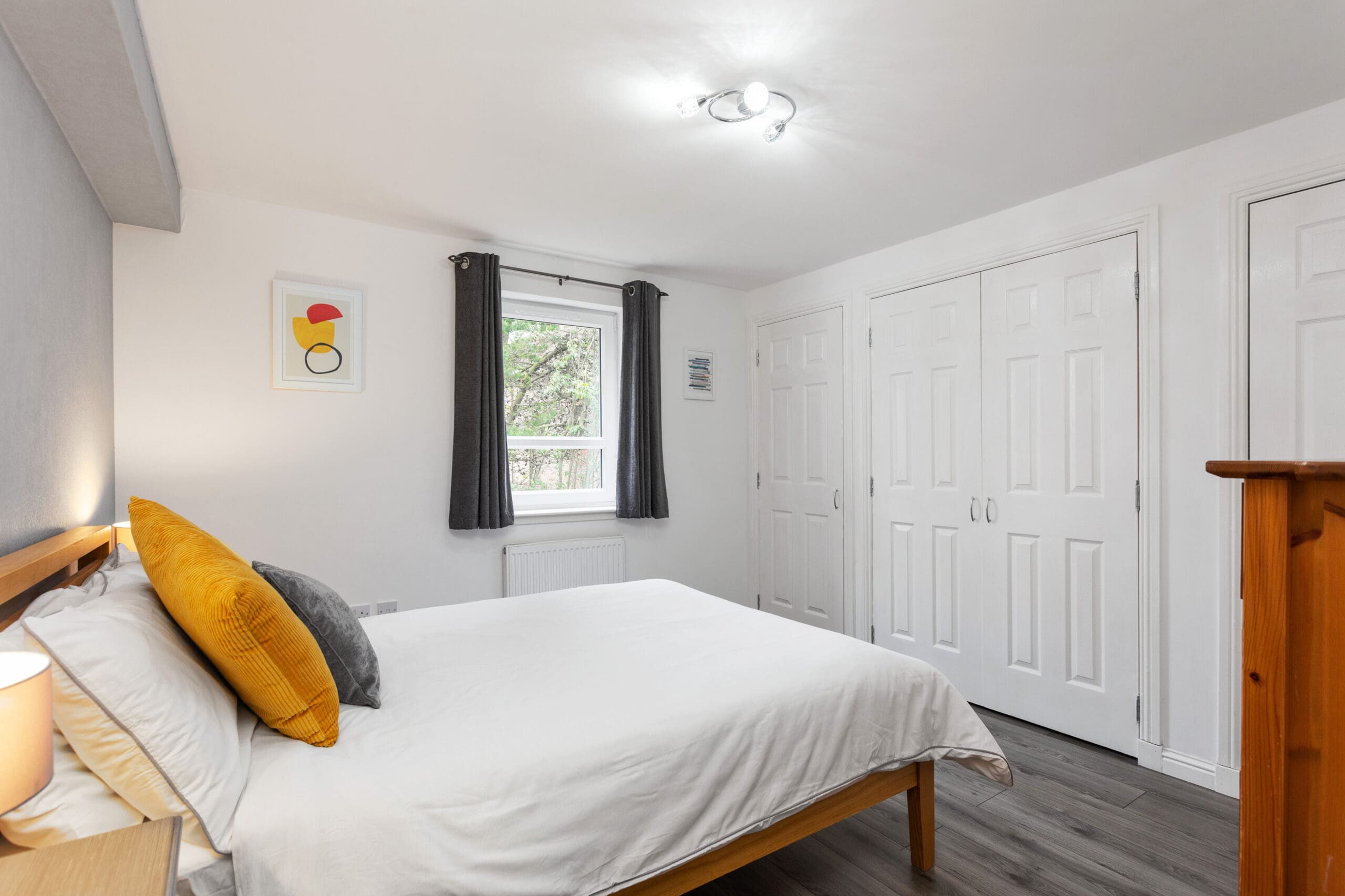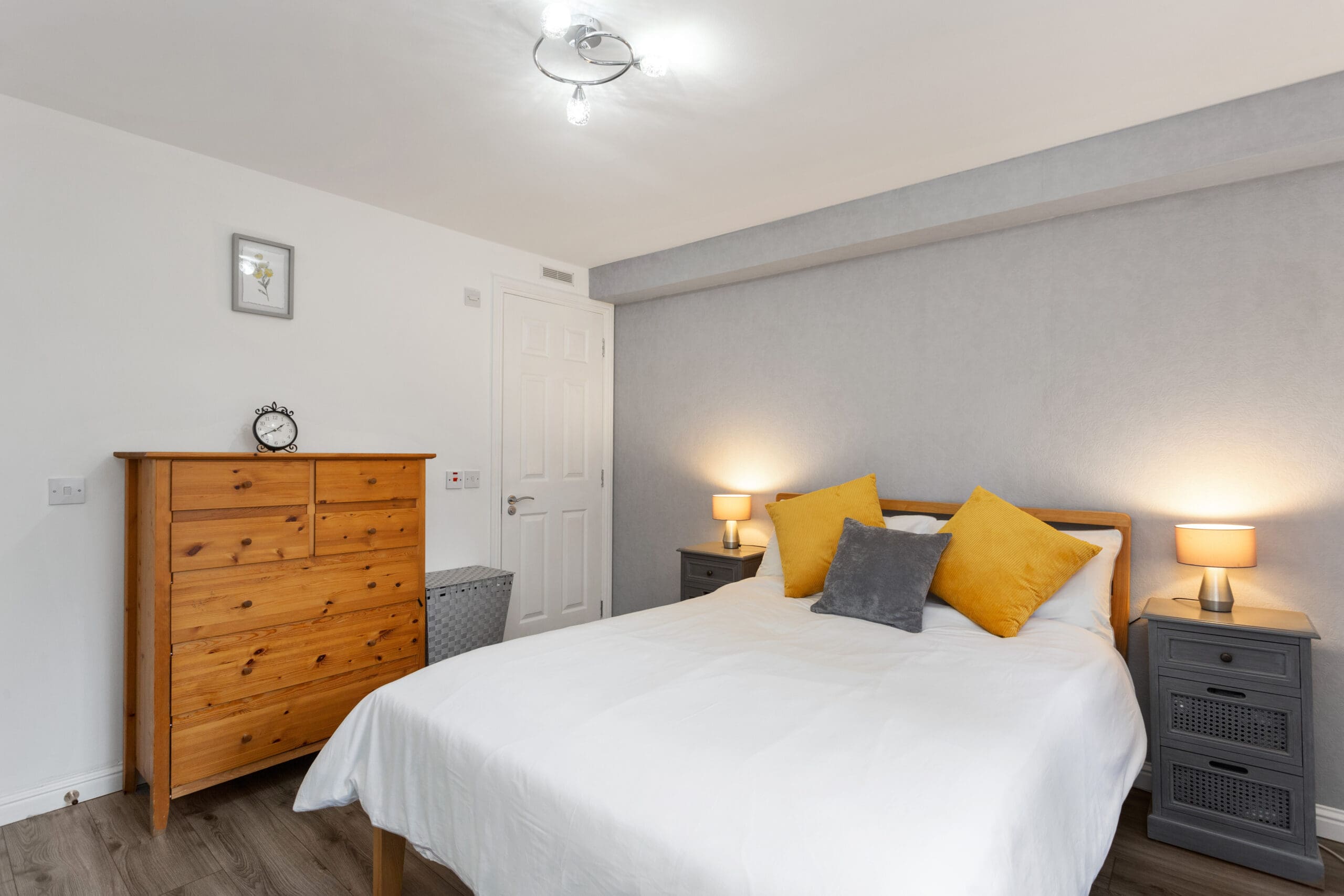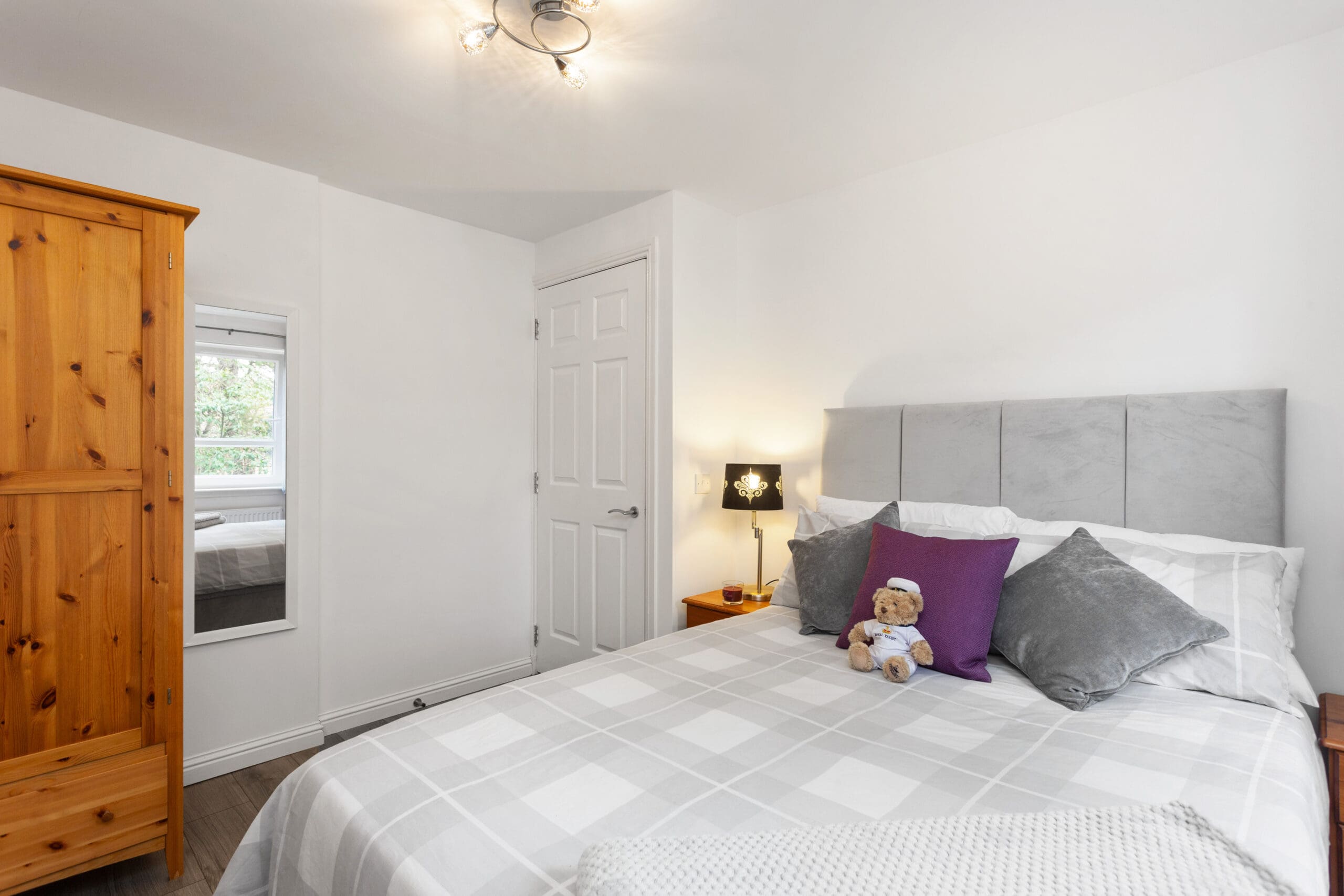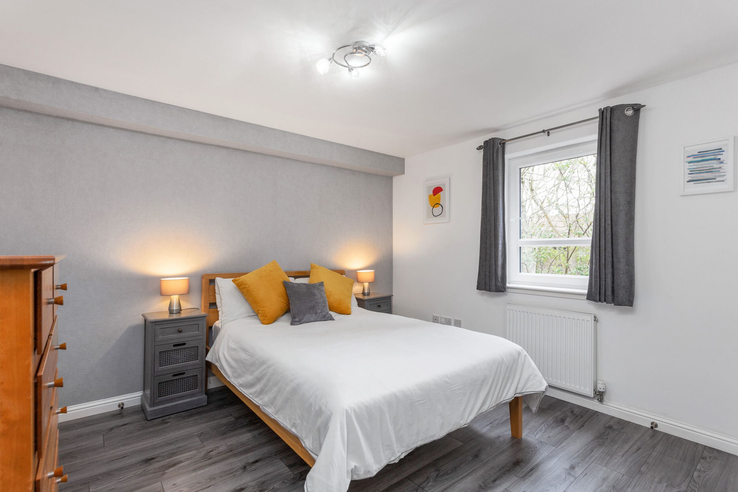 Retreat to the master bedroom, a sanctuary of calm with fitted wardrobes, an additional store cupboard, and the luxury of an en-suite featuring a modern white suite with shower cubicle. Bedroom 2 is equally impressive, a generous double with room for furnishings, ensuring both sleeping spaces are as comfortable as they are practical, with consistent laminate flooring throughout.