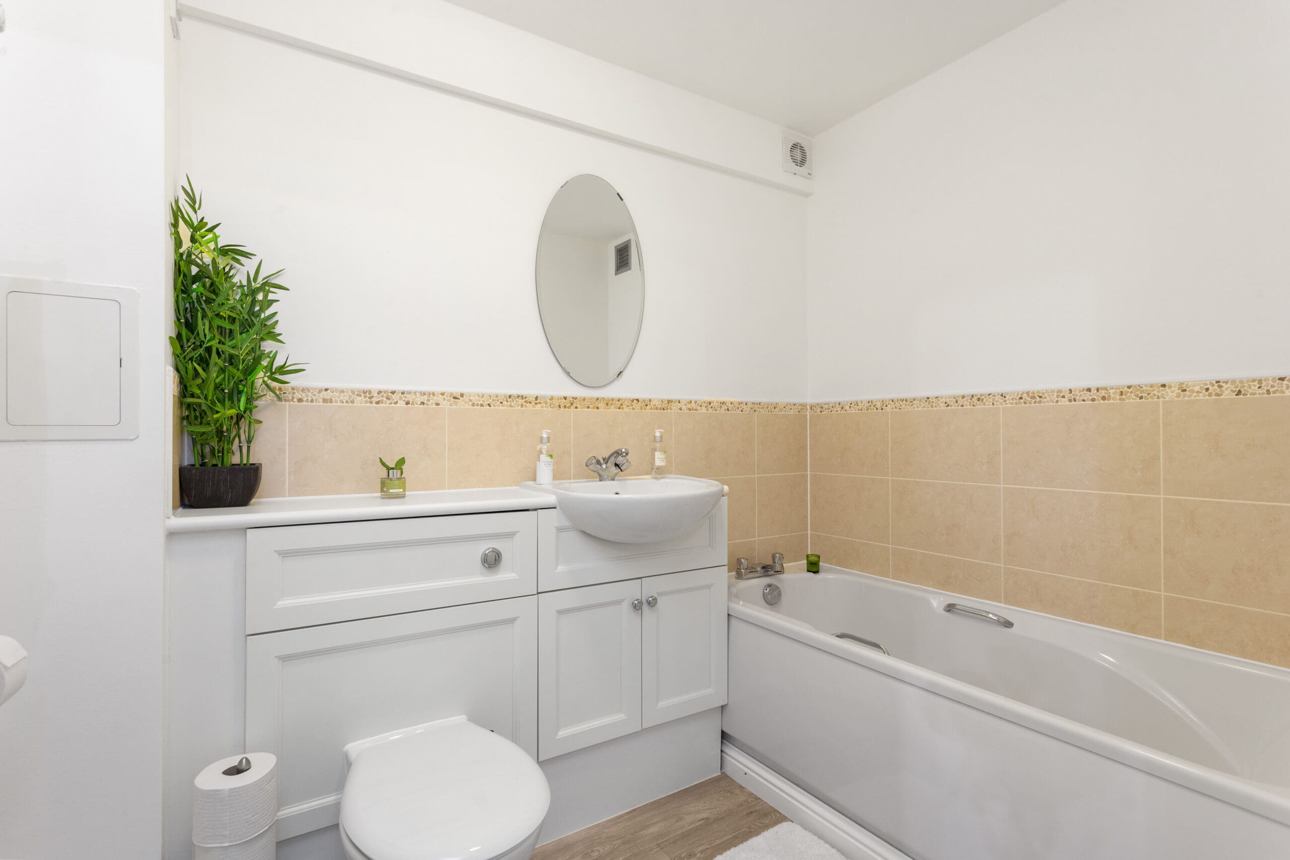 The main bathroom does not disappoint, providing a serene space with a white suite, vanity storage, and grey vinyl flooring, perfect for soaking away the stresses of the day.