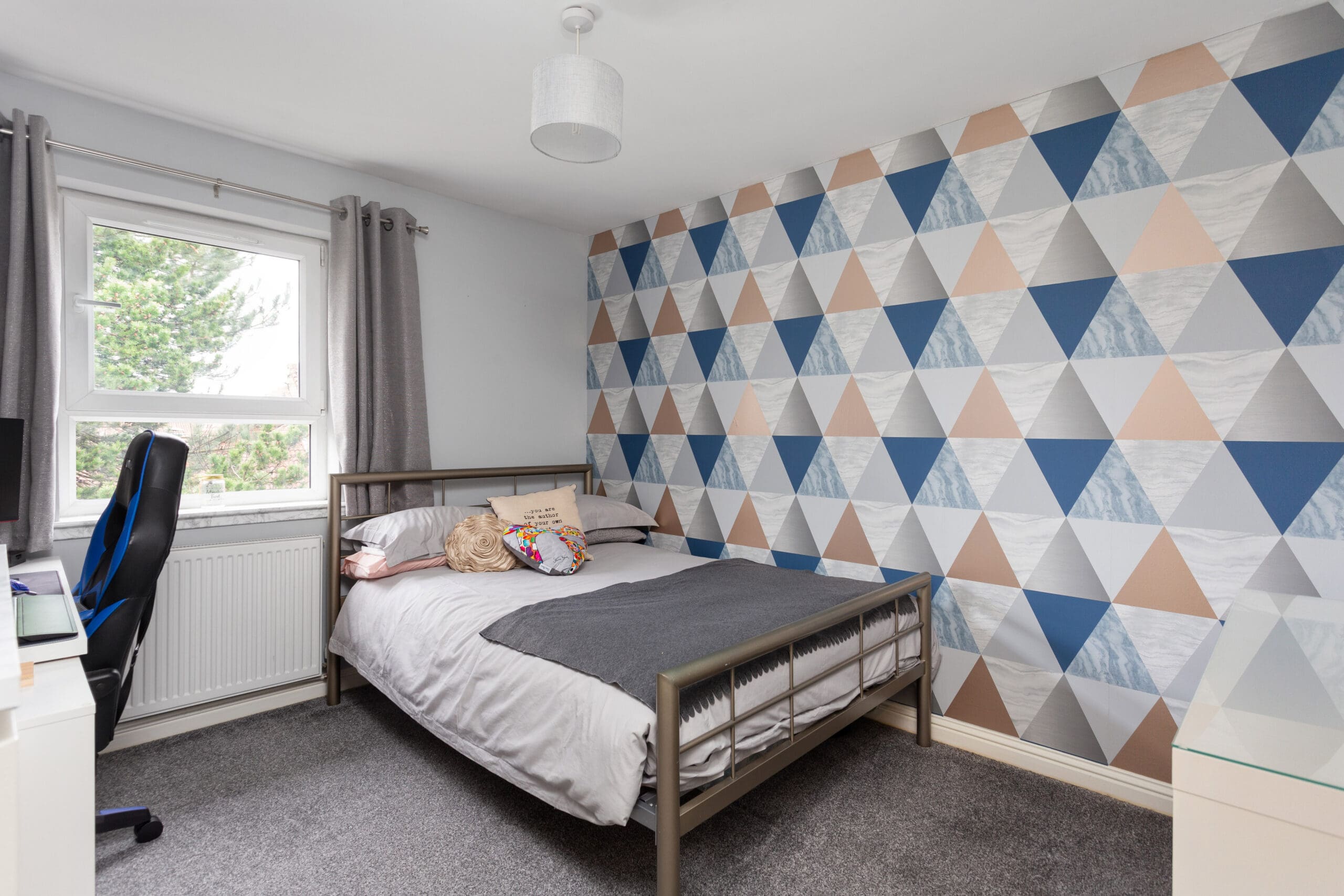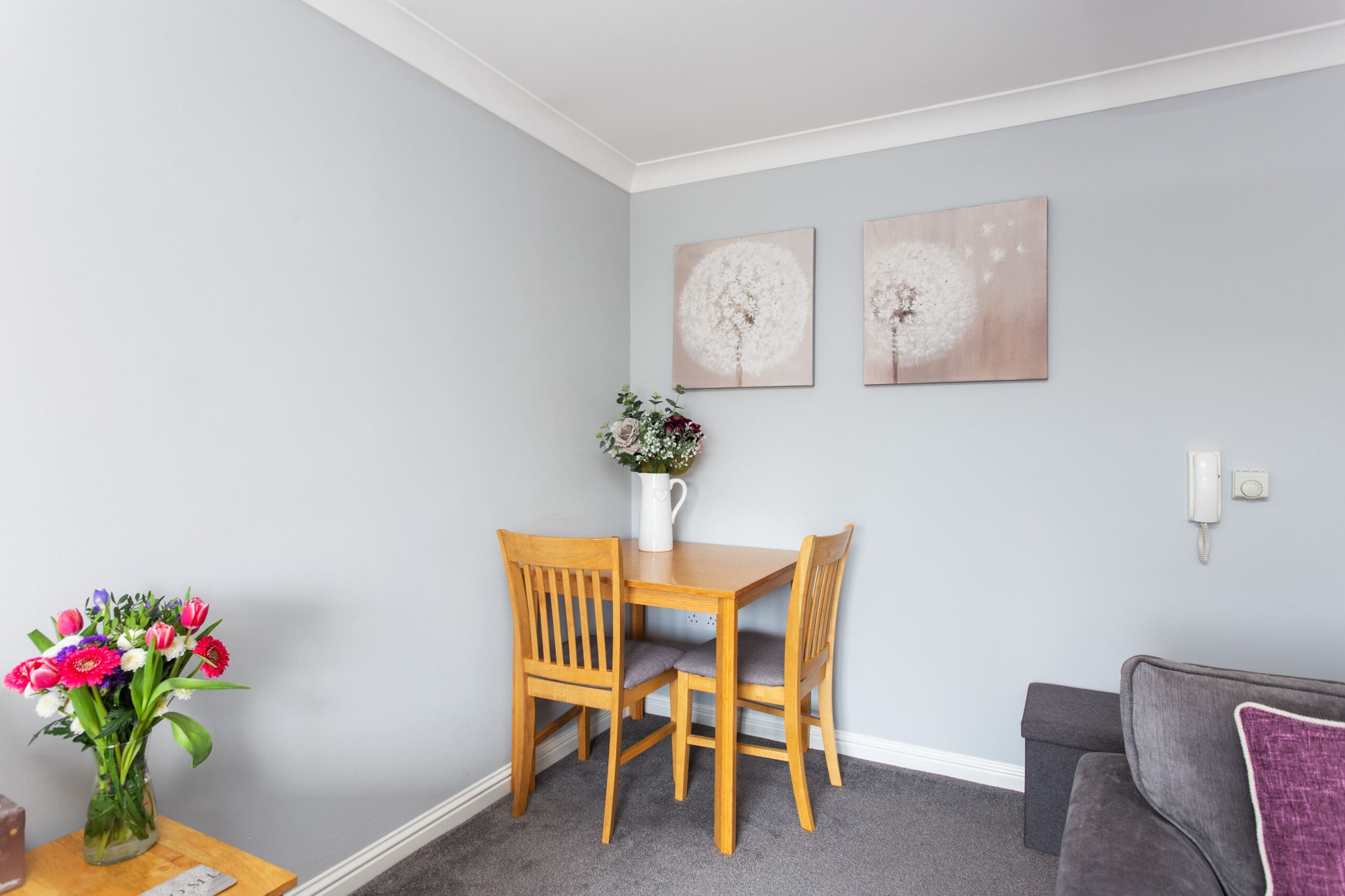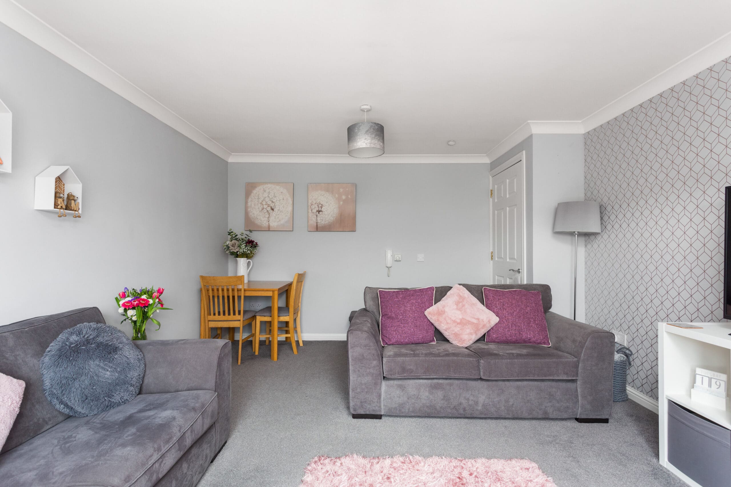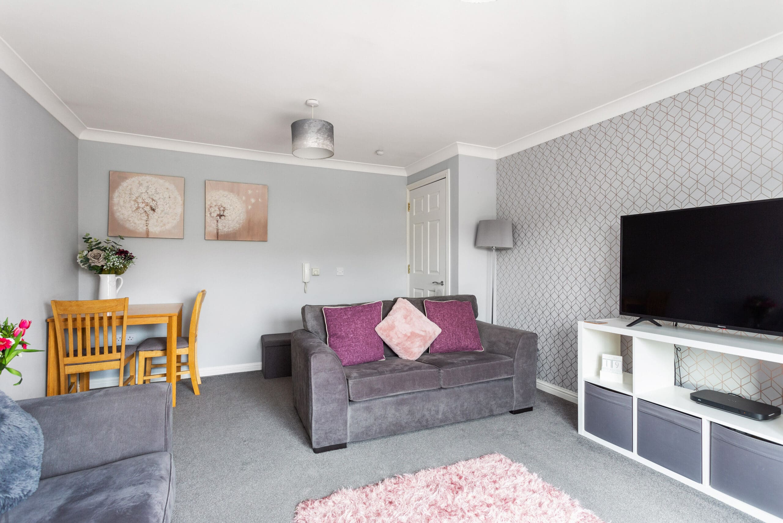 The lovely bright and airy lounge/diner offers a large window with views to the front which provides an abundance of natural light, providing a perfect space for complete relaxation. The walls are finished in a light grey paint with a subtle, elegant wallpaper to one wall. This apartment is an excellent choice for those seeking modern, comfortable living in a desirable location.