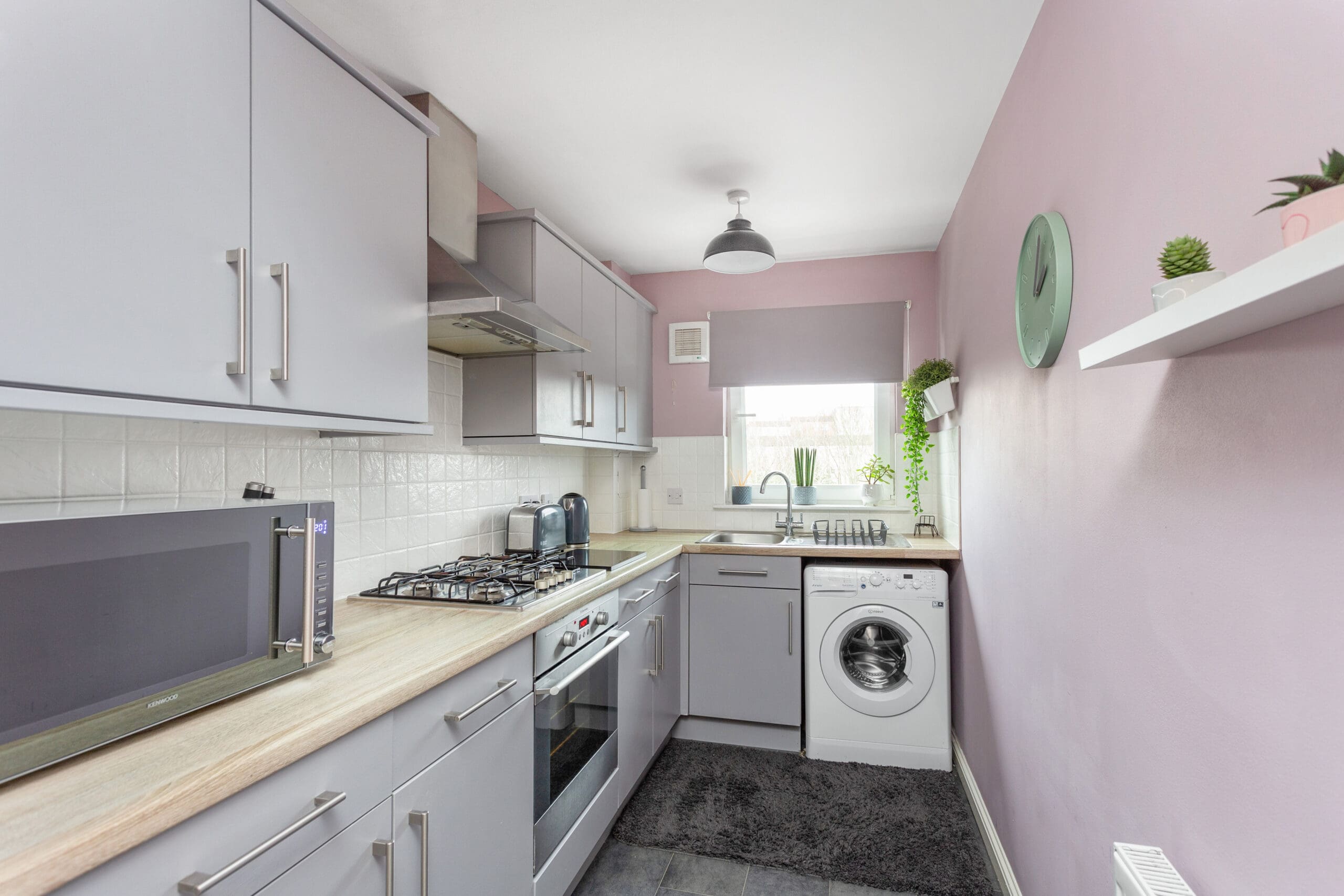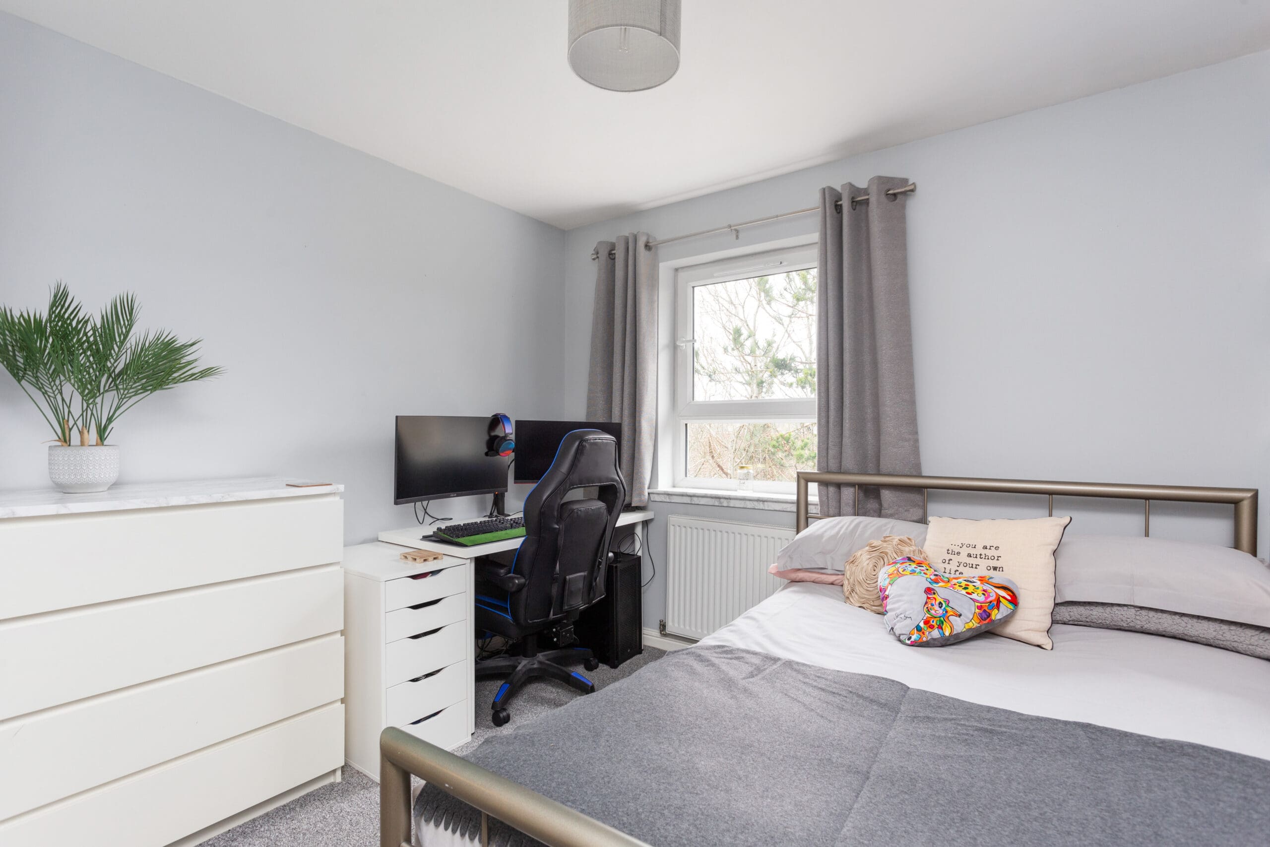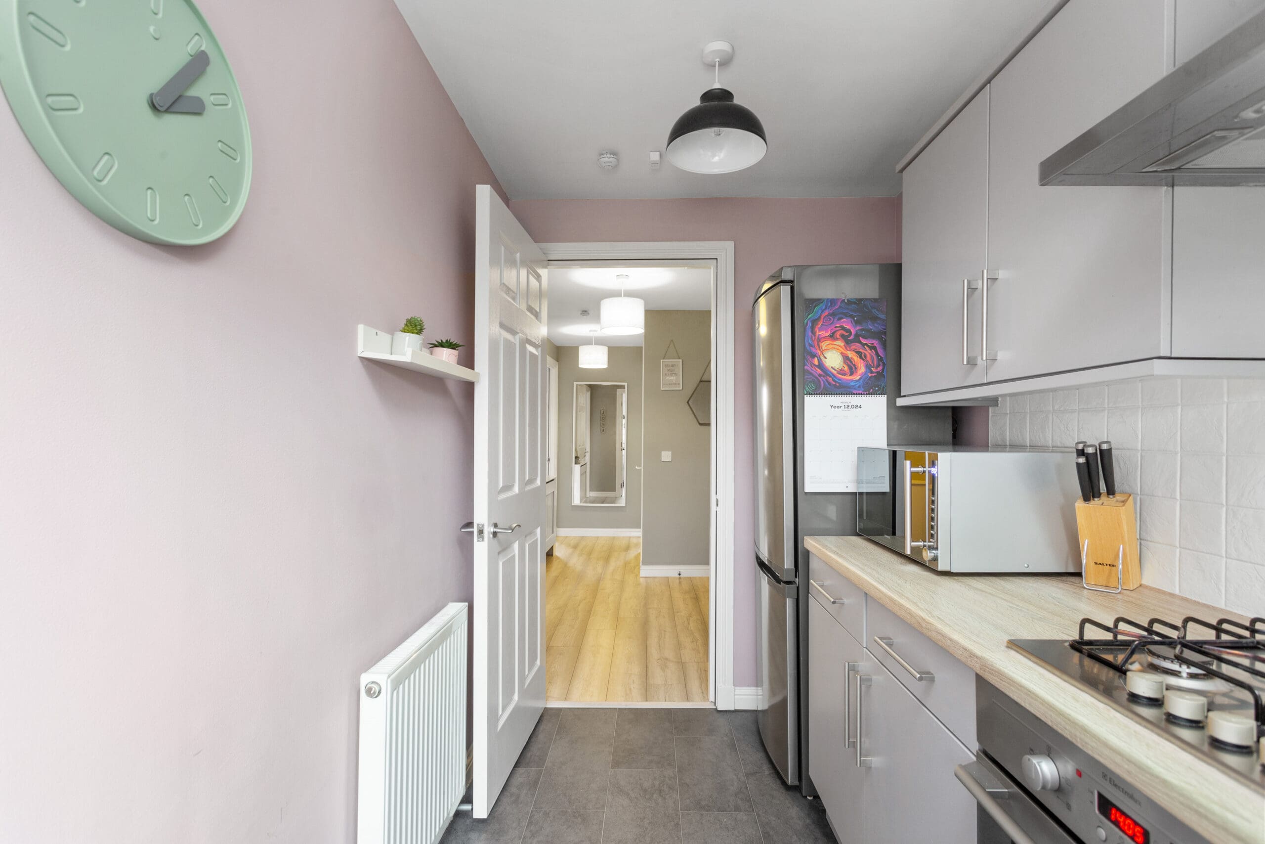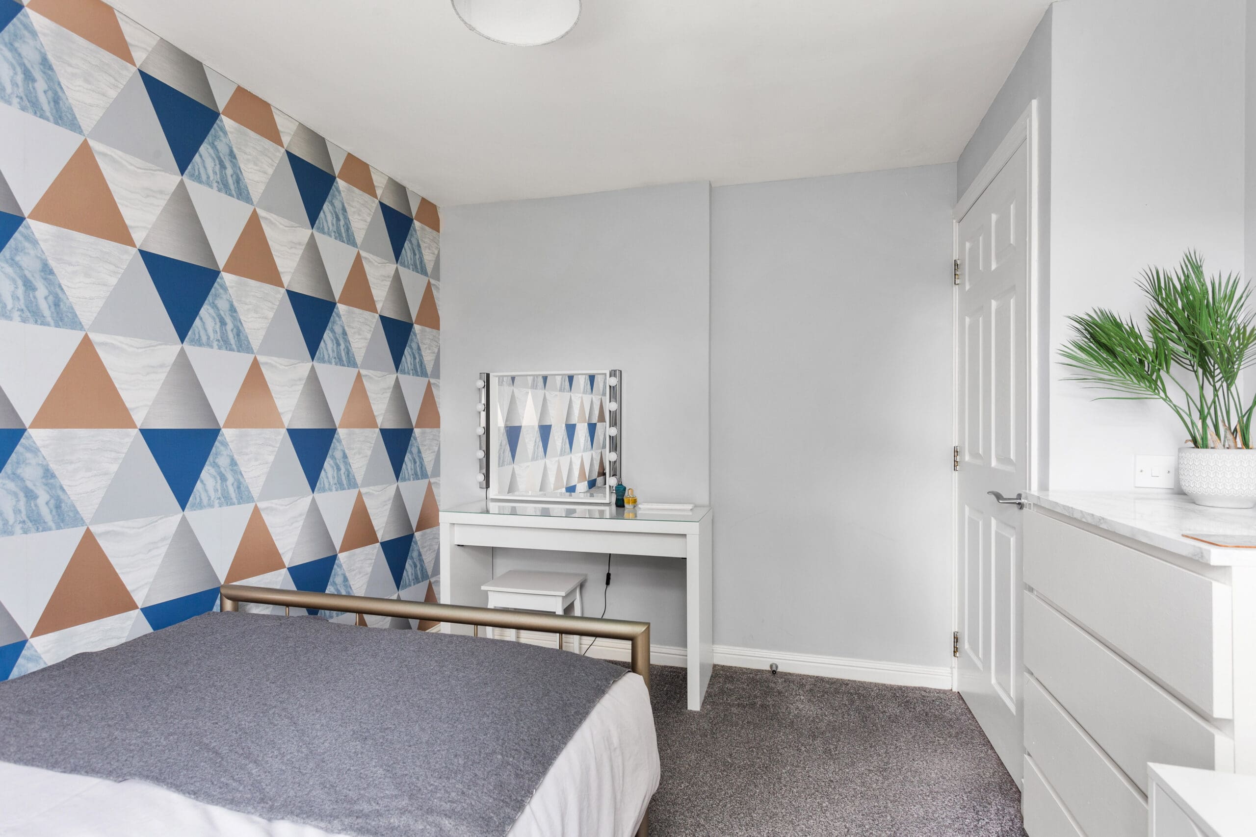 The lovely bright and airy lounge/diner offers a large window with views to the front which provides an abundance of natural light, providing a perfect space for complete relaxation. The walls are finished in a light grey paint with a subtle, elegant wallpaper to one wall. This apartment is an excellent choice for those seeking modern, comfortable living in a desirable location.