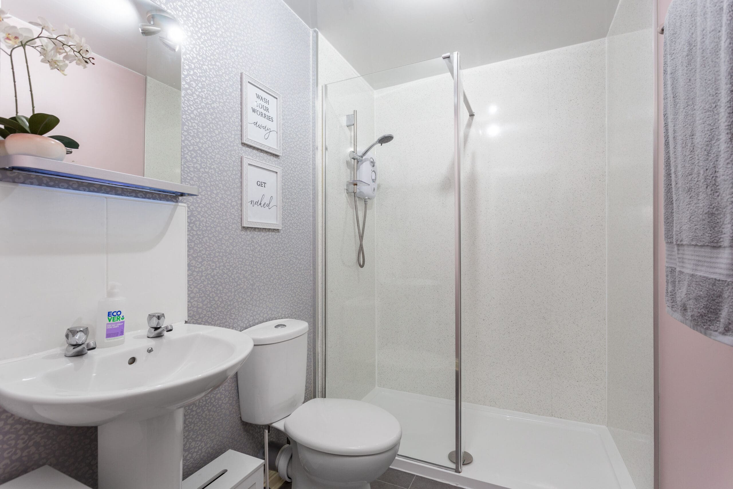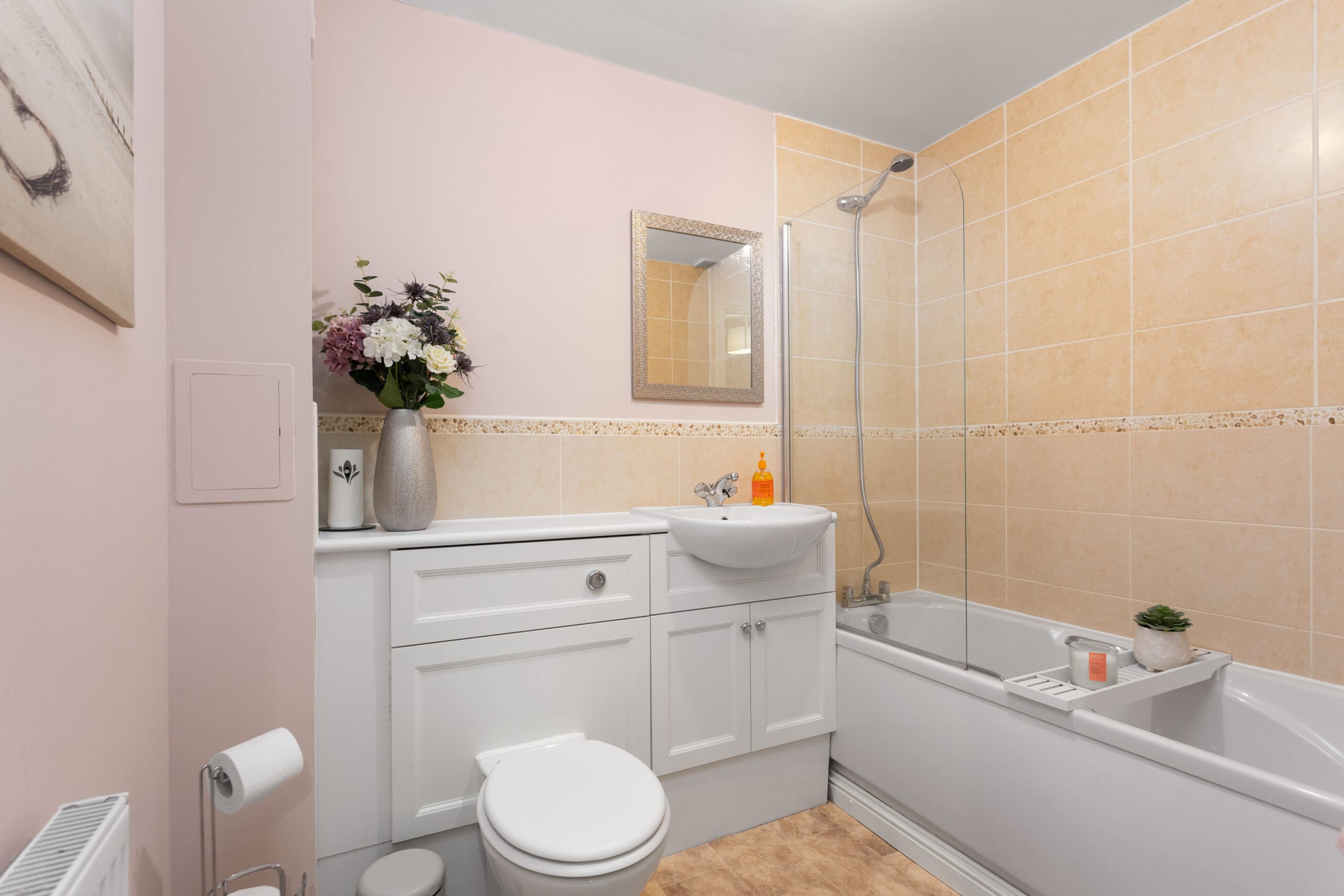 This elegant apartment features two well-presented double bedrooms, both beautifully styled in fresh neutral tones with a feature wall and offering ample space for free-standing bedroom furniture. The generously proportioned master bedroom also benefits from built-in wardrobes, an additional store cupboard and also enjoys an en suite shower room for a touch of added luxury which is finished with a striking wet wall panelling within the double shower cubicle and a vinyl floor. The bathroom with white three-piece suite and shower incorporated above the bath boasts striking splashback tiling to the walls and a co-ordinating vinyl floor.