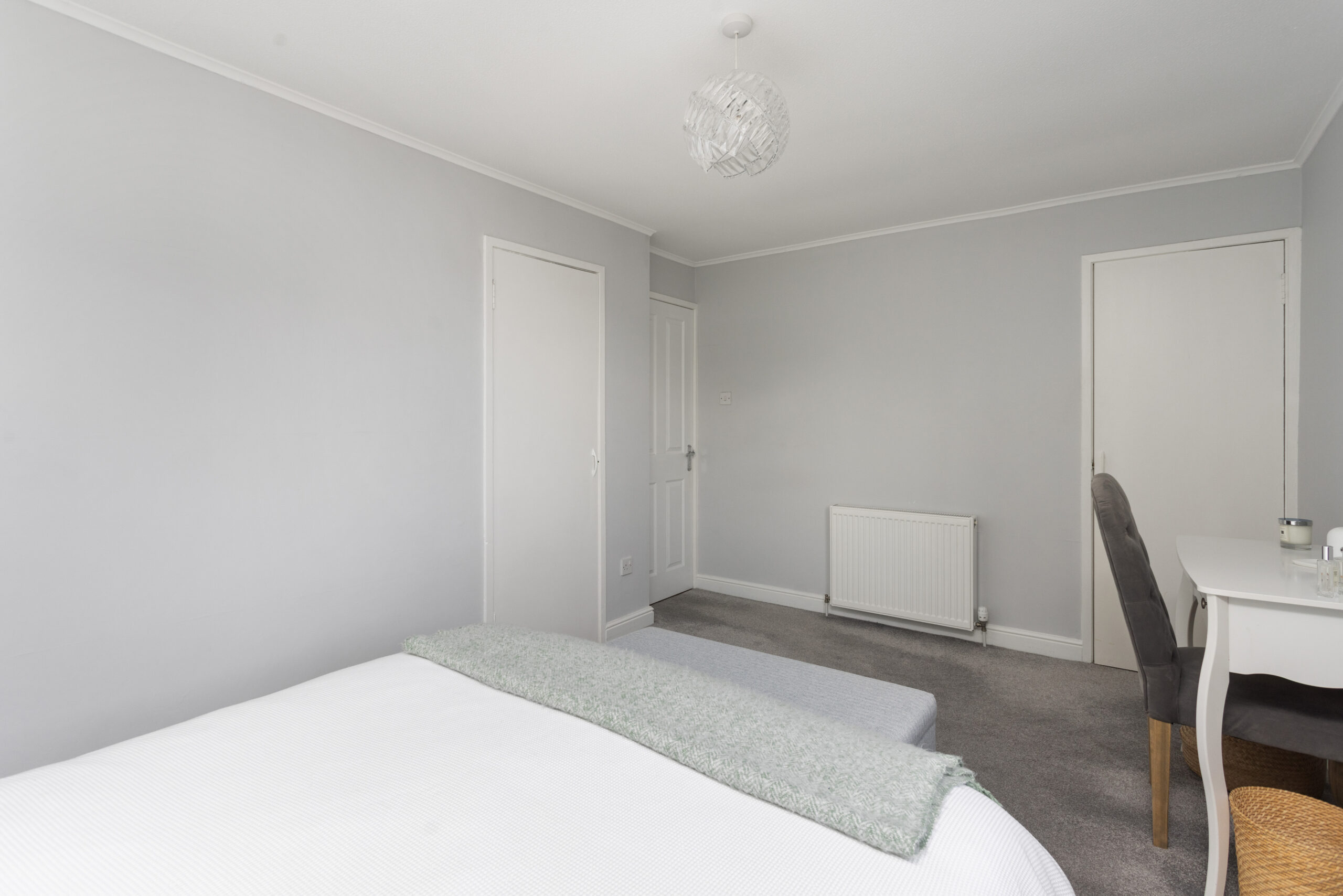 Ascending the carpeted staircase, you're met with two generously sized double bedrooms. The master bedroom is adorned with a fresh, neutral palette and offers extensive storage, while the second bedroom presents a striking navy feature wall, again with a built-in store, both promising peaceful retreats after a long day. Both rooms enjoy ample space for additional free-standing furniture along.