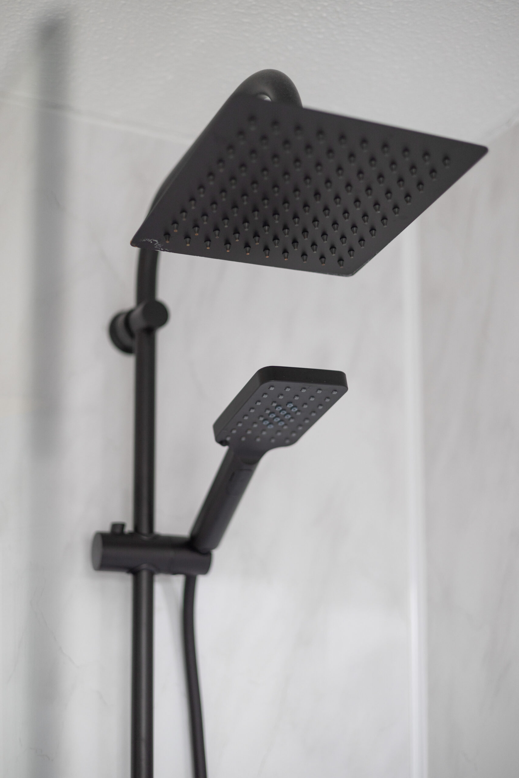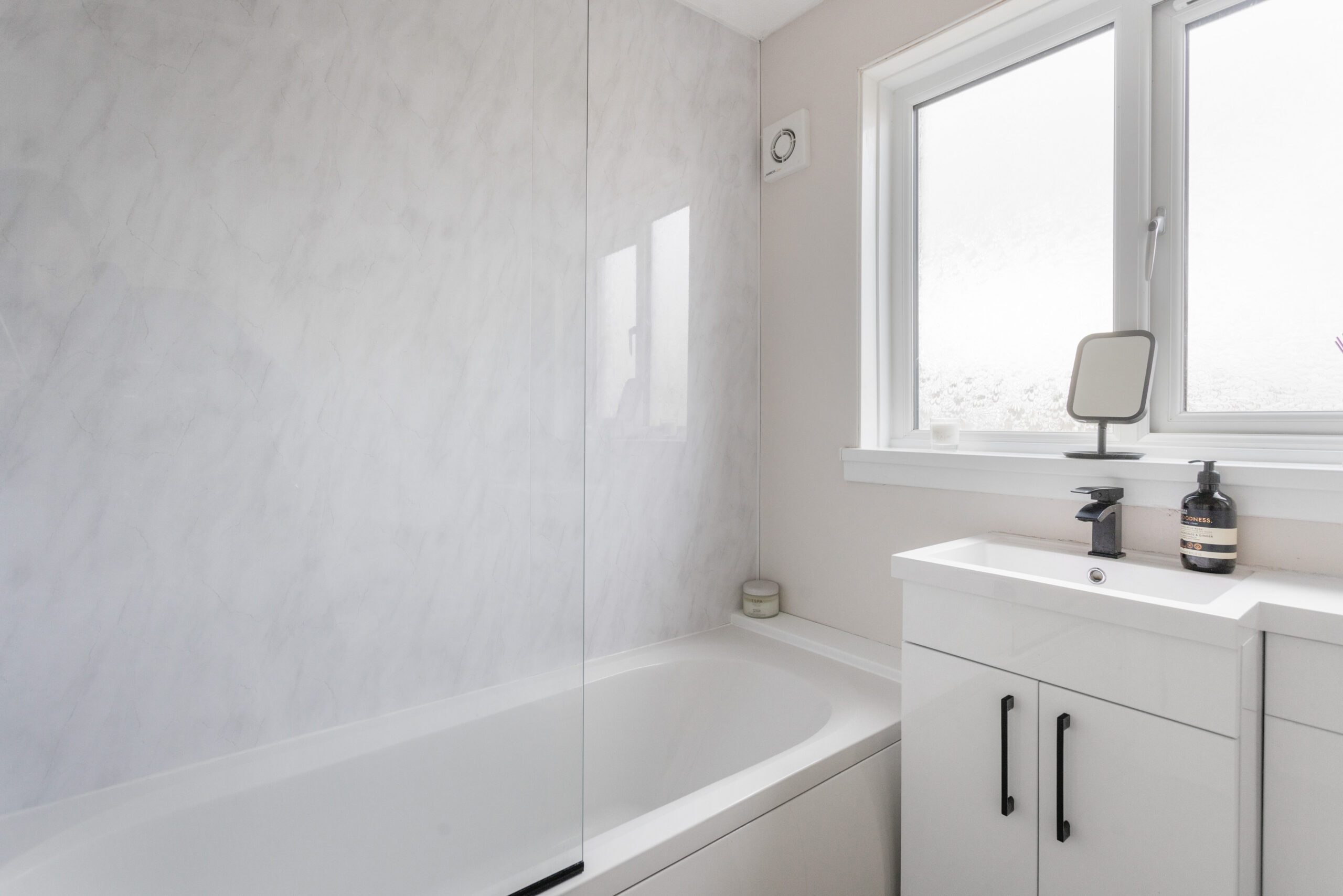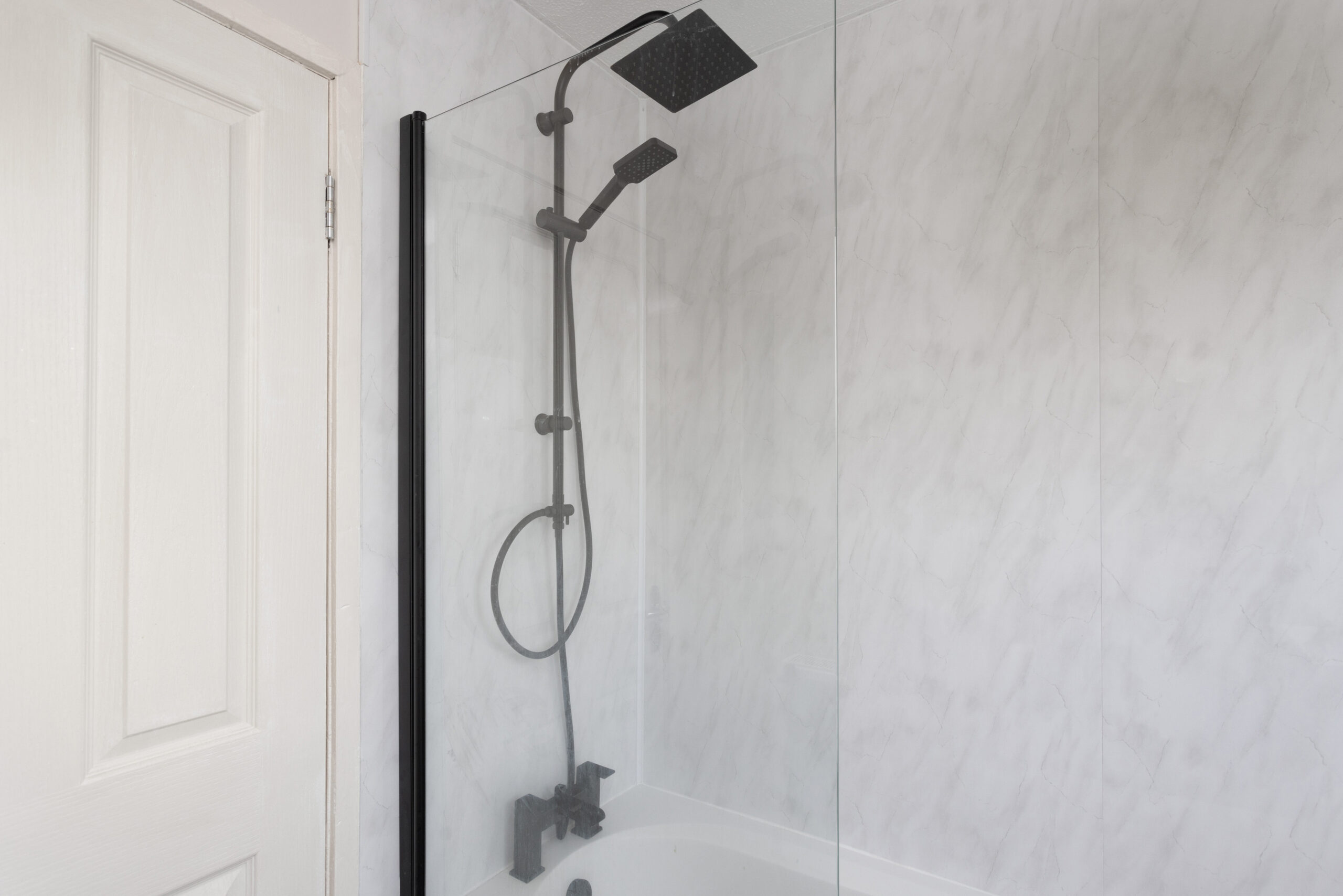 The recently updated bathroom is a chic space, with wet wall panelling, a sleek white bath with a luxurious rainforest shower, and stylish black finishes, all creating a spa-like feel.