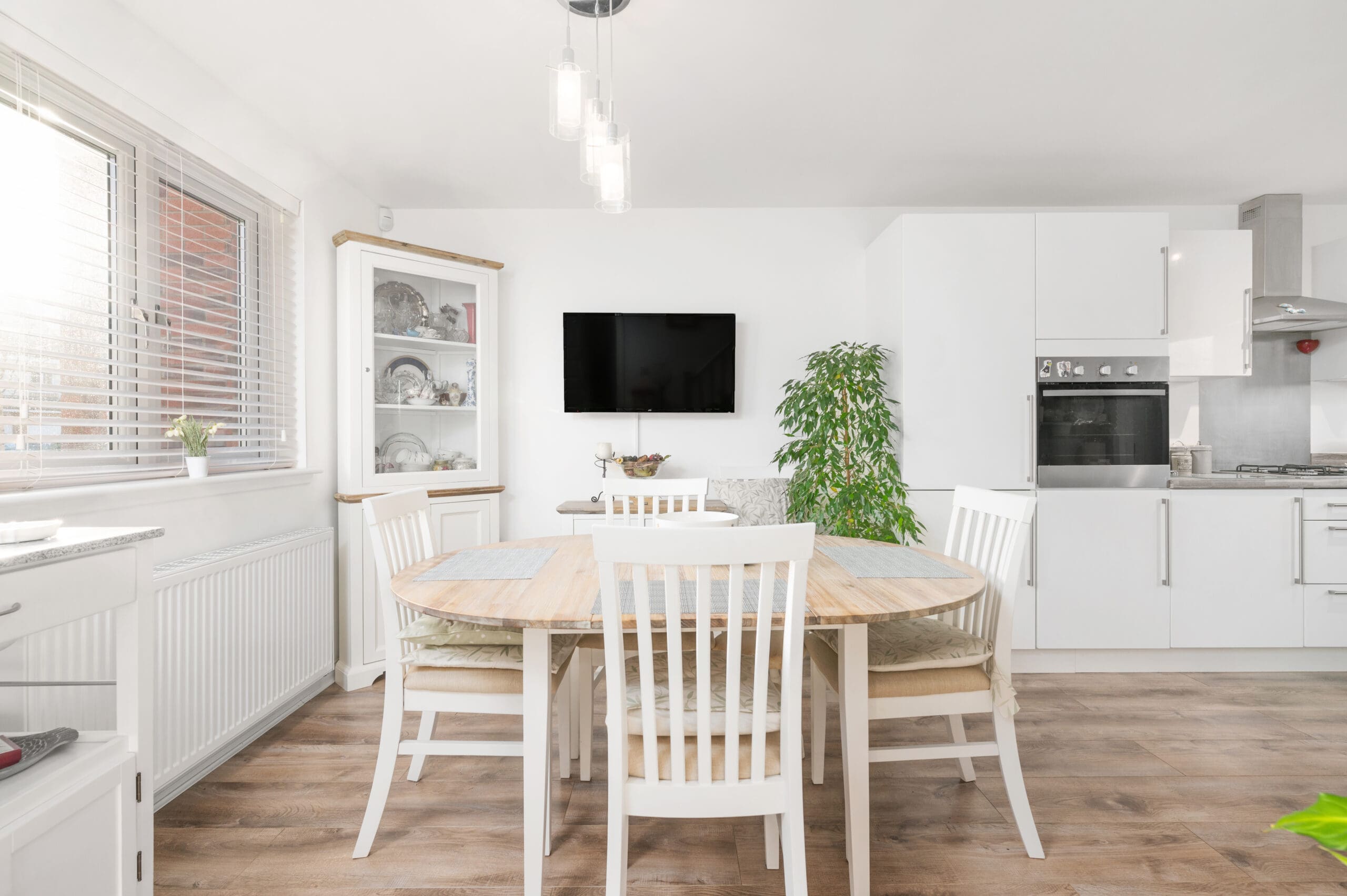 Upon entering the residence, one is greeted by a welcoming exterior with maintenance-free artificial grass, leading into a stunning open-plan kitchen/diner that serves as the heart of the home. The modern kitchen is equipped with sleek white high gloss base and wall units, integrated appliances, and stylish laminate flooring that extends into the utility and lounge area. A handy utility space offers additional convenience, including a free-standing washer and dryer. The utility area provides access to the rear garden and the conveniently located cloakroom with white w.c and sink.