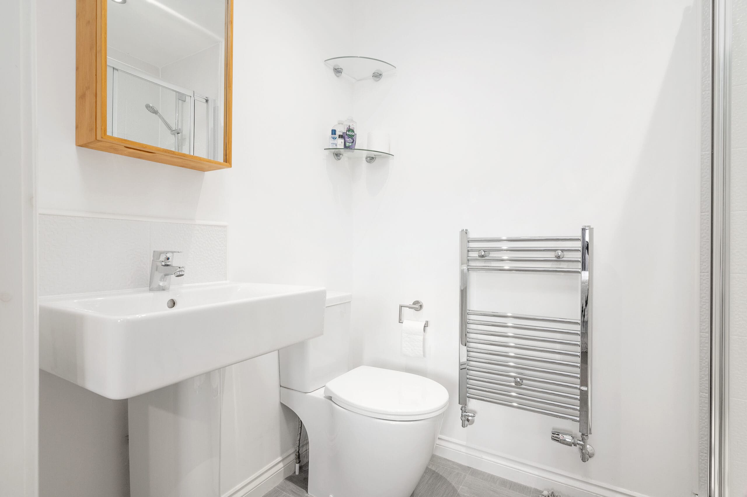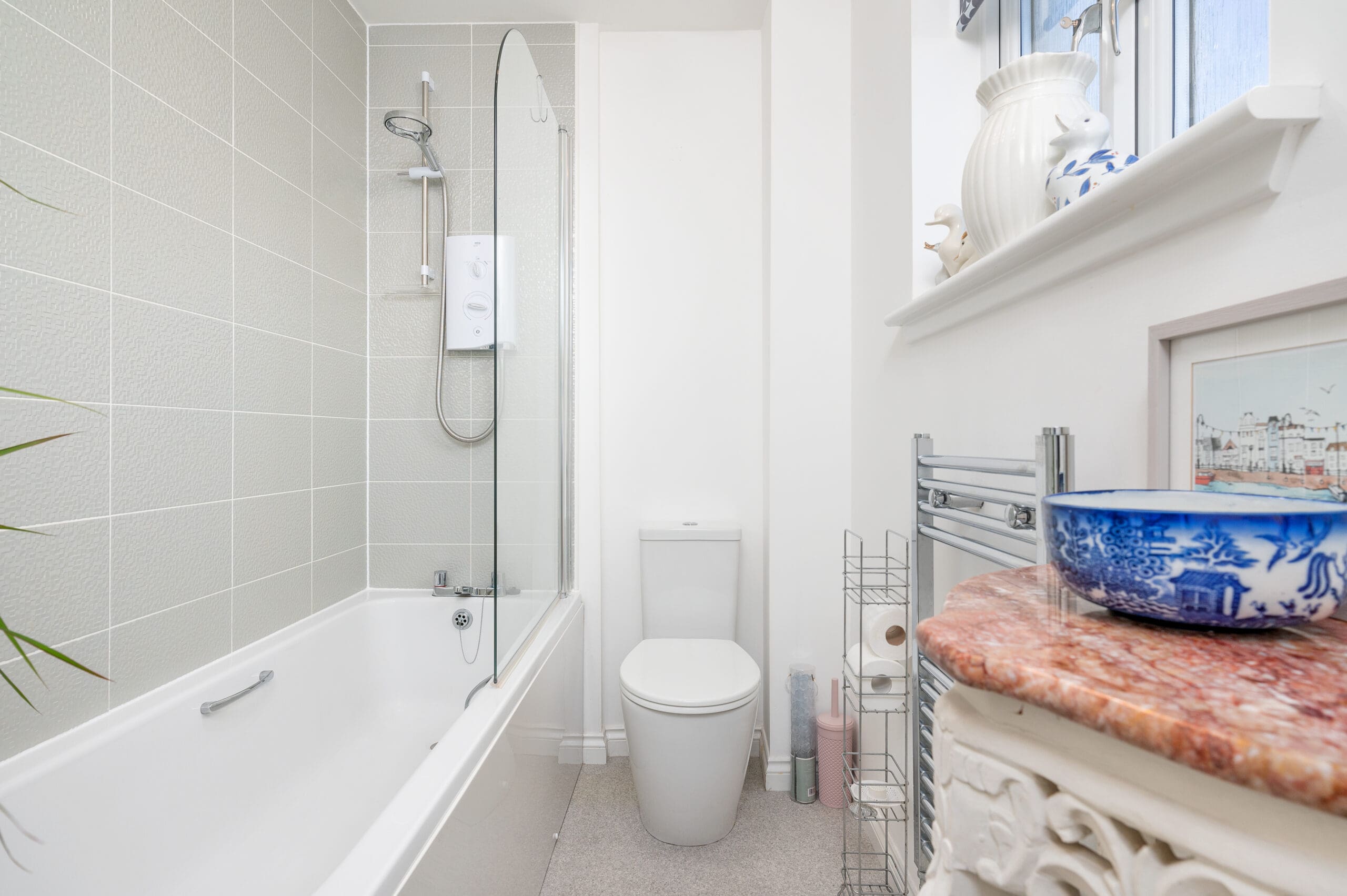 A family bathroom featuring a white three-piece suite with a shower above, tasteful grey textured tiling, and a heated stainless steel towel rail, adds to the appeal.