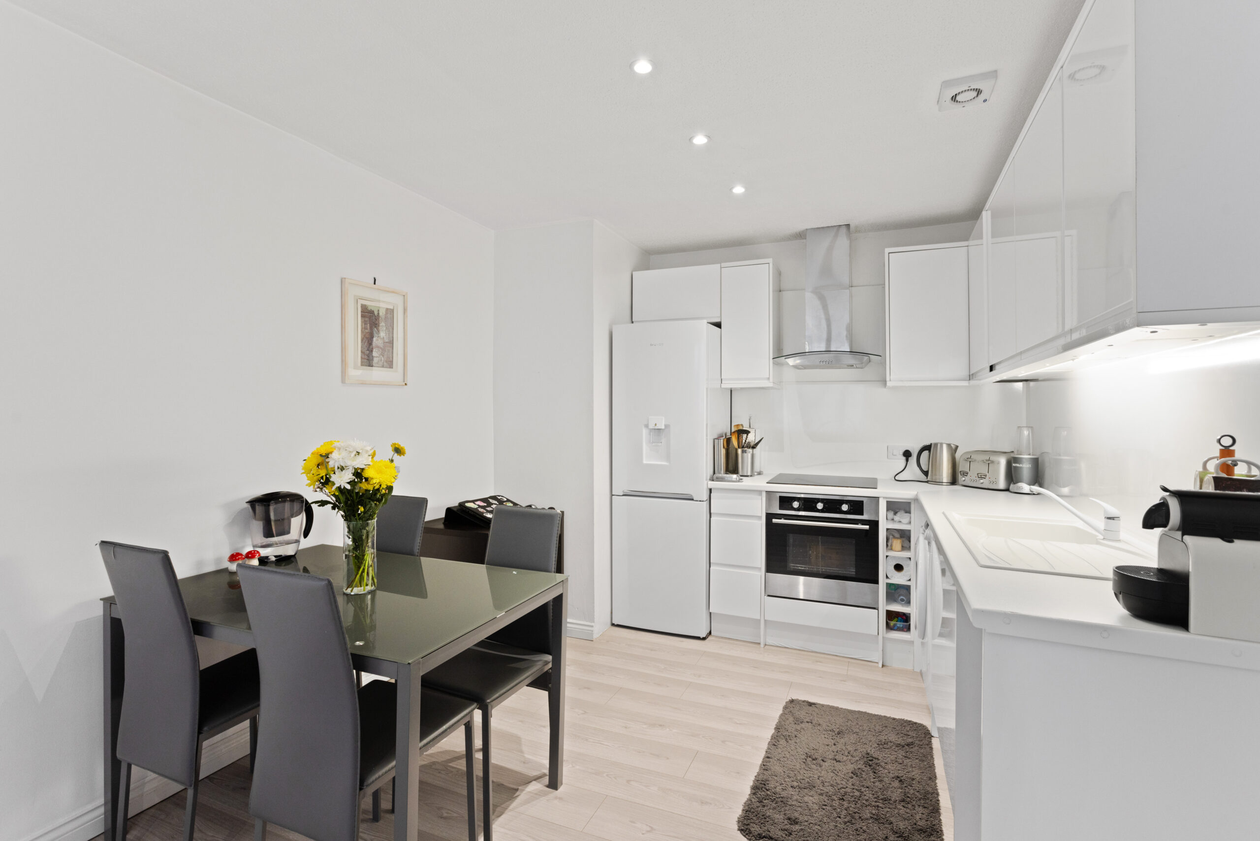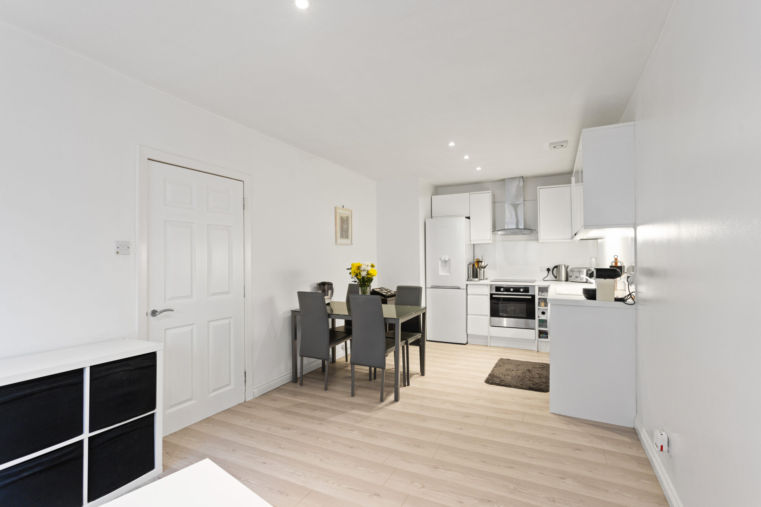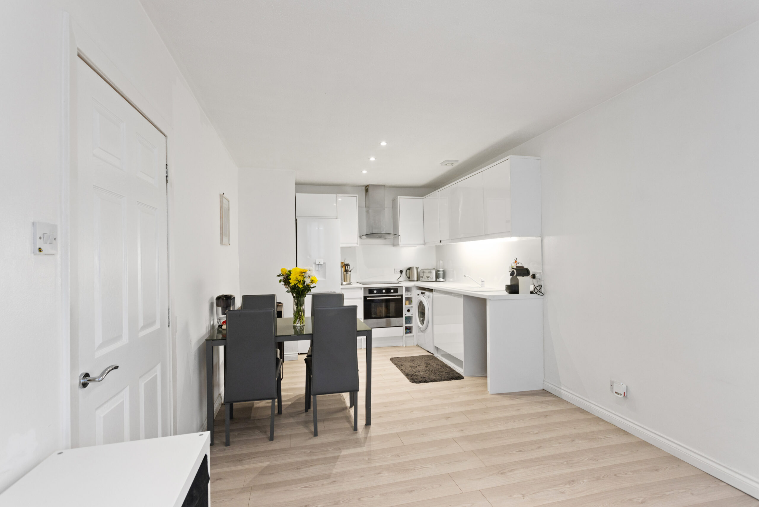 The open-plan lounge, kitchen, and diner form a contemporary space perfect for both entertaining and unwinding. The kitchen area boasts sleek white high gloss units, an integrated oven and hob with hood, and space for a free-standing washing machine and fridge/freezer which are all included in the sale. The dining area accommodates a sizeable table and chairs, while the lounge area, bathed in natural light, invites relaxation.