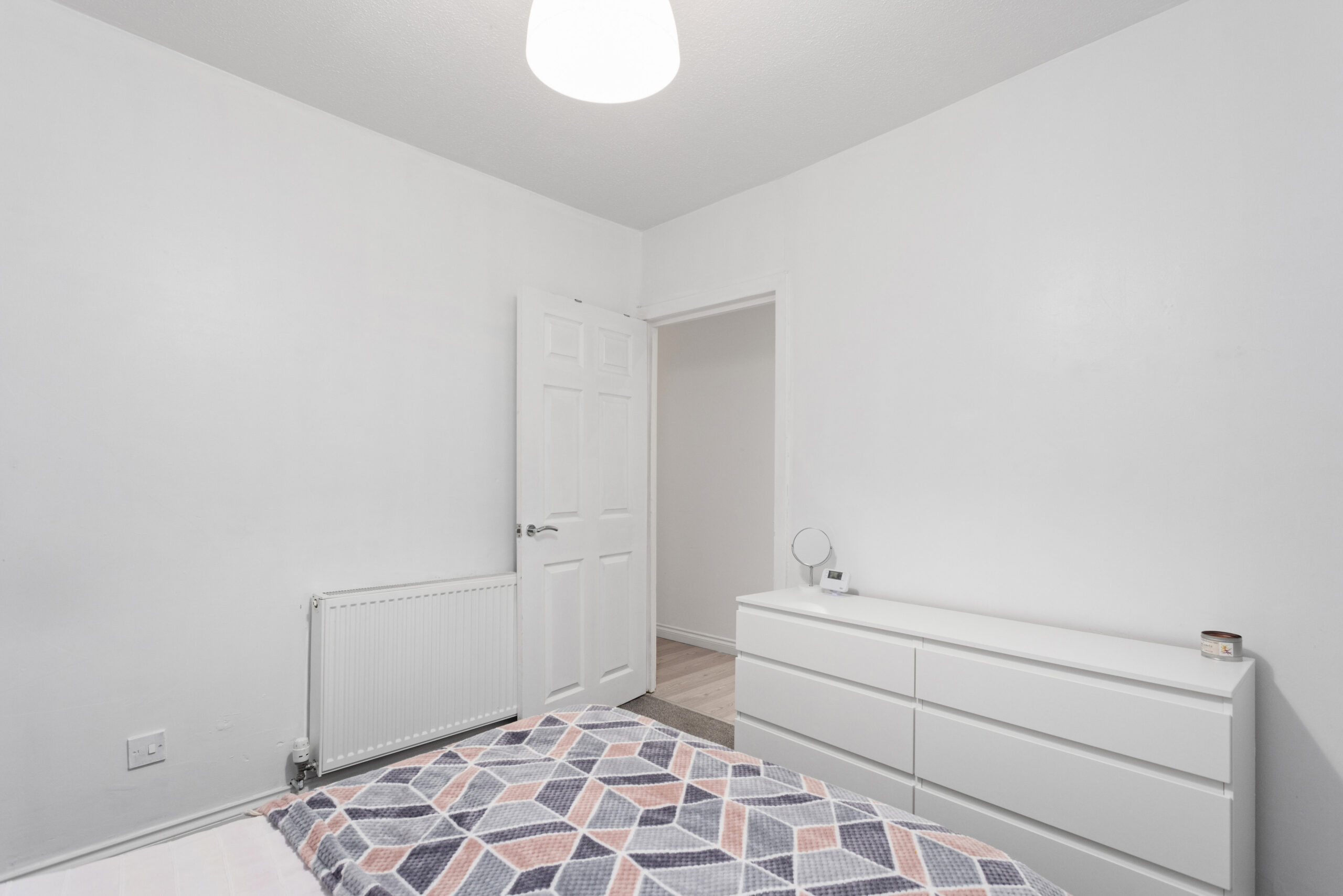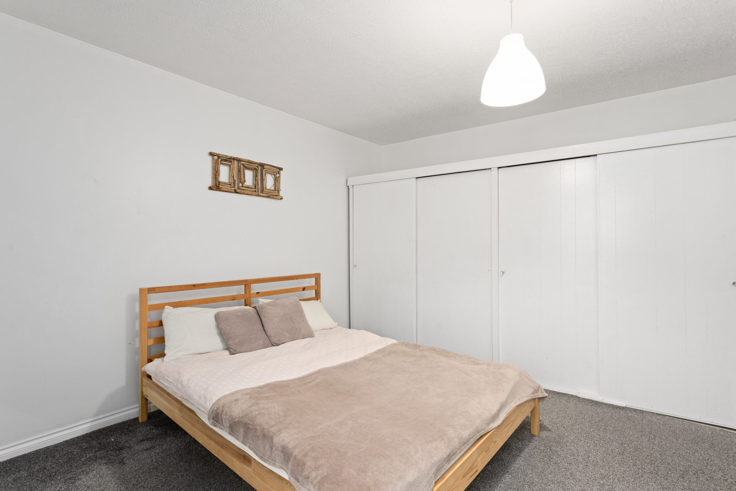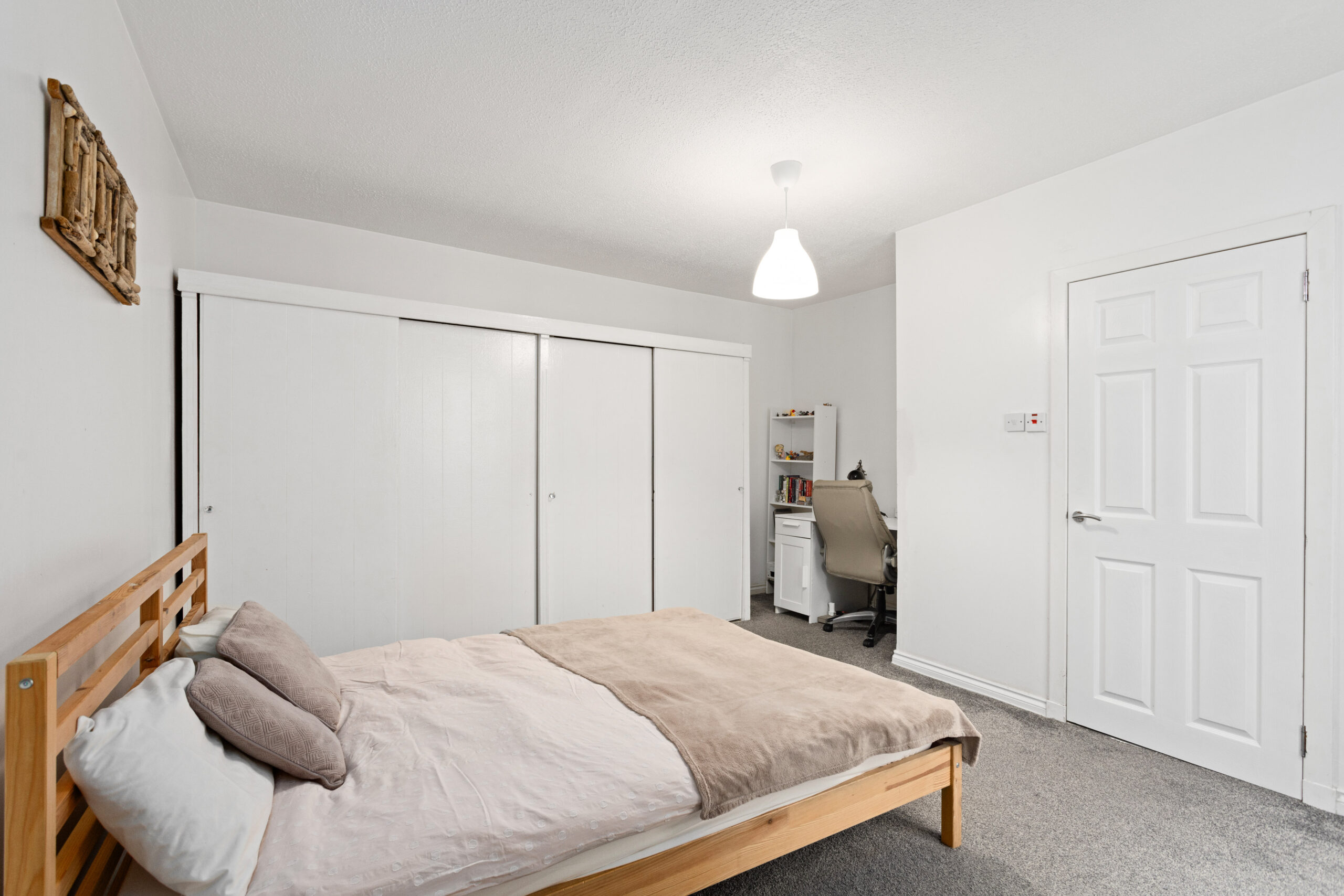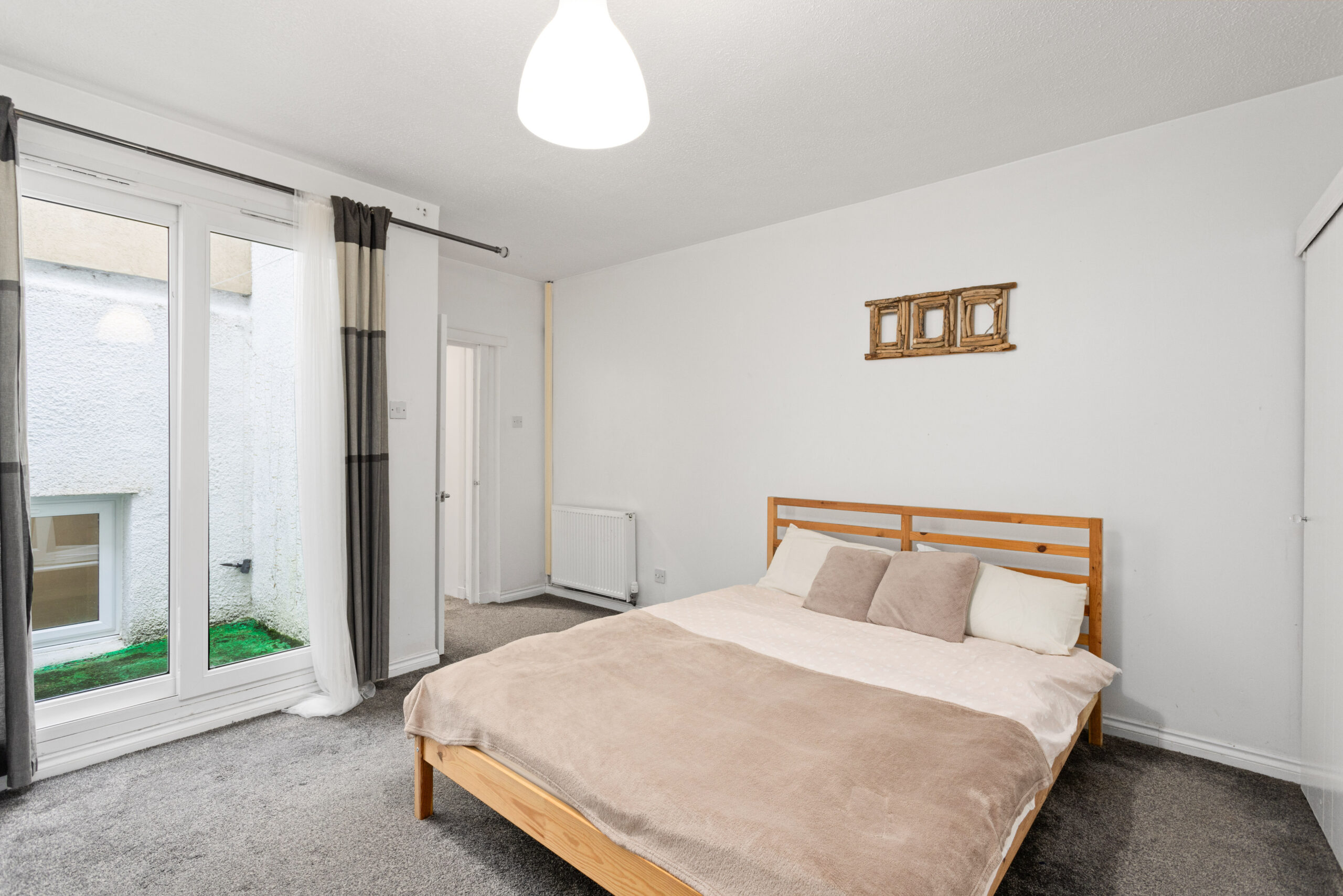 Bedroom 1 is a commodious double with built-in wardrobes, white walls, and plush carpeting, complete with an en suite shower room and exclusive access to a private small courtyard. The second bedroom, also well-proportioned, can easily fit a double bed and free-standing furniture.