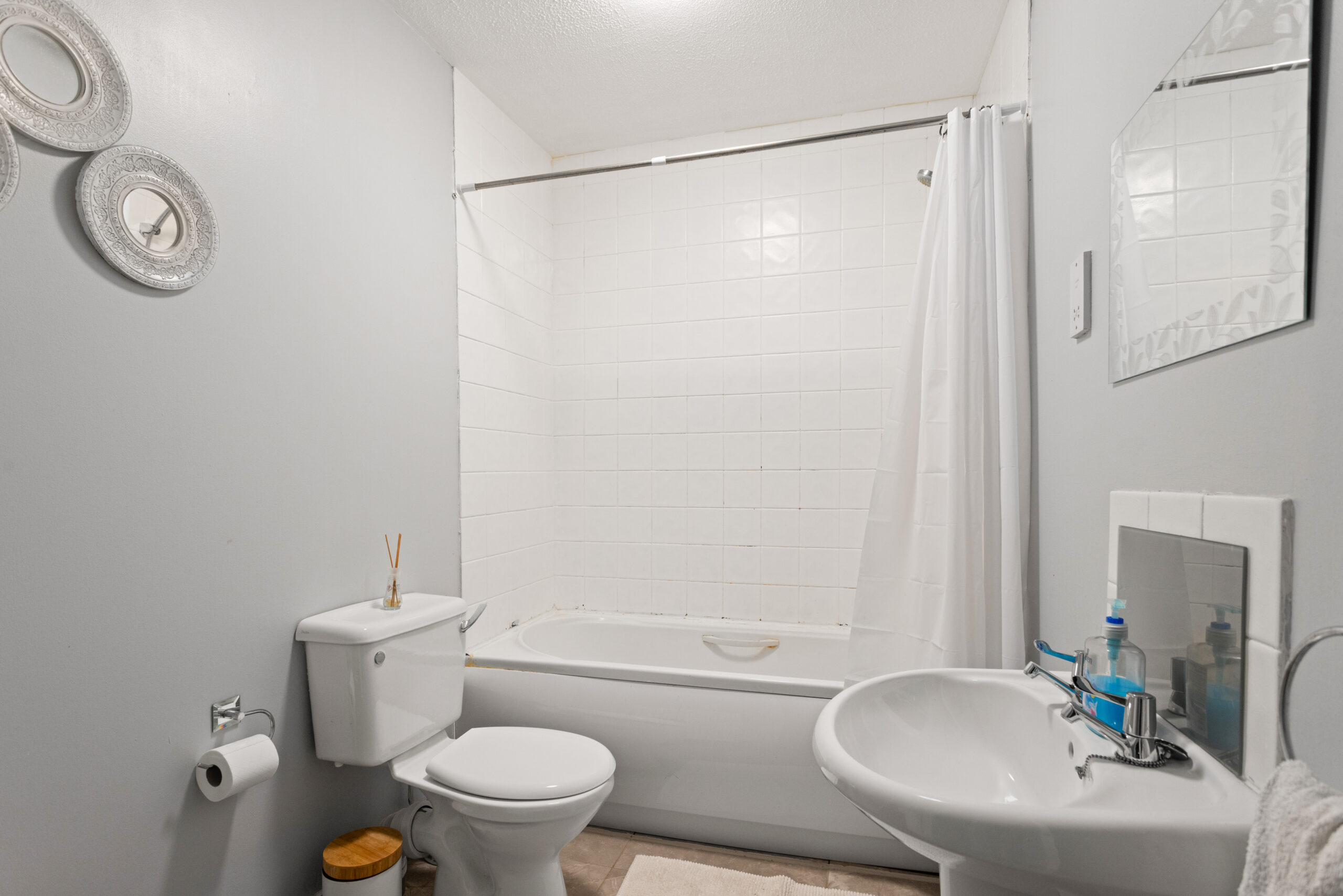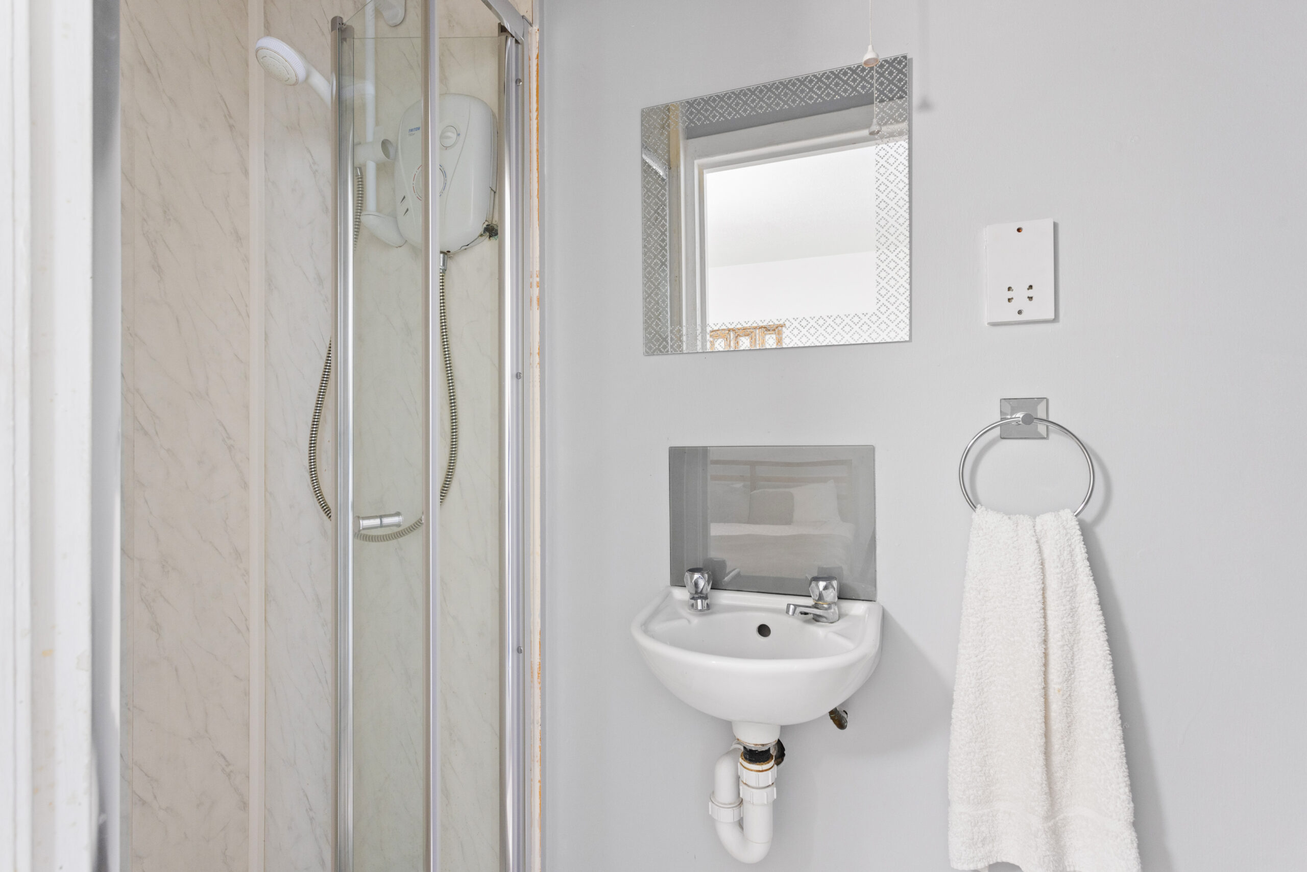 The family bathroom features a white three-piece suite with a shower over the bath, complete with white splashback tiling and a tiled floor.