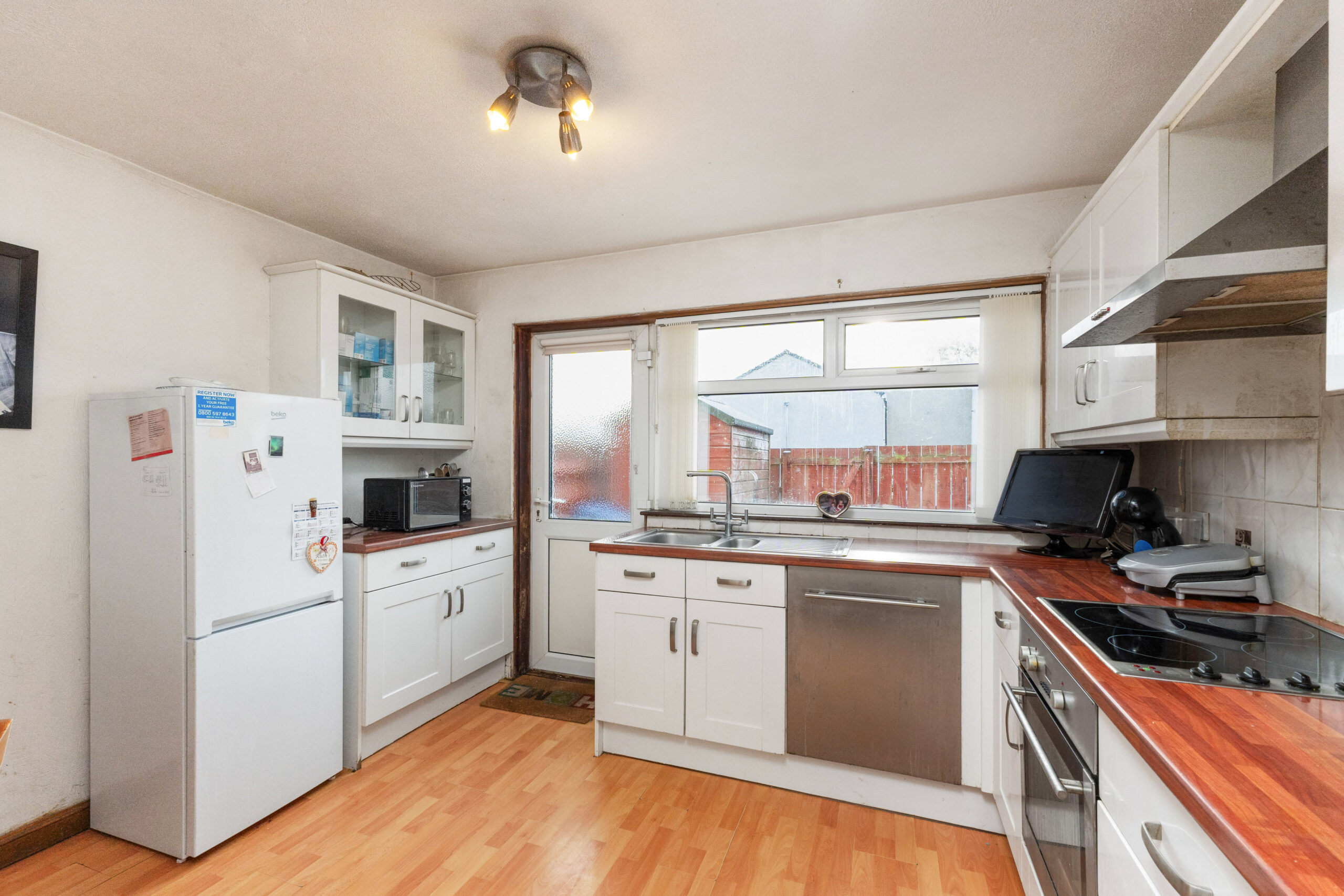 The practical kitchen awaits with its generous worktop space, an assortment of base and wall units, and room for casual dining, while a door conveniently opens out to the low-maintenance, fully enclosed rear garden, complete with a handy garden shed.