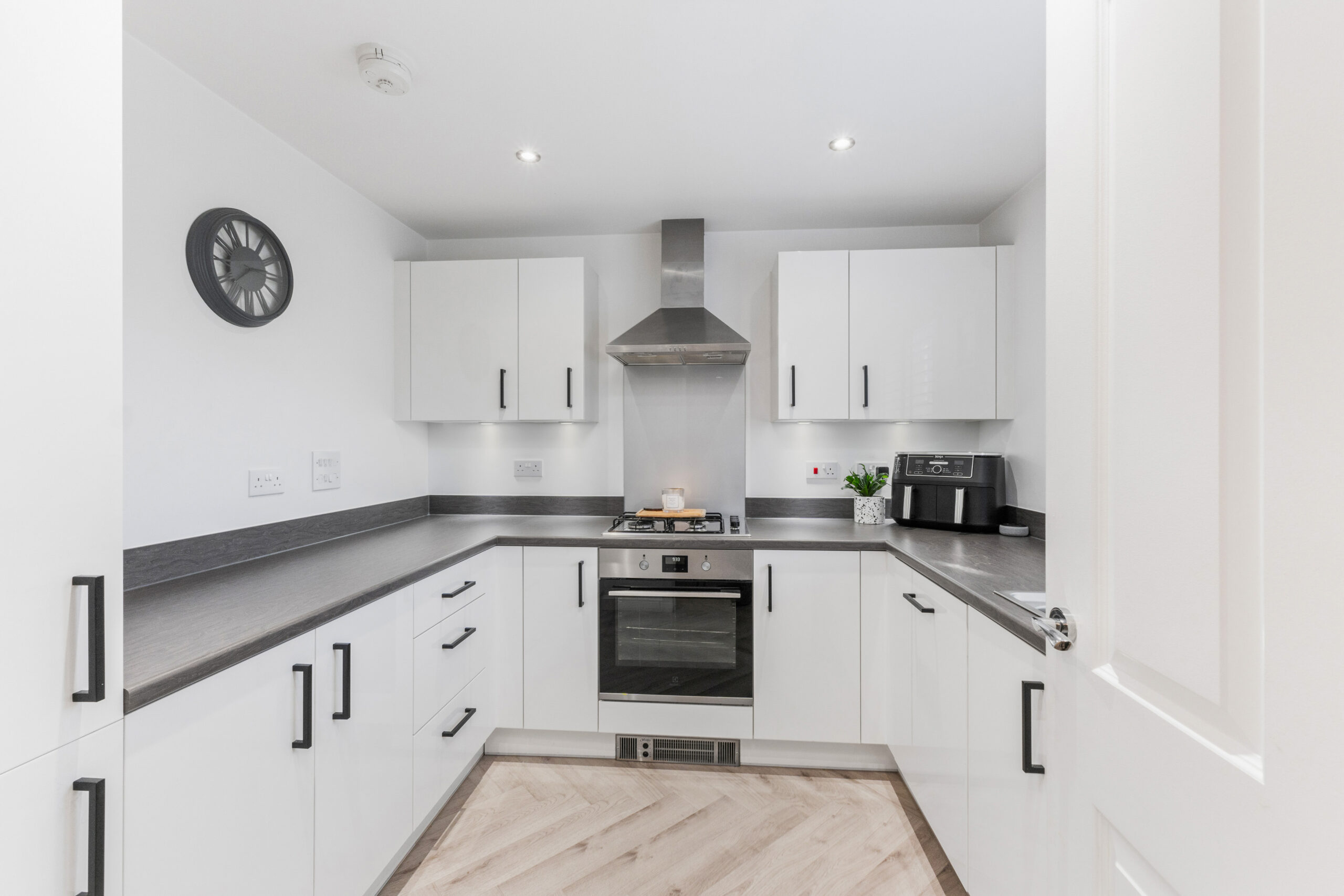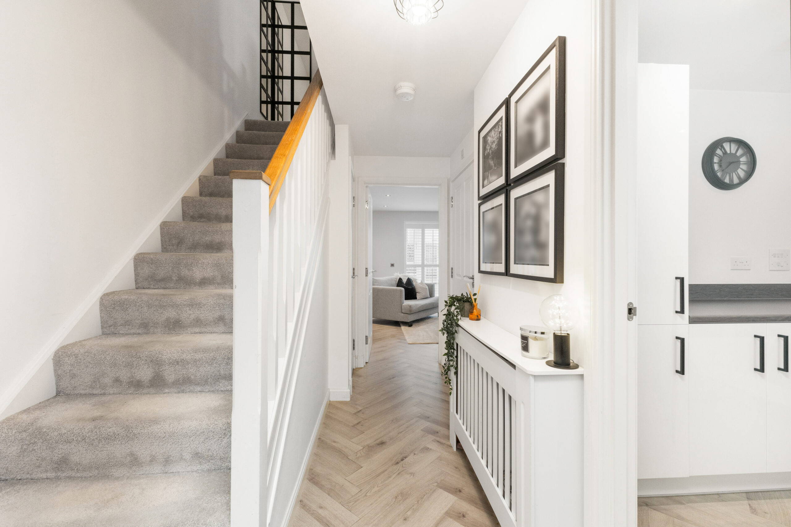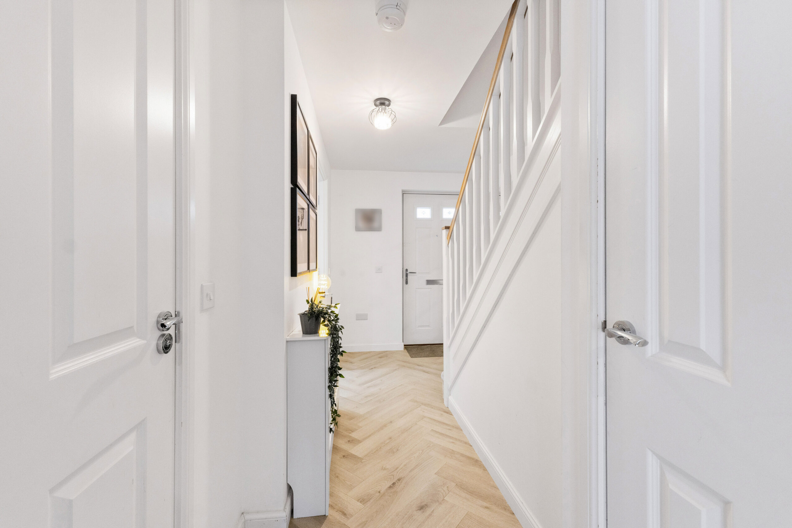 As you step inside, you are greeted by an impressive hallway, finished in soft neutral tones and complemented by a striking herringbone floor that flows throughout the ground floor. The hallway leads to the kitchen, a spacious lounge/diner, and a convenient cloakroom. The staircase takes you to the upper landing where the bedrooms and family bathroom are located.