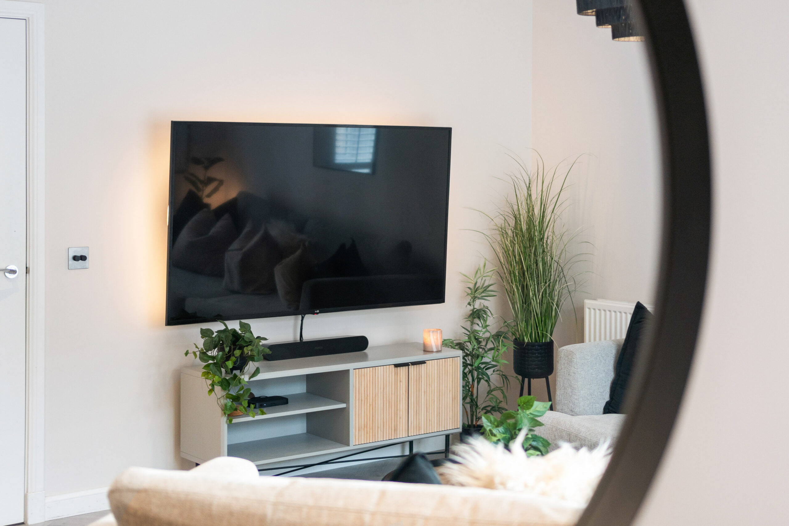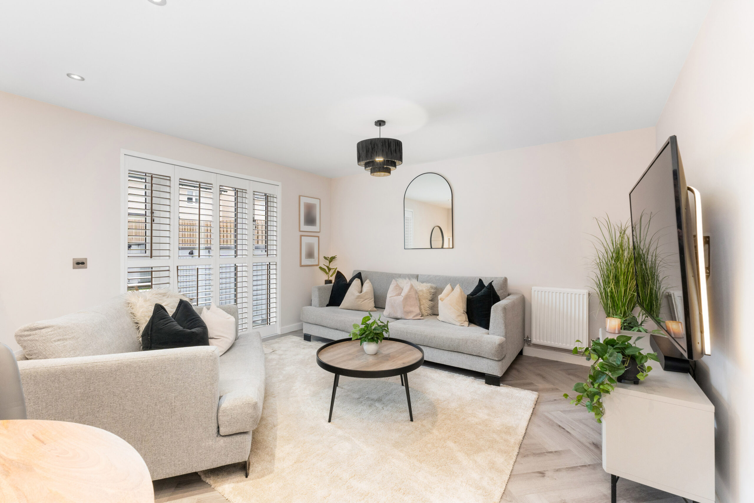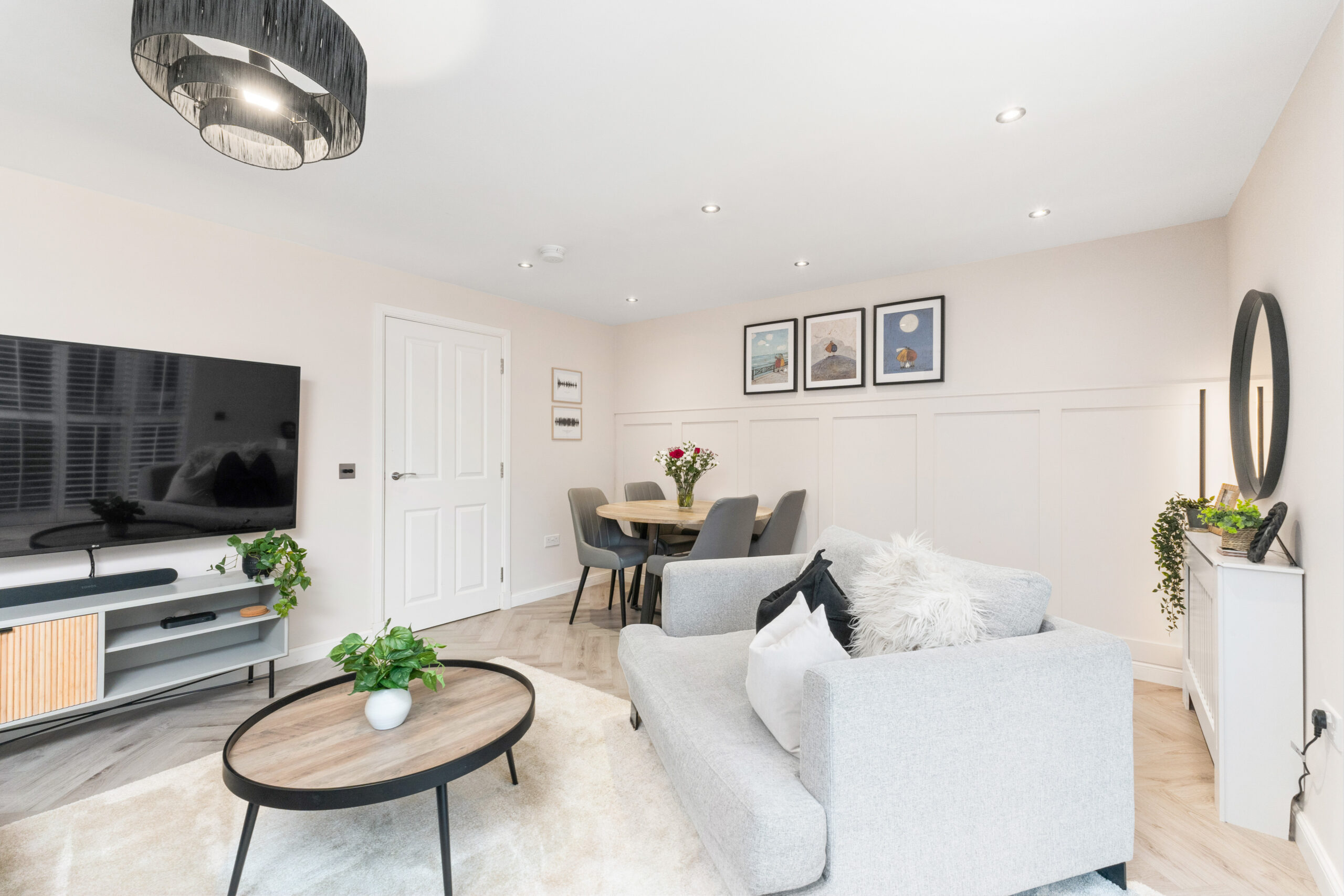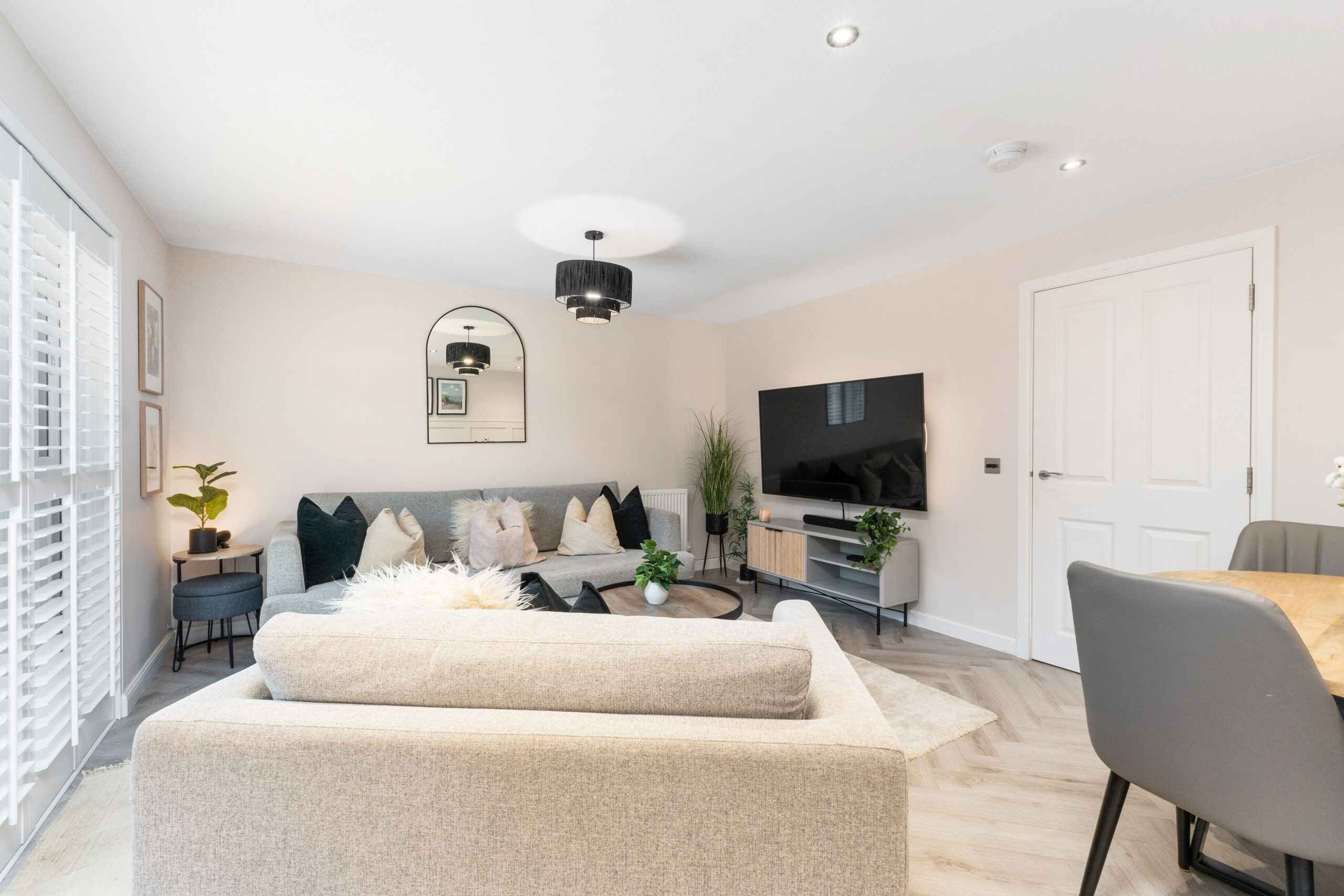 The kitchen is a masterpiece of modern design, featuring chic white high-gloss base and wall units, integrated appliances, and sleek black finishes. This space is as stylish as it is functional. The spacious lounge/diner overlooks the beautifully landscaped rear garden. The room is enhanced by a gorgeous, panelled feature wall and soft, neutral decor, creating a warm and inviting atmosphere-an ideal space to relax, unwind, and host family and friends.