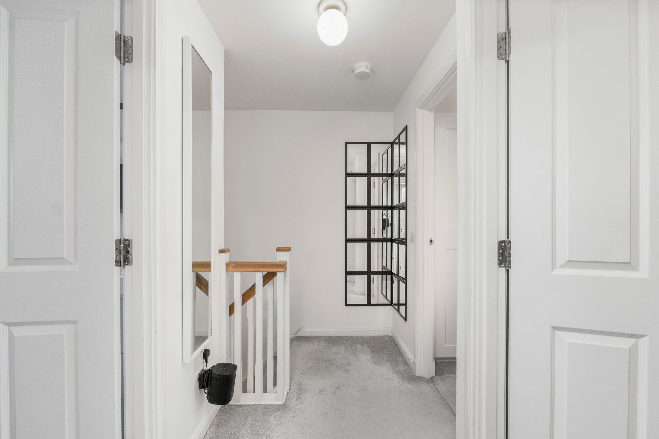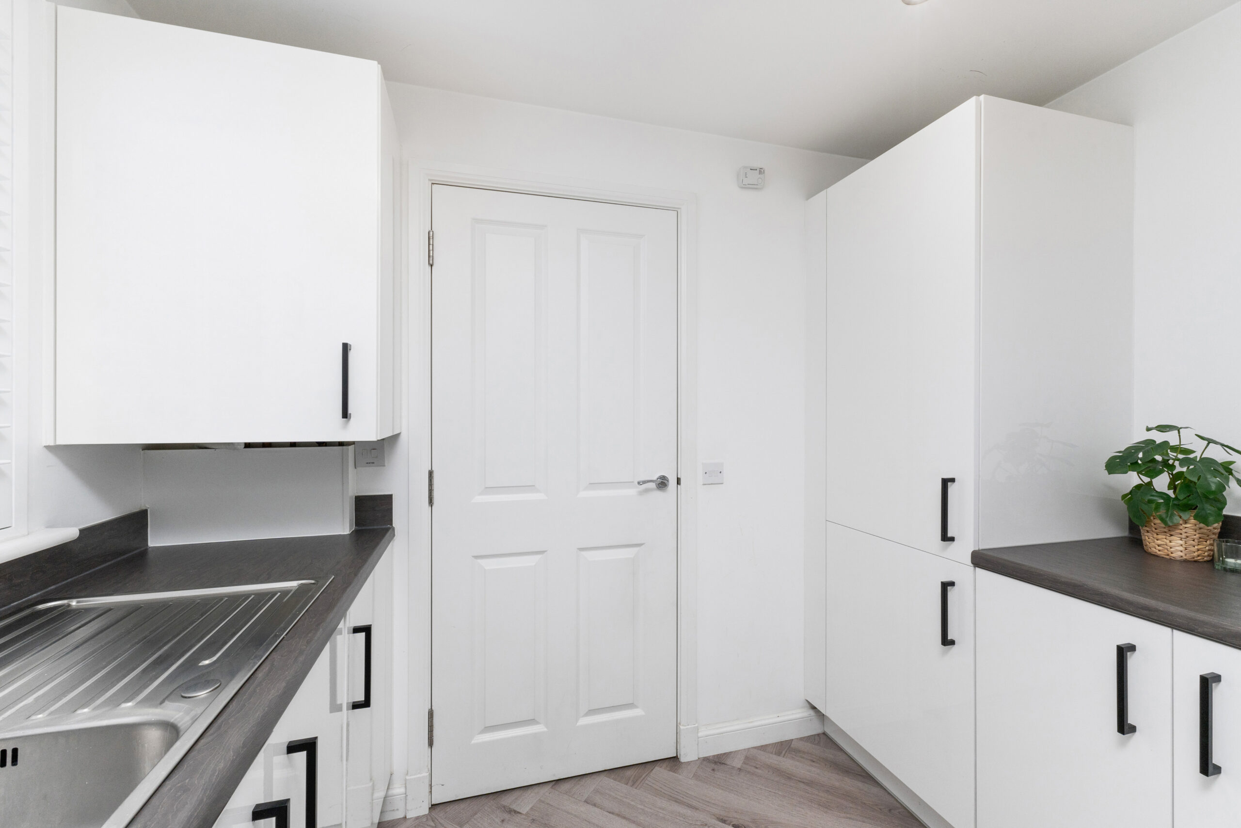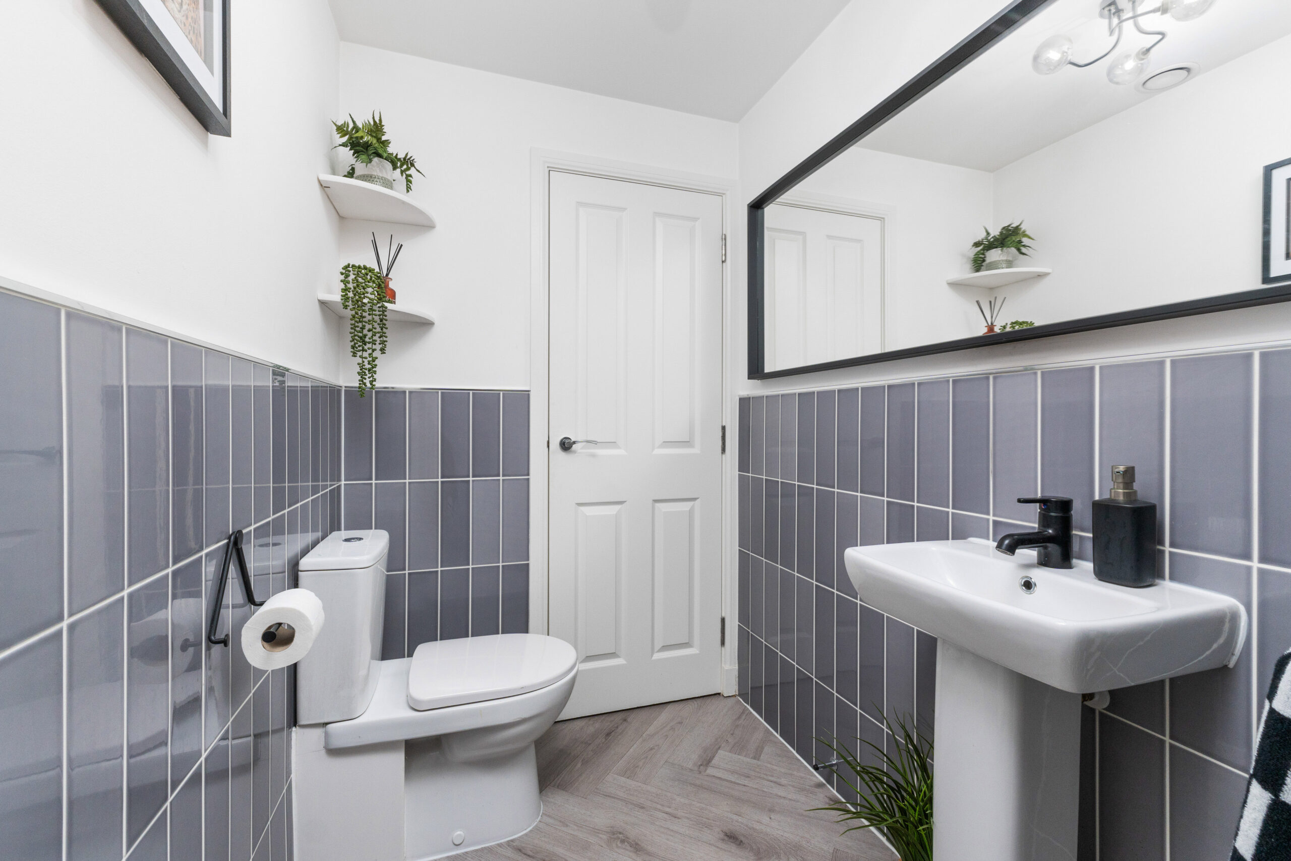 The ground floor also benefits from a handy cloakroom, designed with sleek half-wall tiling, a white WC and sink, and a door leading to a discreet utility store, which is plumbed for a washing machine and features shelving for added convenience.