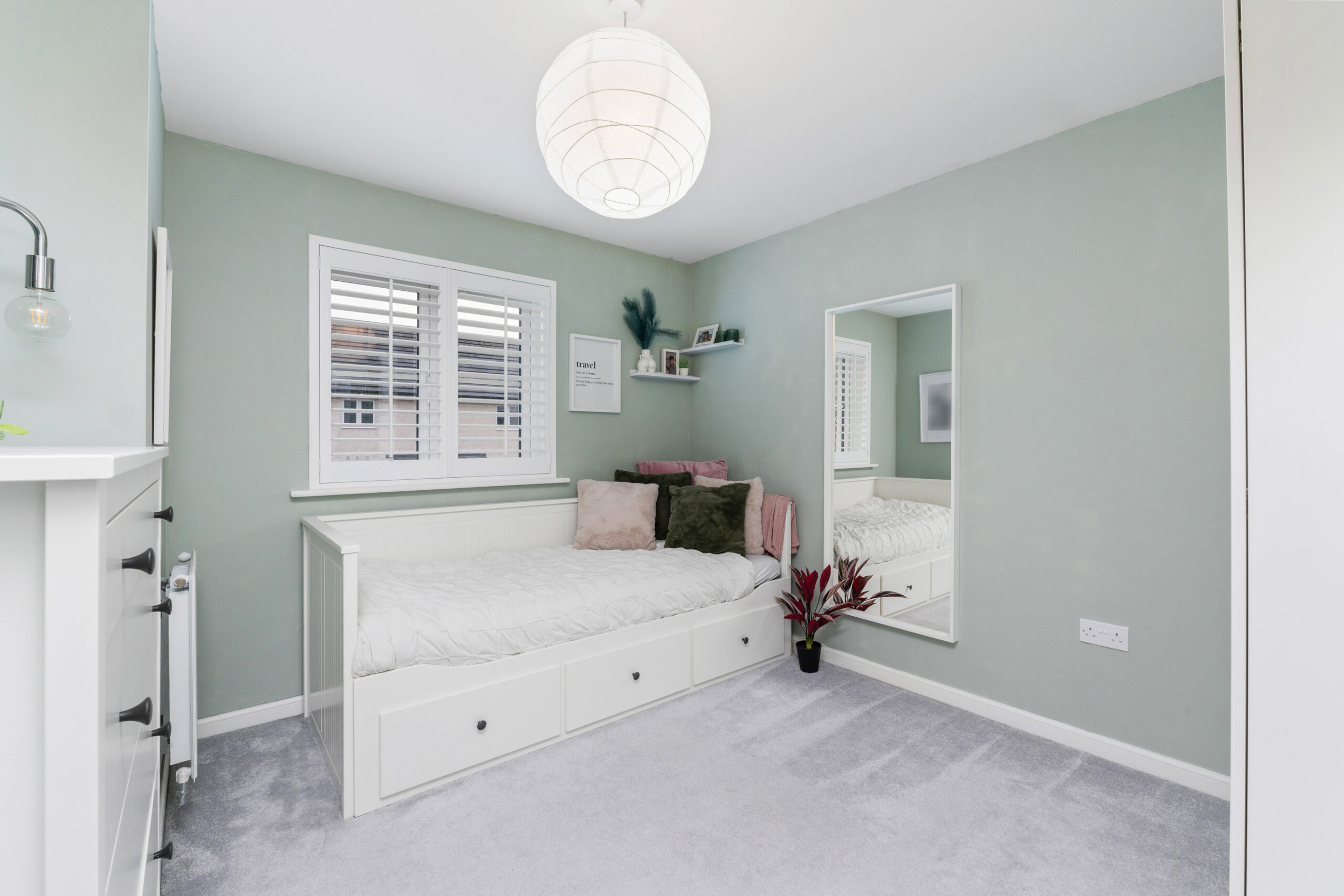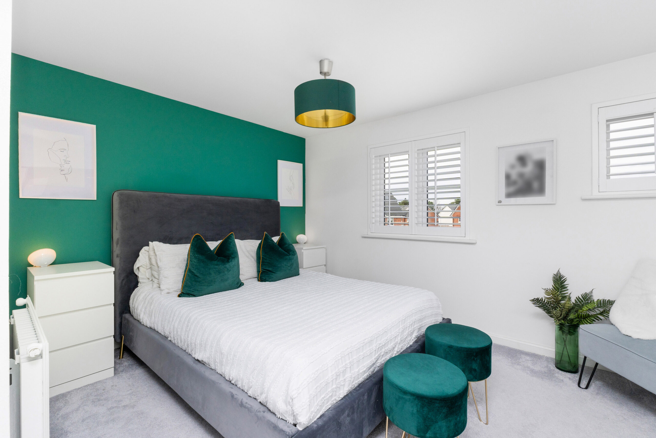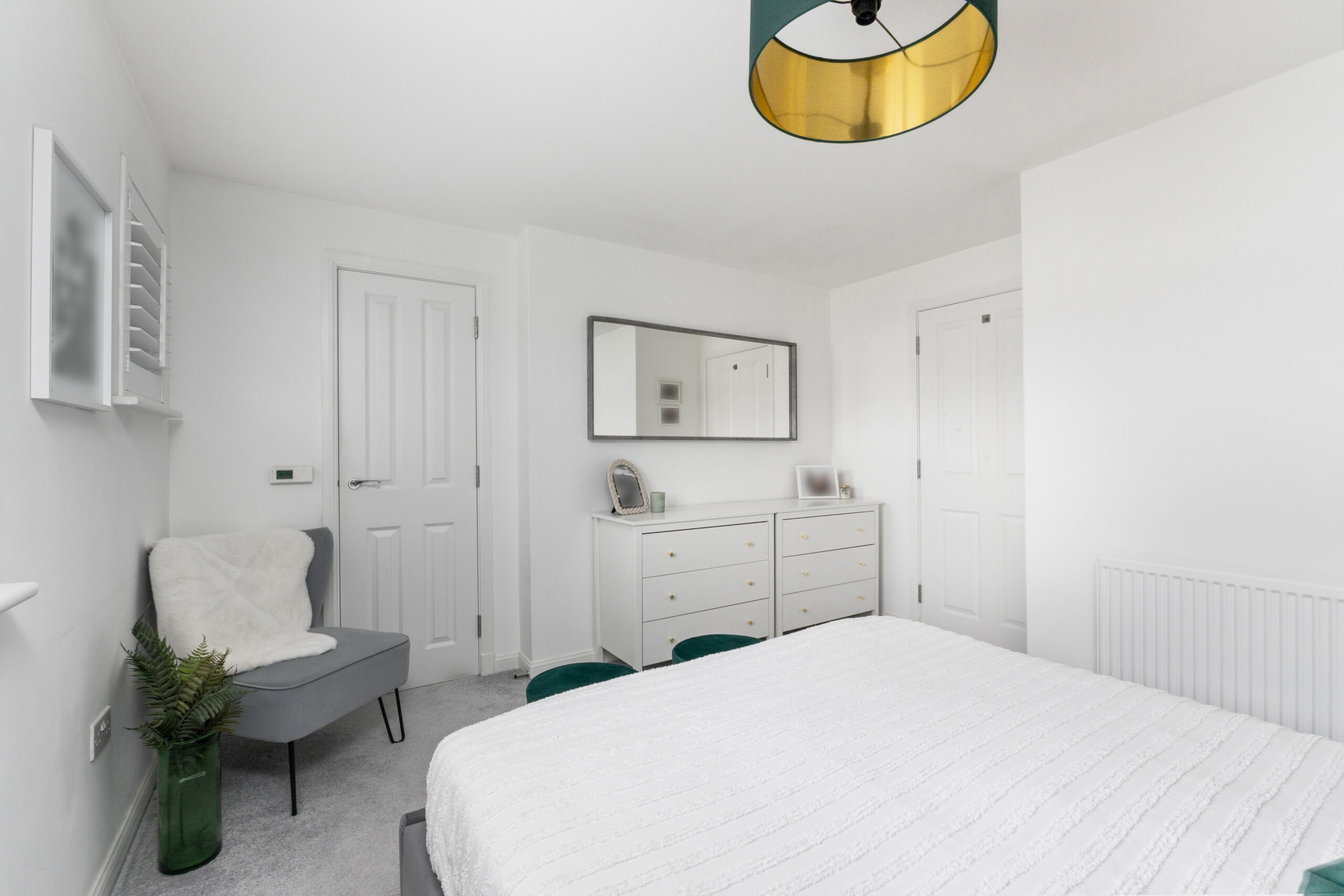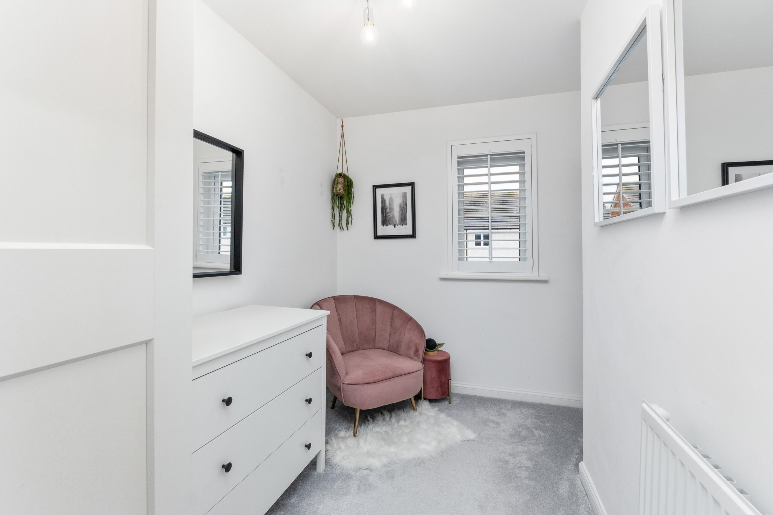 Upstairs, the home continues to impress with three well-appointed bedrooms, all fitted with plush carpeting for added comfort. The principal bedroom is beautifully finished in a fresh, neutral palette and boasts a fabulous walk-in wardrobe, along with additional space for free-standing furniture. Bedroom two is a generous double, decorated in a soft pastel green, creating a serene and relaxing ambiance. Bedroom three, a spacious single, offers a lovely view of the landscaped garden, making it a perfect space for a child's bedroom or a home office.