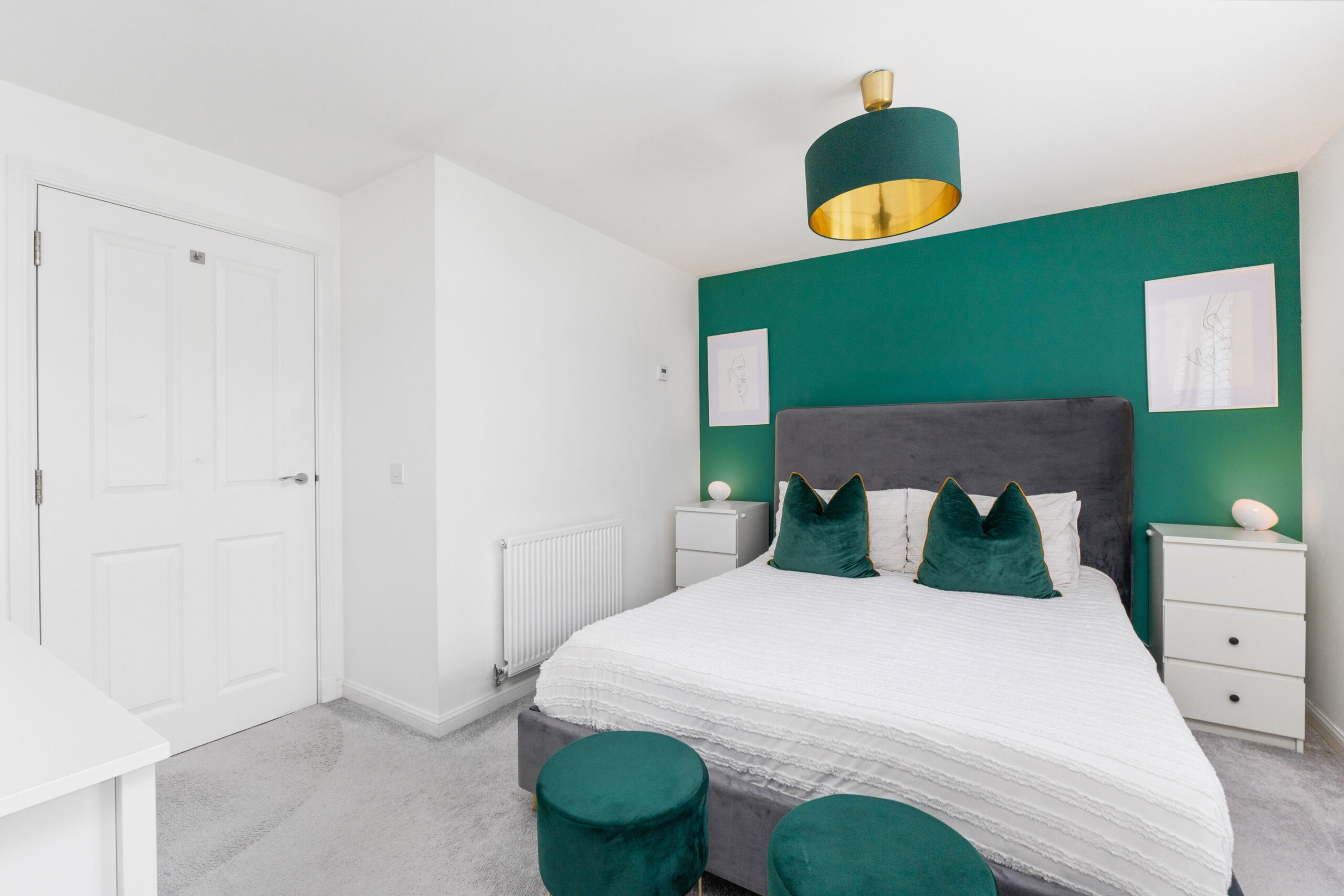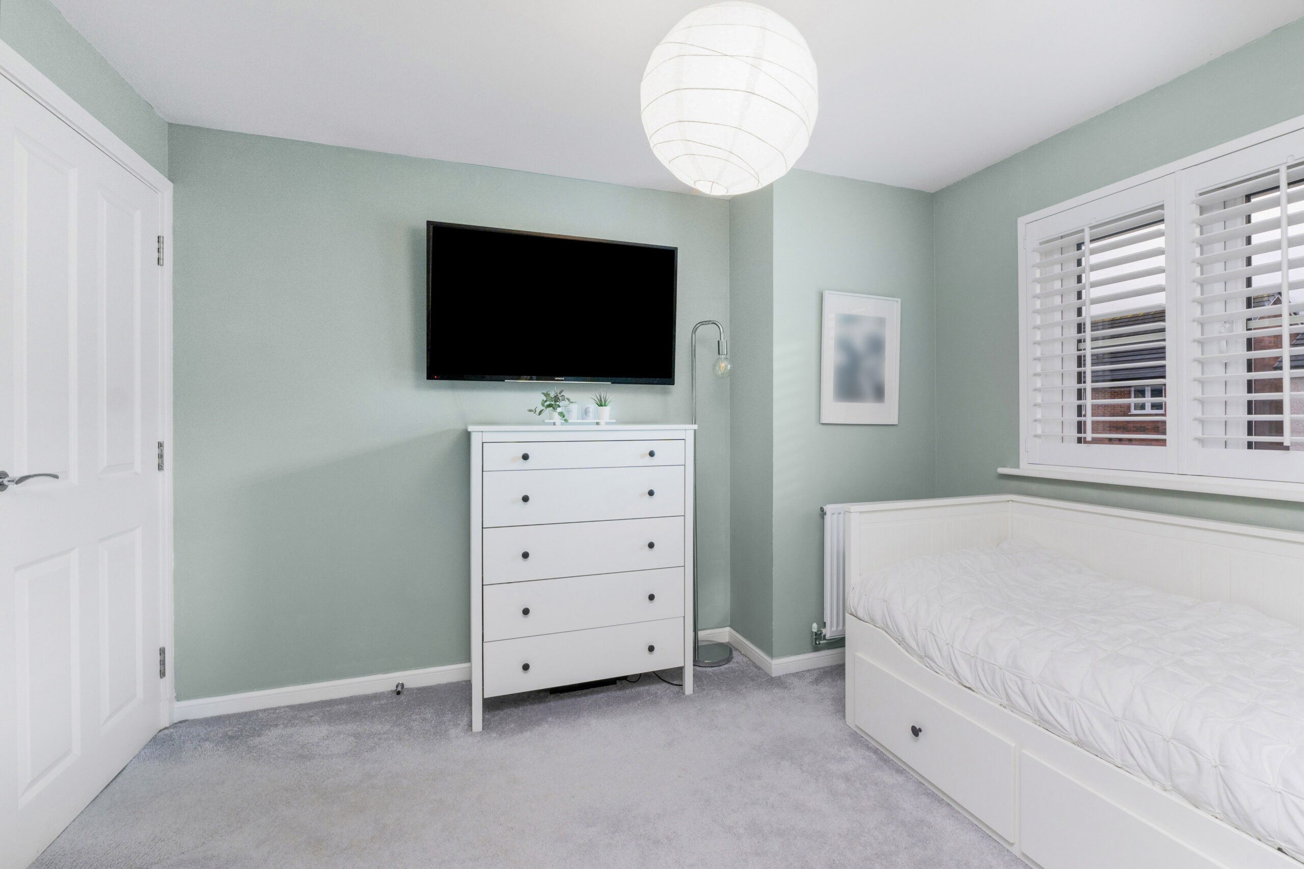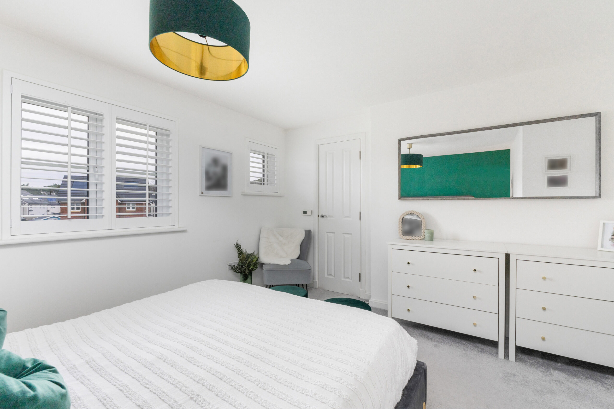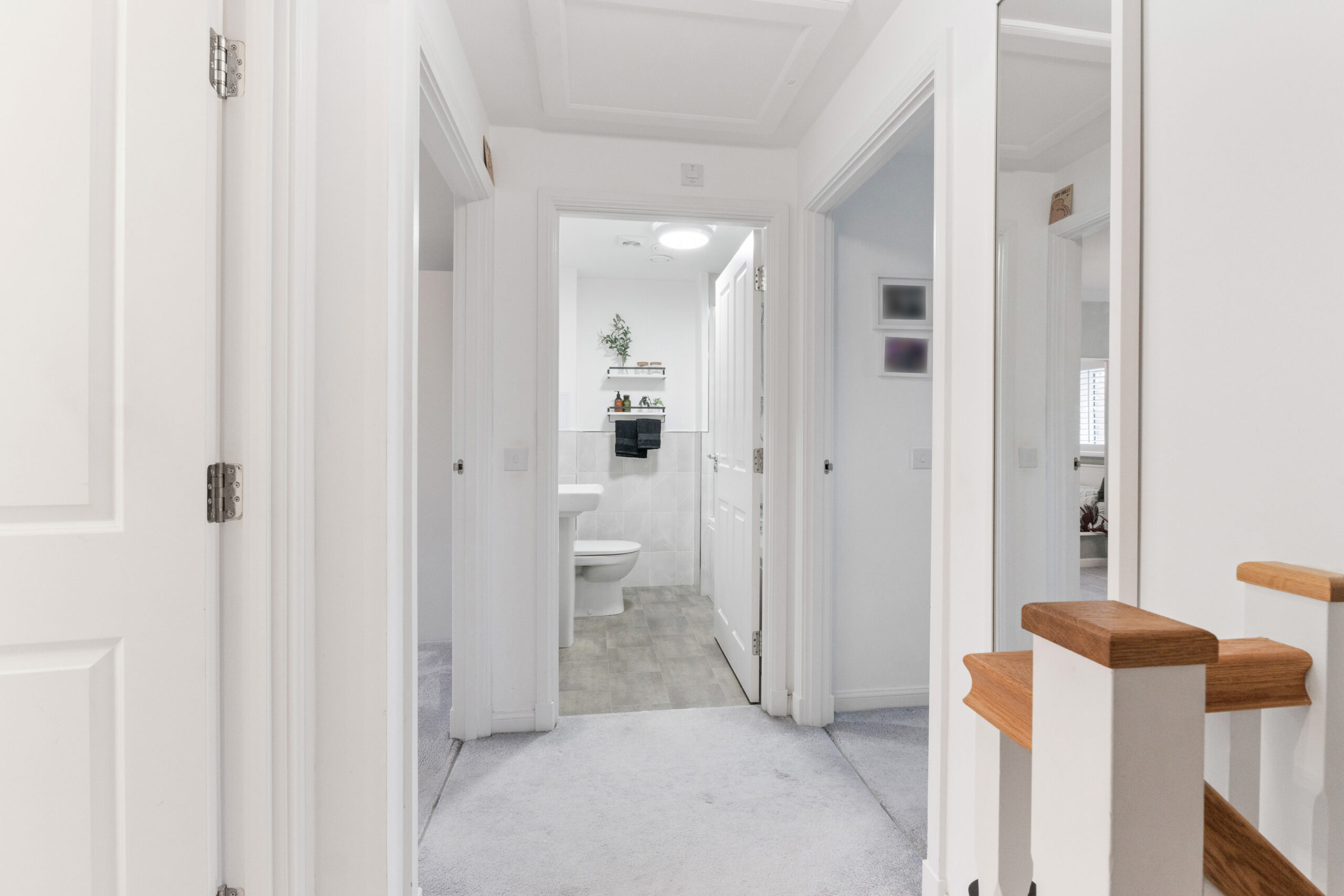 Upstairs, the home continues to impress with three well-appointed bedrooms, all fitted with plush carpeting for added comfort. The principal bedroom is beautifully finished in a fresh, neutral palette and boasts a fabulous walk-in wardrobe, along with additional space for free-standing furniture. Bedroom two is a generous double, decorated in a soft pastel green, creating a serene and relaxing ambiance. Bedroom three, a spacious single, offers a lovely view of the landscaped garden, making it a perfect space for a child's bedroom or a home office.