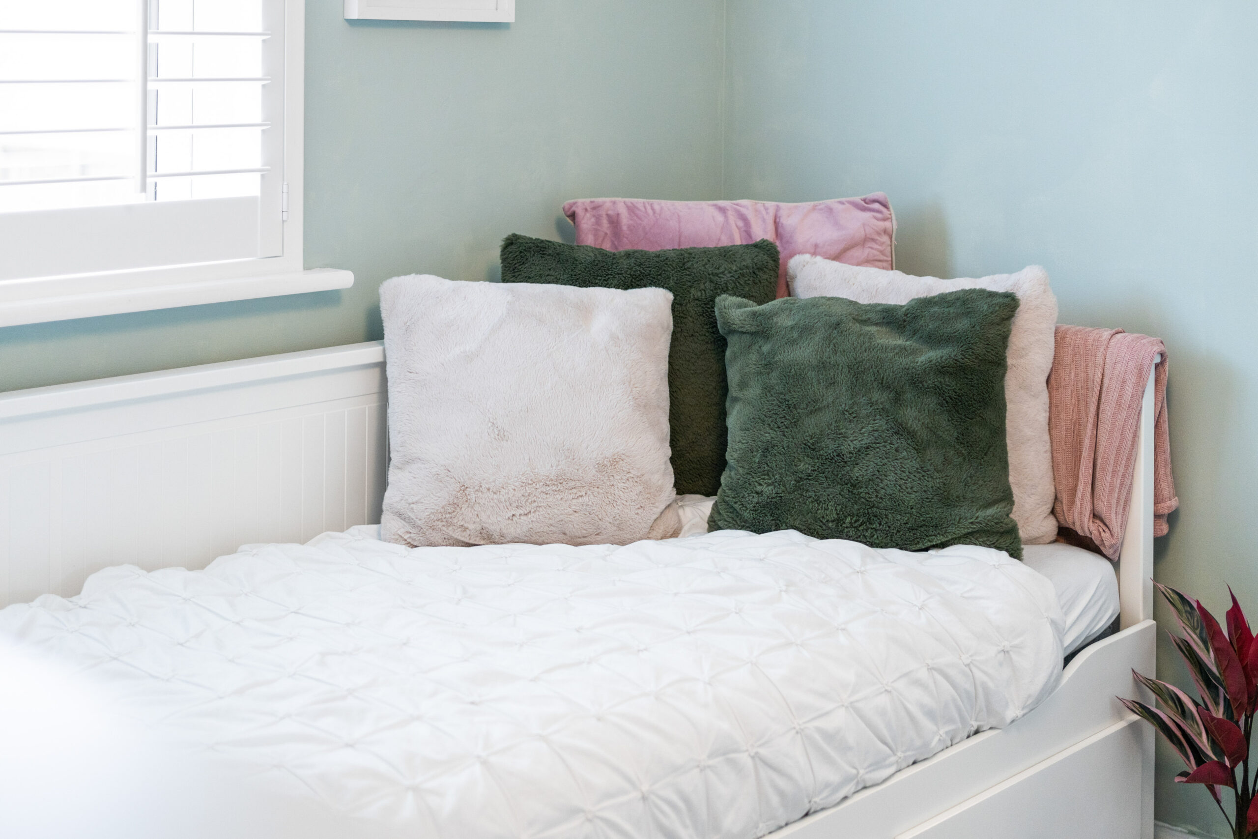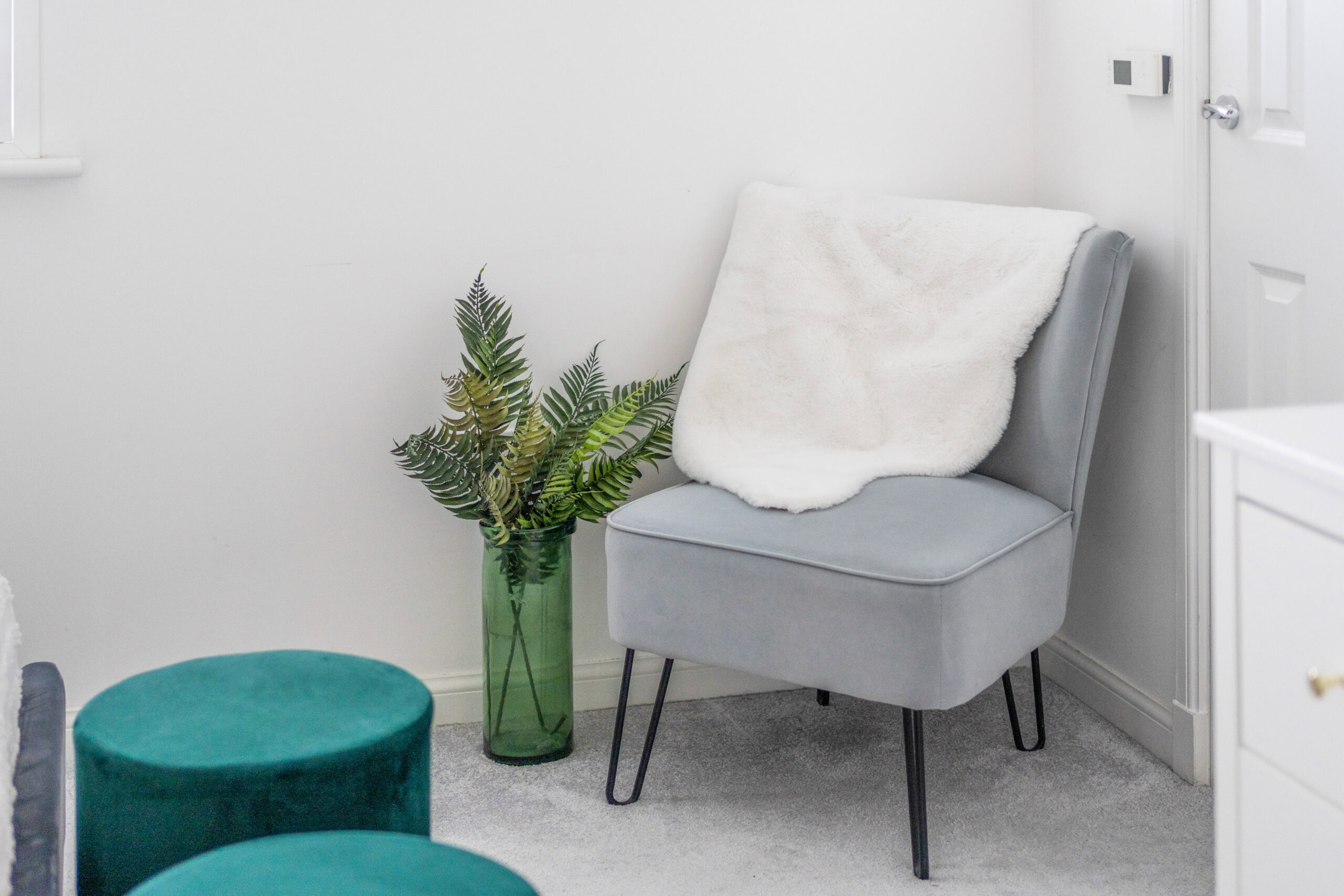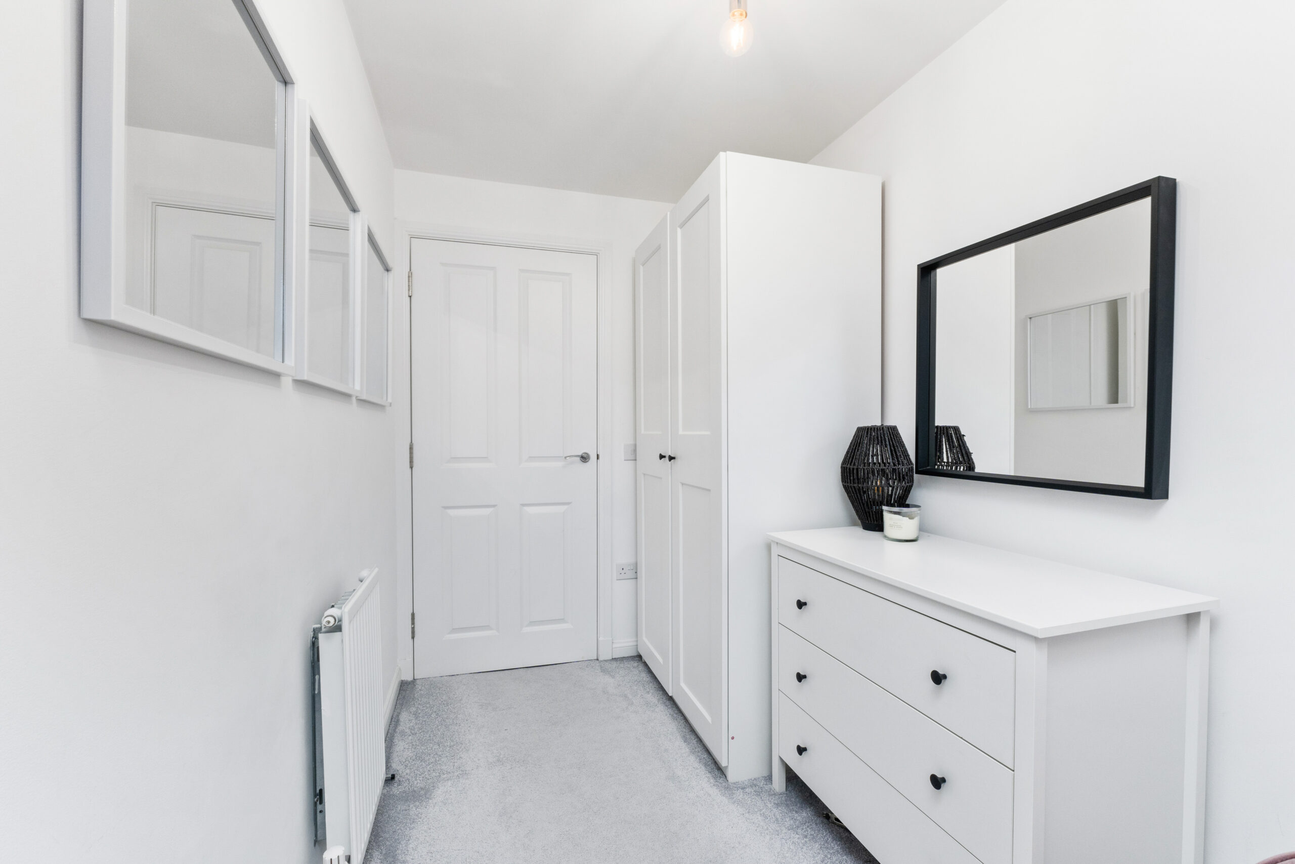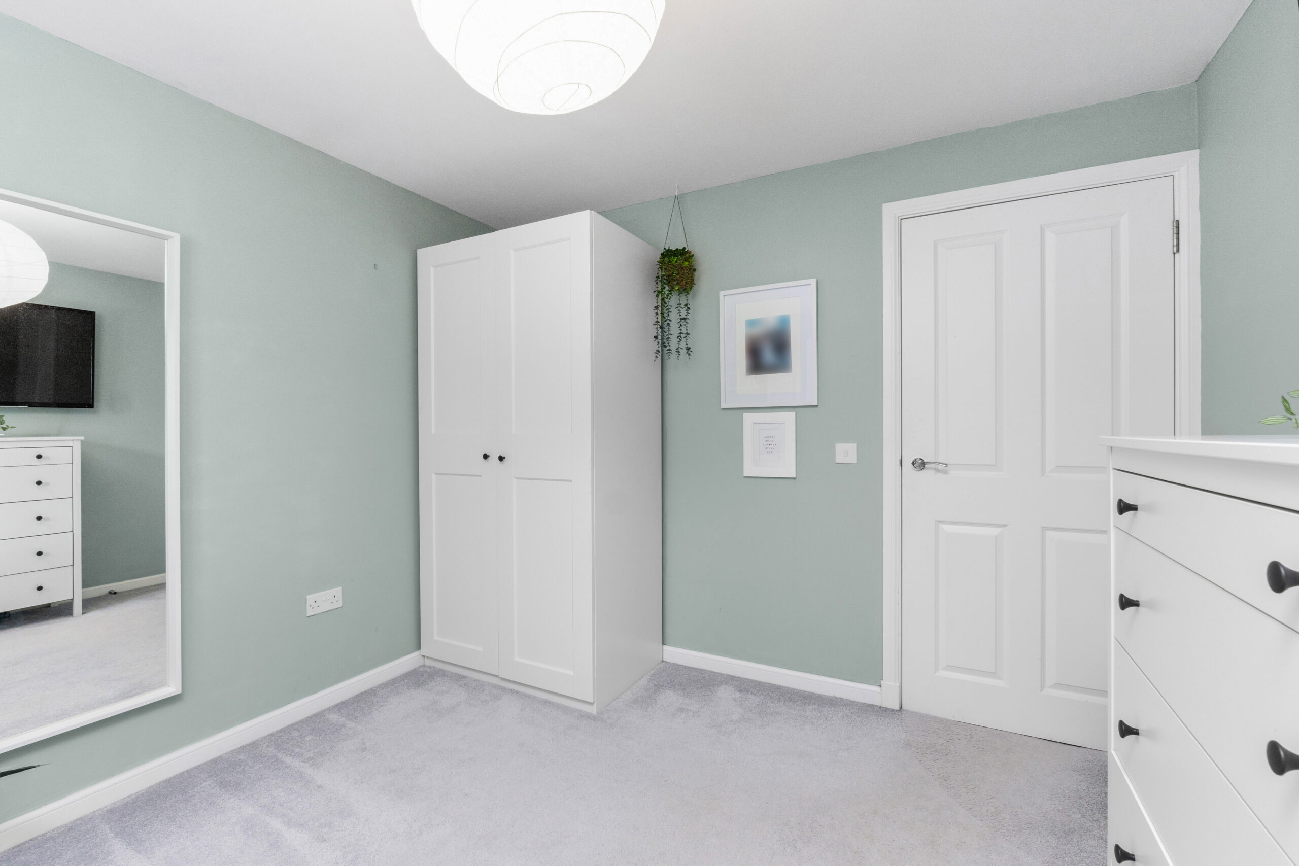 Upstairs, the home continues to impress with three well-appointed bedrooms, all fitted with plush carpeting for added comfort. The principal bedroom is beautifully finished in a fresh, neutral palette and boasts a fabulous walk-in wardrobe, along with additional space for free-standing furniture. Bedroom two is a generous double, decorated in a soft pastel green, creating a serene and relaxing ambiance. Bedroom three, a spacious single, offers a lovely view of the landscaped garden, making it a perfect space for a child's bedroom or a home office.