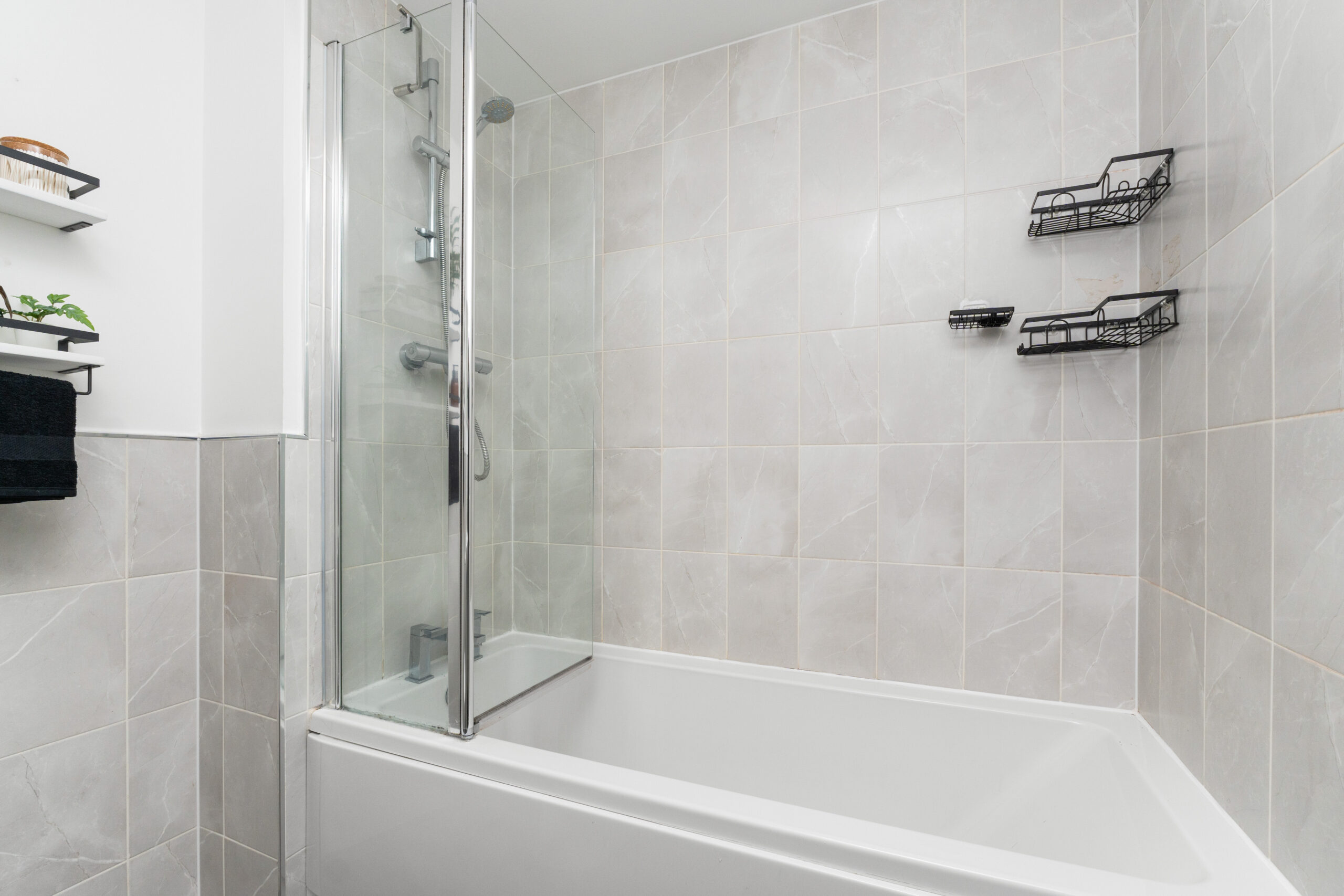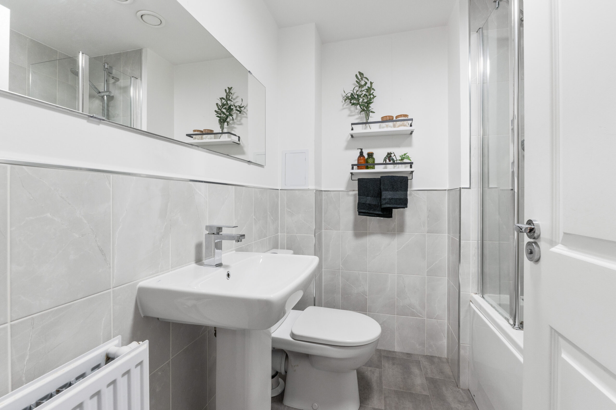 The family bathroom is a true showpiece, designed with modern splashbacks, sophisticated tiling, and a shower over the bath, combining both style and practicality.