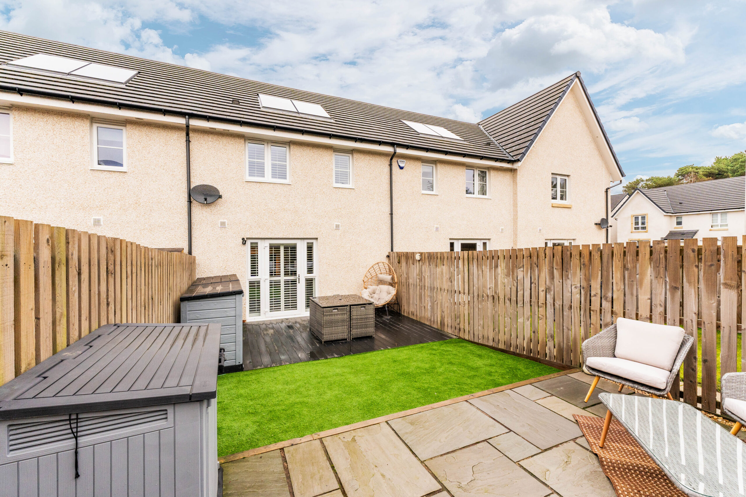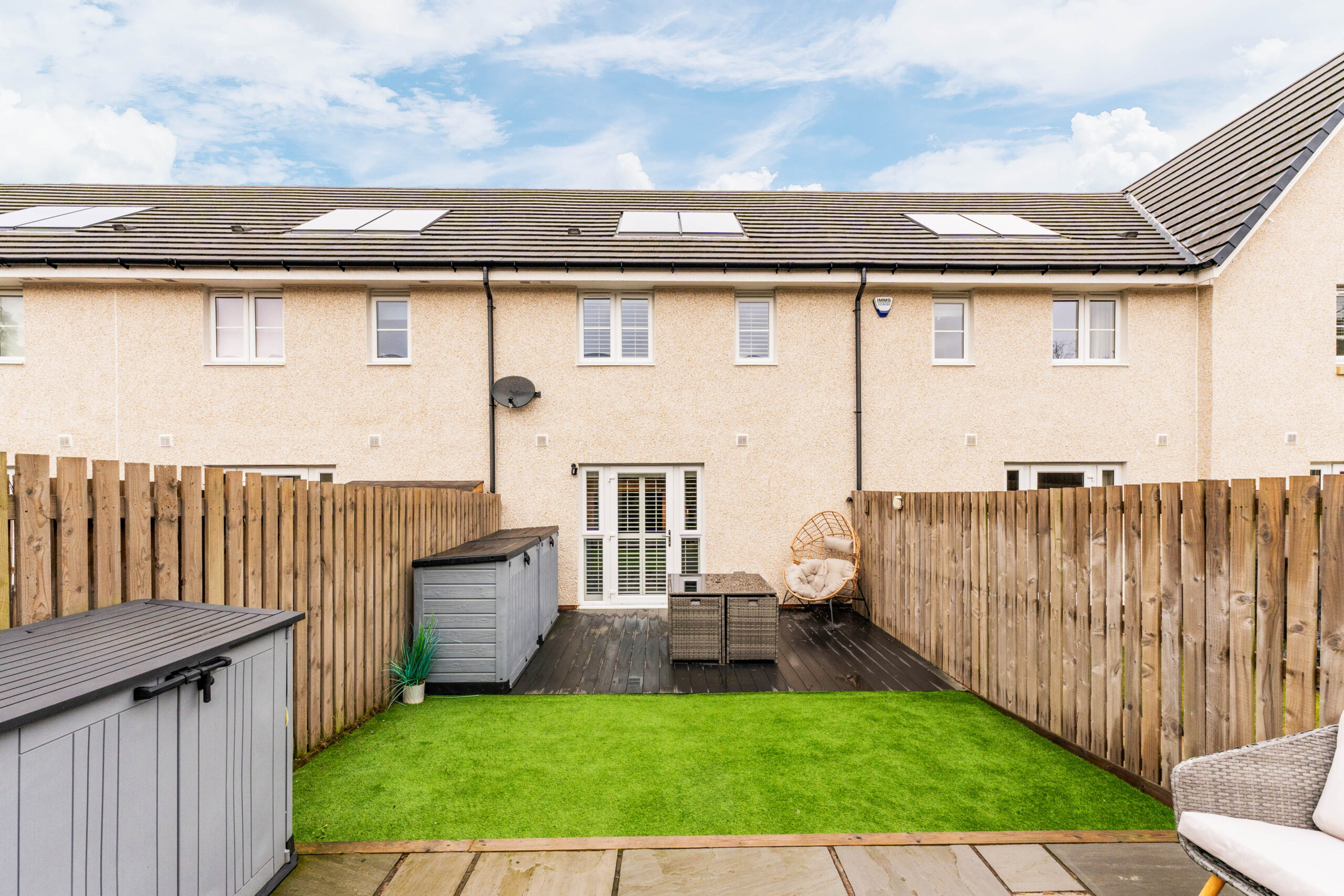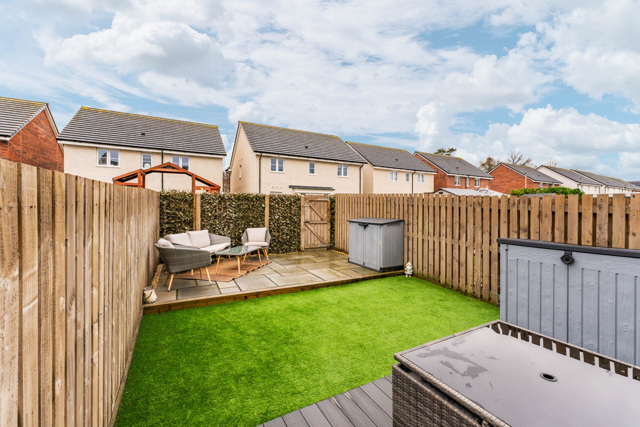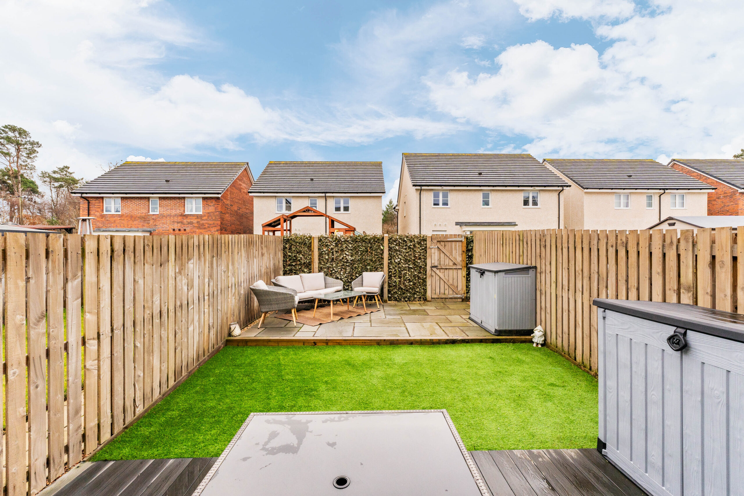 Externally, the south-facing rear landscaped garden is a private retreat, featuring low-maintenance artificial grass, composite decking, and a paved patio ideal for enjoying outdoor living in all seasons. The garden also includes a store for garden essentials and two dedicated bin stores, all enclosed within timber fencing for added privacy.