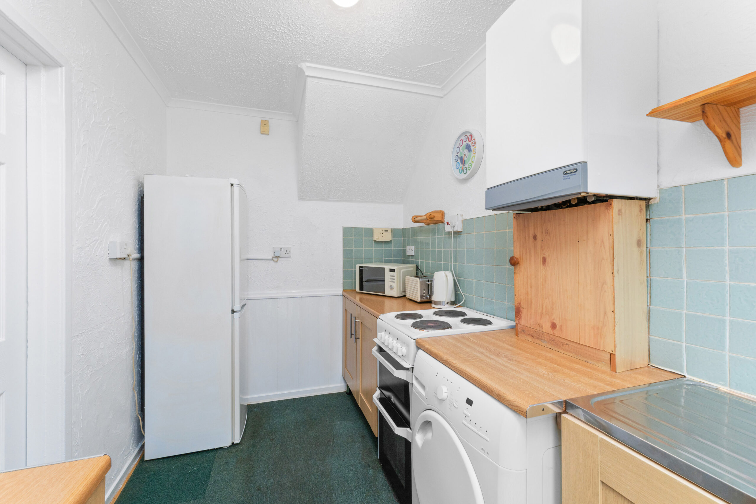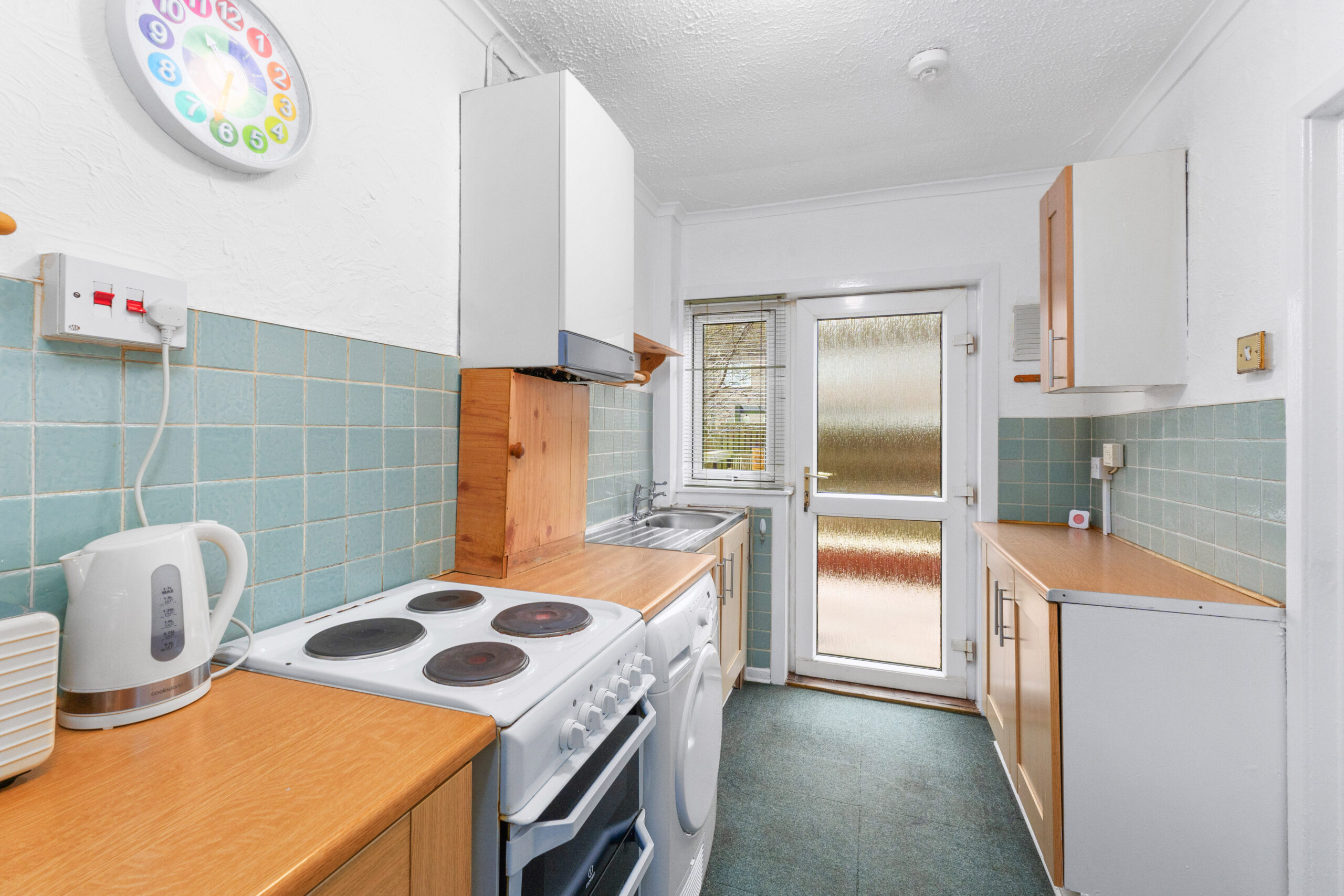 Arriving at the property, you're greeted by a fully enclosed front garden overlooking a peaceful green, setting a serene and welcoming tone. Step inside to find the entrance hallway with a handy under-stair store cupboard that houses the electrics and provides access to the bright and cosy lounge, featuring dual-aspect windows and a charming electric fire that adds character and warmth. This inviting space flows seamlessly into a well-equipped kitchen, with plentiful base and wall units, practical worktops, and tasteful splashback tiles. A door opens from the kitchen to the expansive rear garden ideal for al fresco dining or quiet mornings with a coffee.