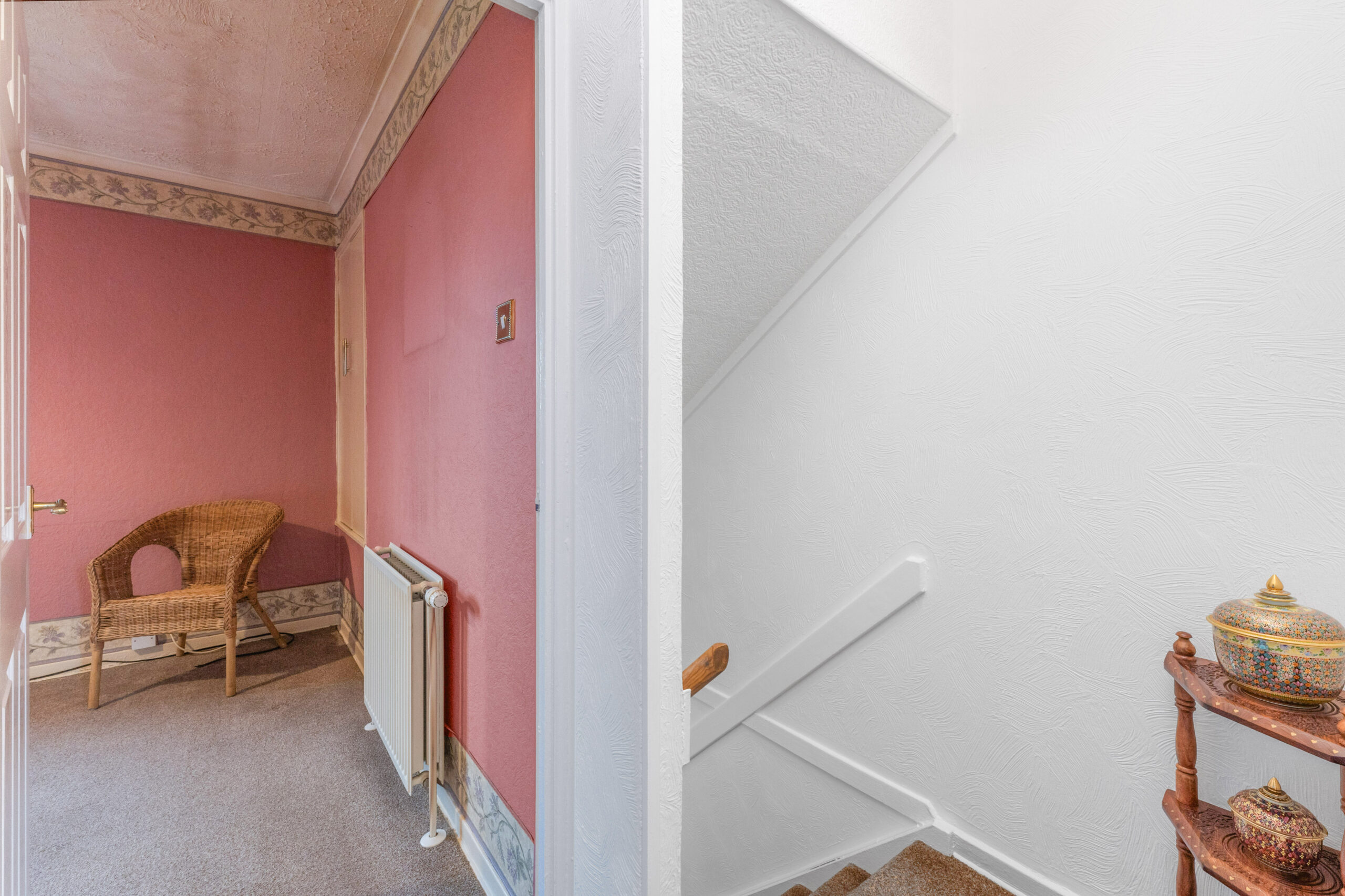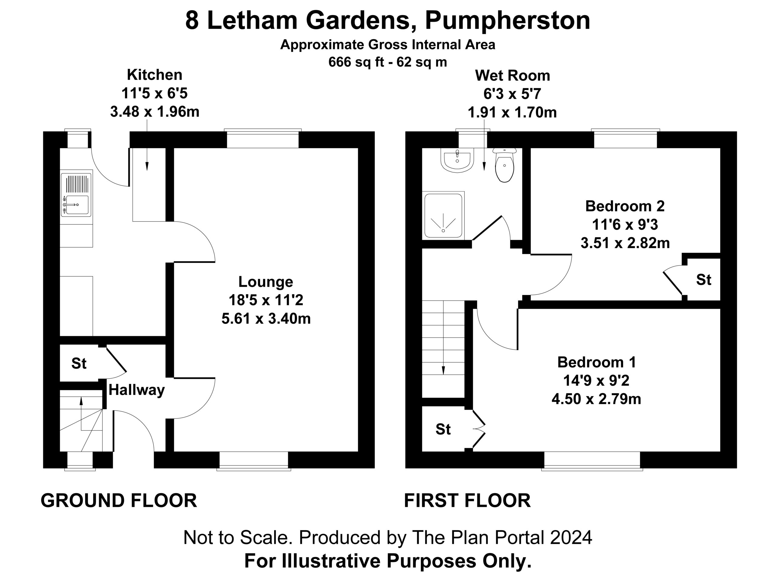 Upstairs, the upper landing connects to two generous double bedrooms, each with built-in storage and ample room for additional furniture. The home also includes a practical wet room and easy access to a partially floored loft via a hatch and pull-down ladder, maximizing storage potential.