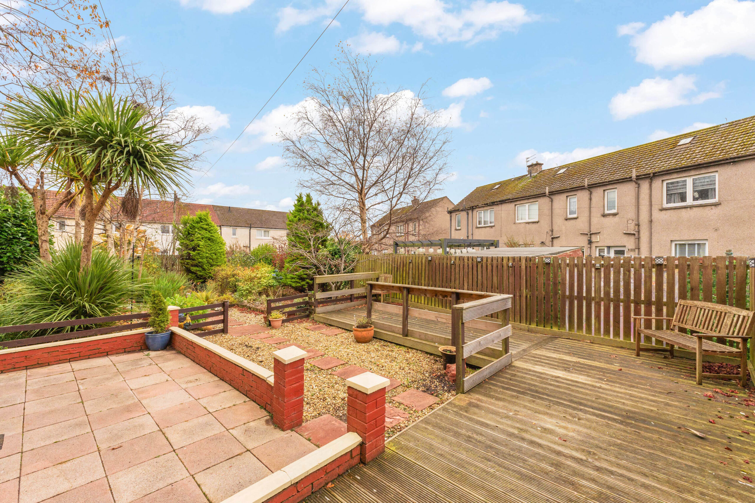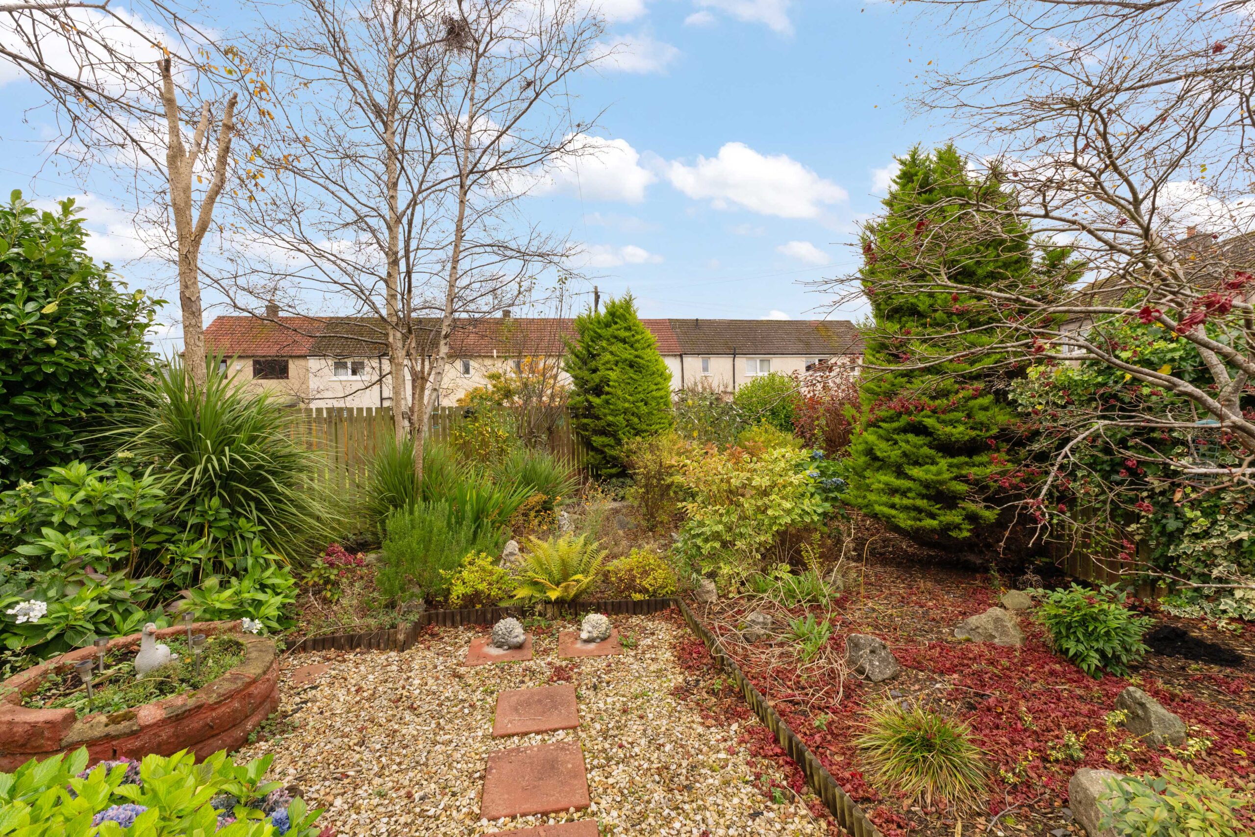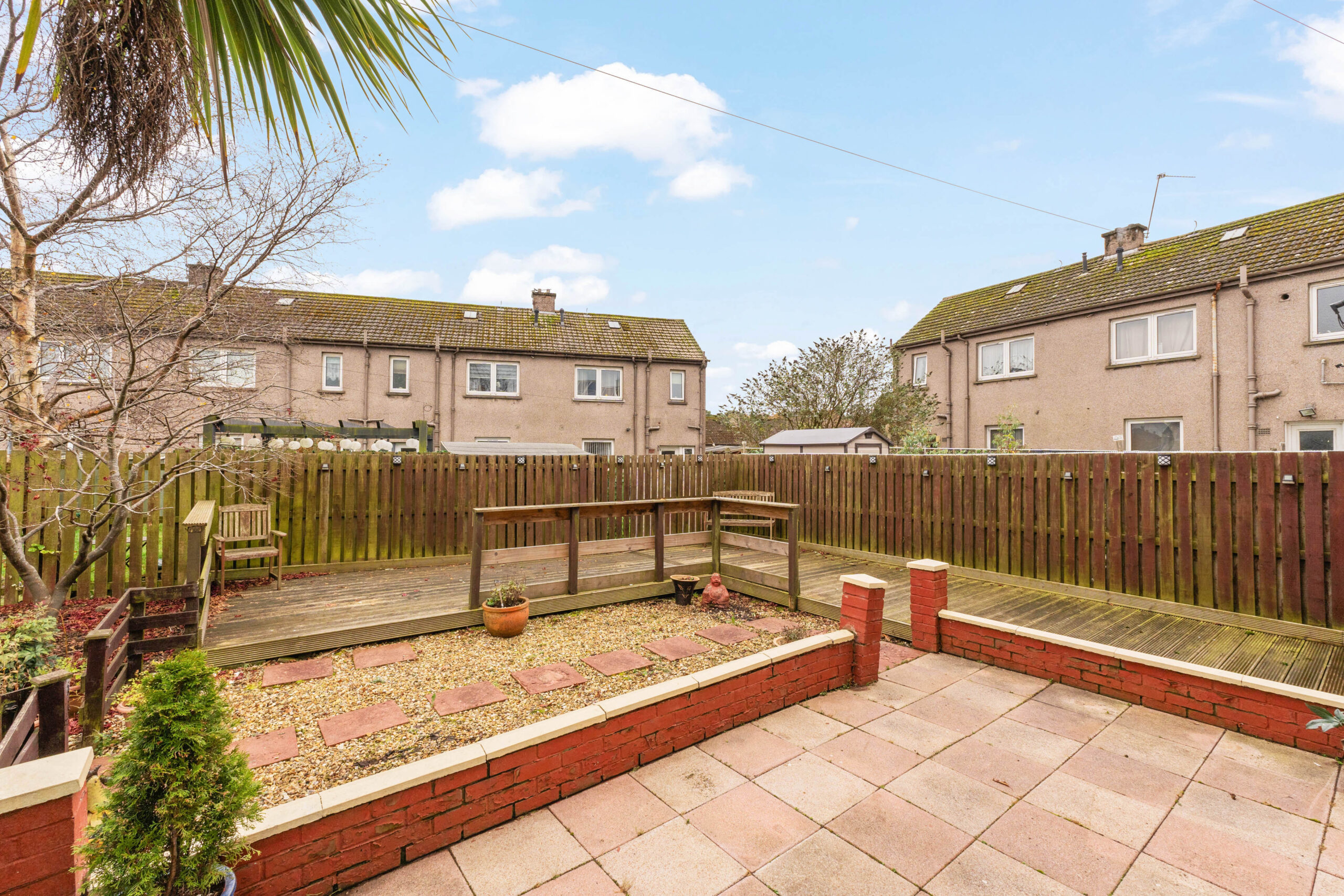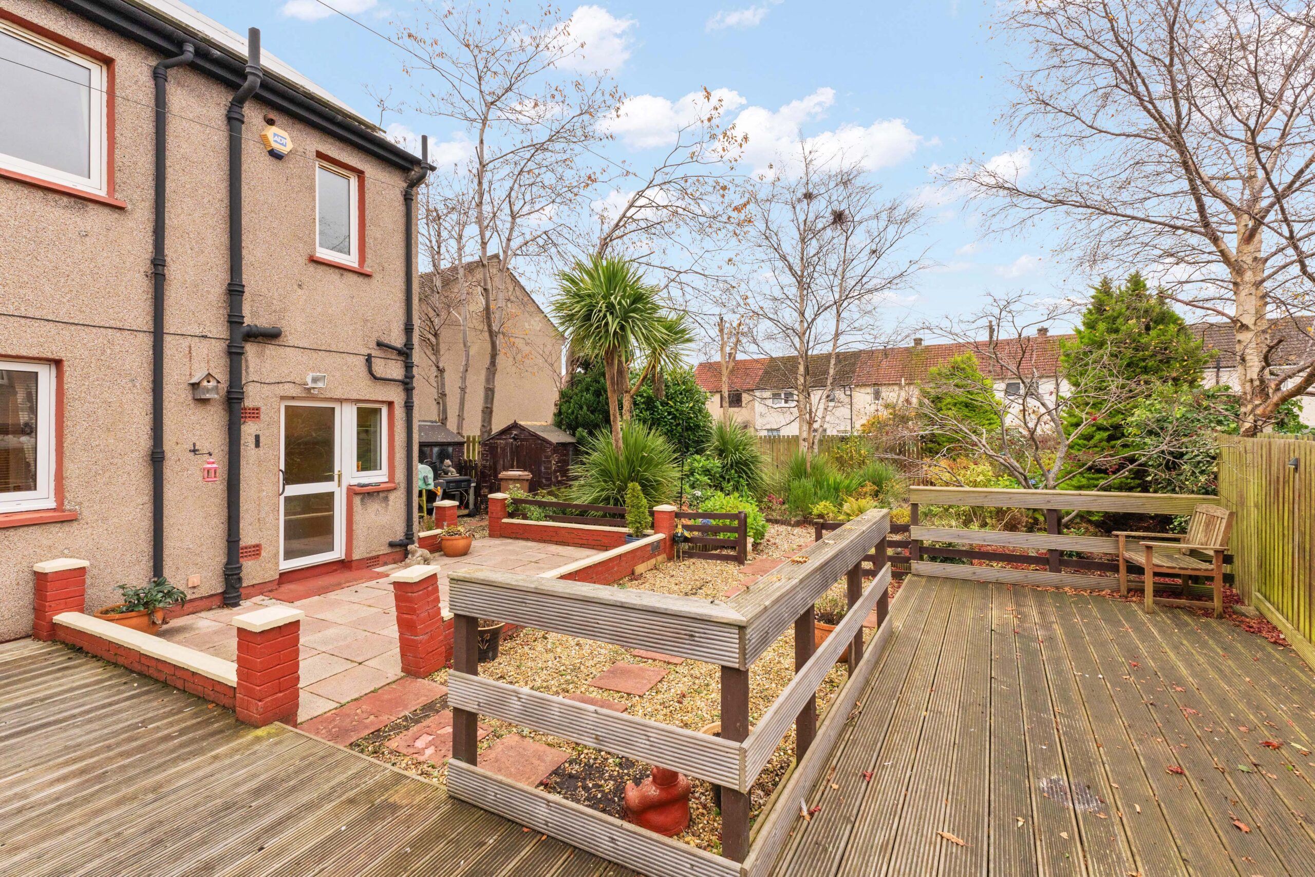 The rear garden is where this home truly shines. A fully enclosed haven, it offers a paved, chipped, and decked sanctuary dotted with an array of trees and shrubs, providing a private oasis for relaxation and entertainment.
