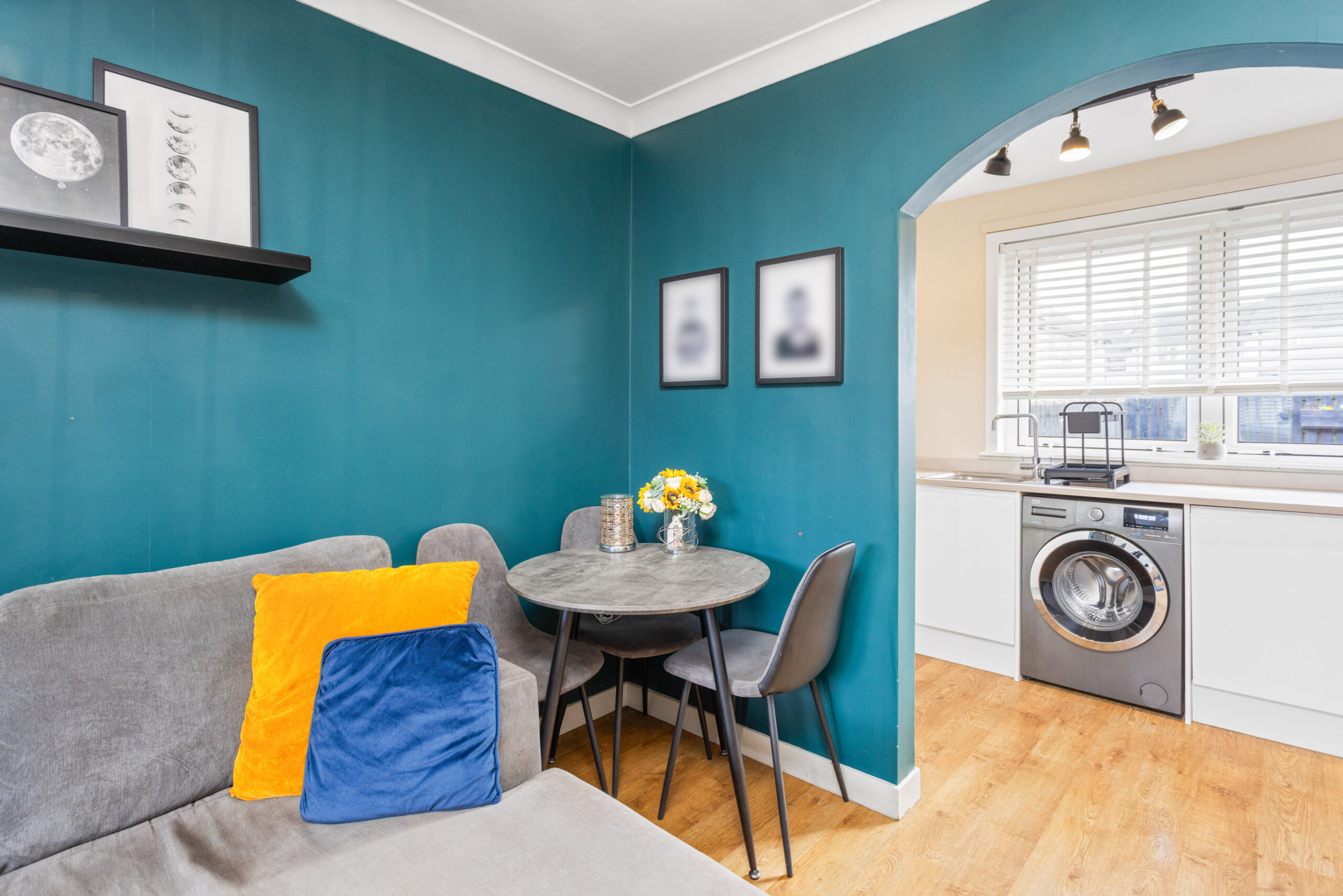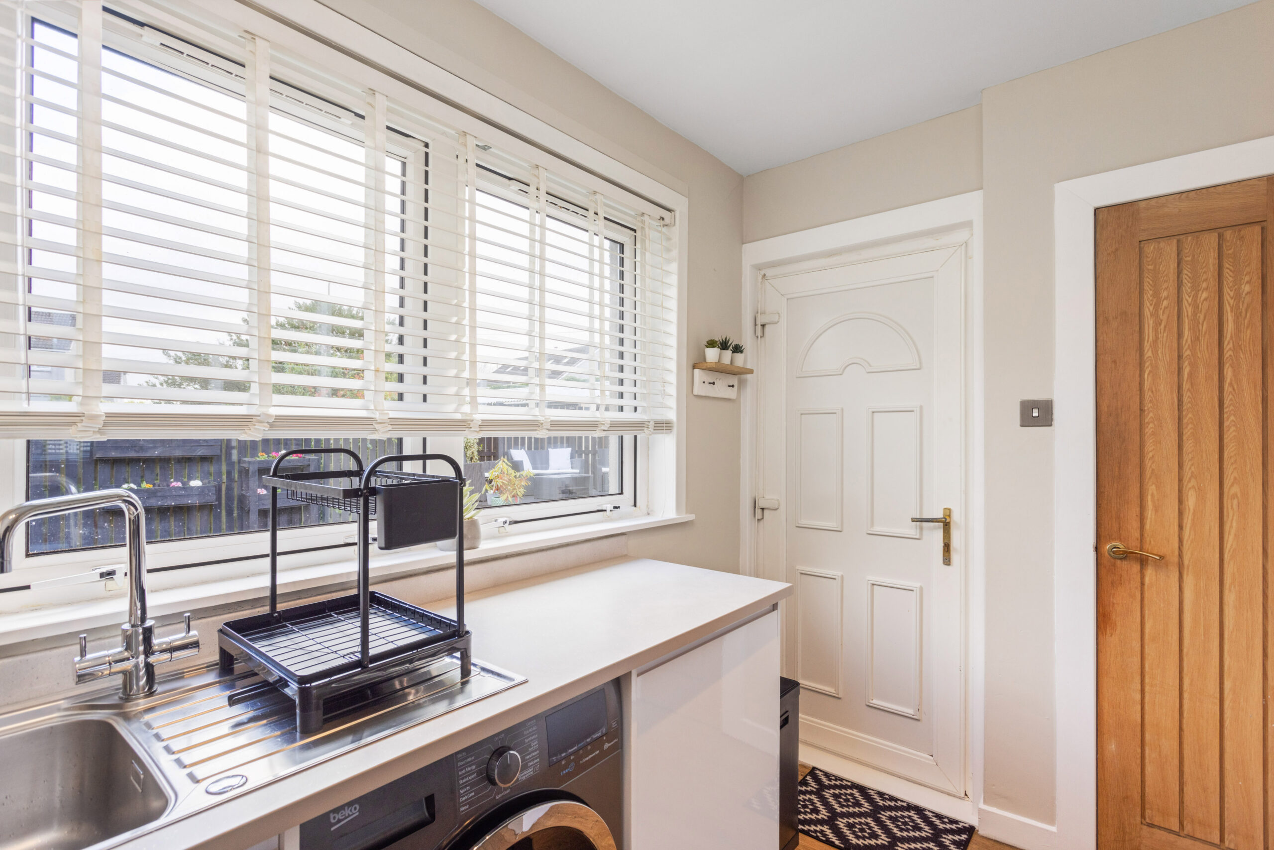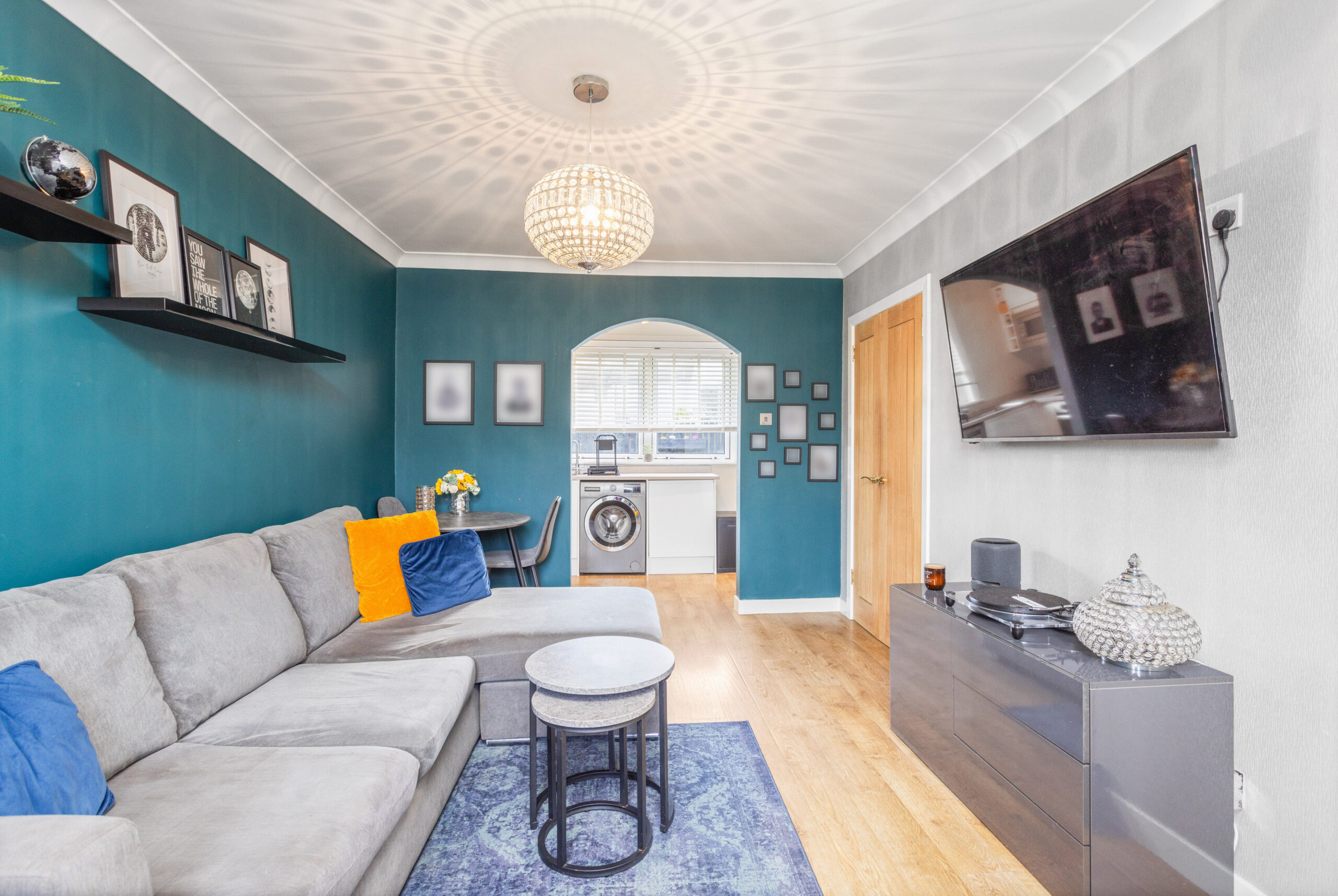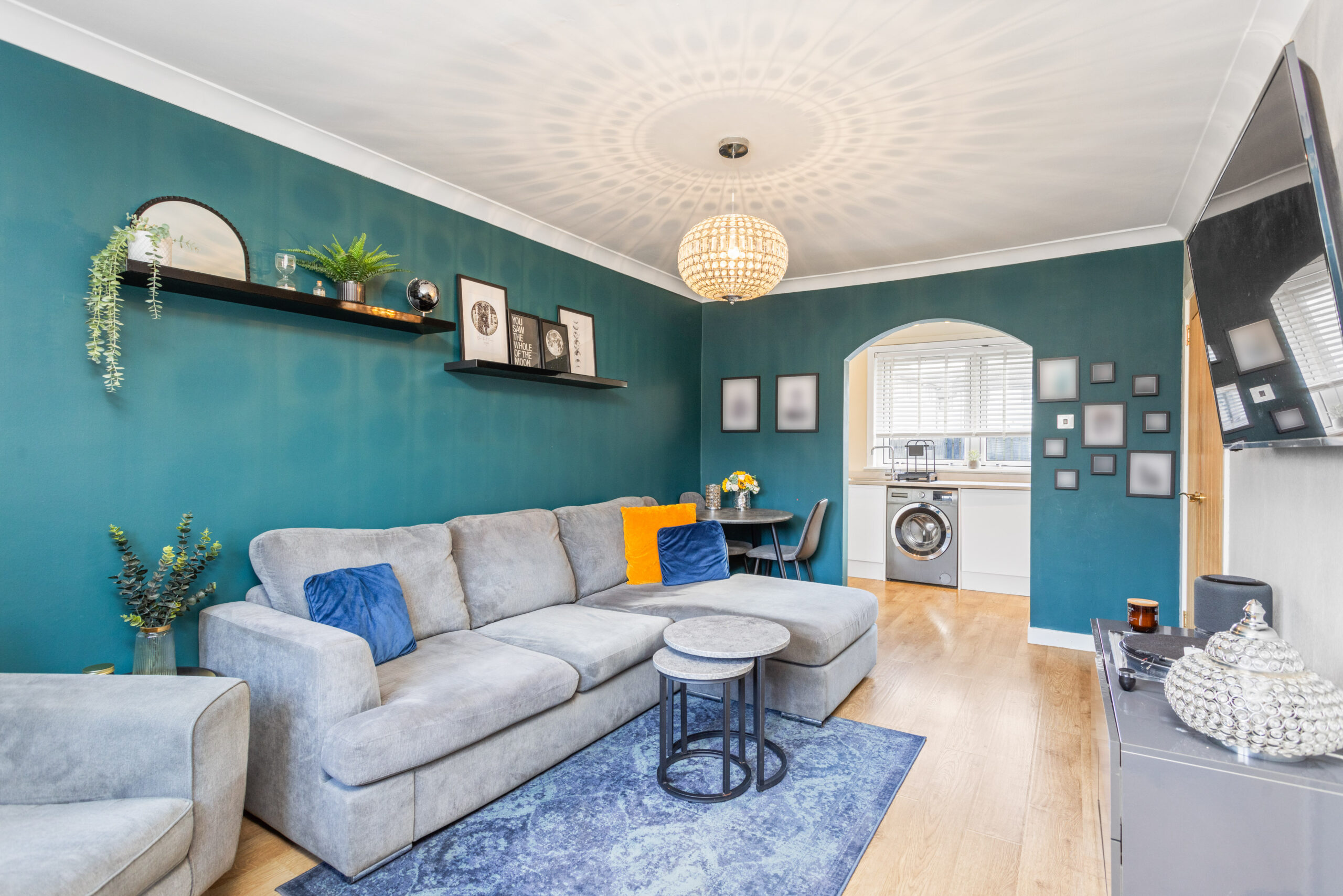 The bright and inviting front-facing lounge enjoys picturesque views over the green, creating a relaxing and peaceful atmosphere. Beautifully decorated, this generous living space seamlessly flows into the semi-open-plan kitchen, making it perfect for both everyday living and entertaining. A handy store cupboard offers additional storage.