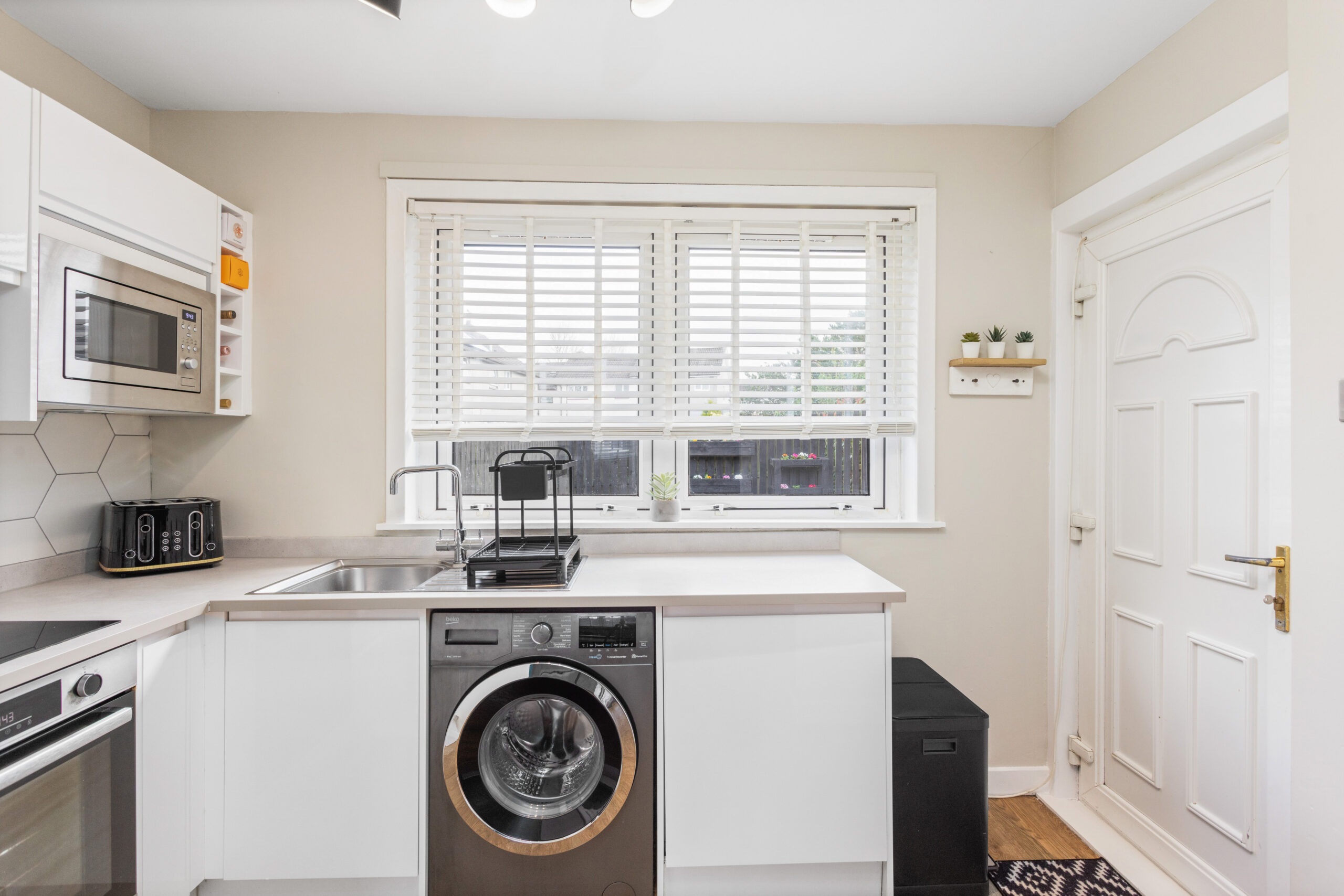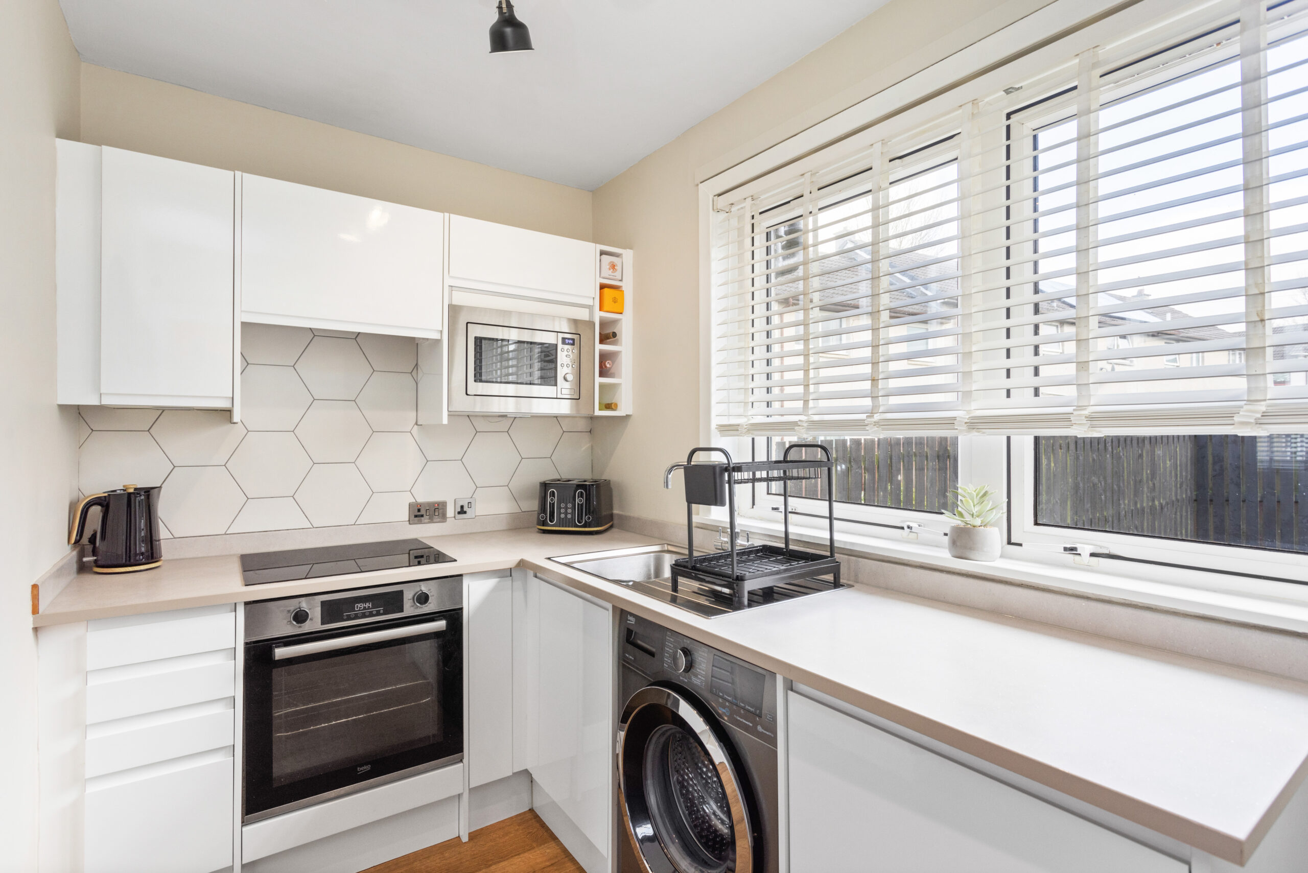 The contemporary kitchen is fitted with sleek white high-gloss base and wall units, complemented by stylish white hexagonal splashback tiles and modern worktops. It is fully equipped with an integrated oven, hob, microwave, and fridge, while there is also space for a free-standing washing machine. A convenient pantry store provides extra storage, and a door leads directly to the garden.
