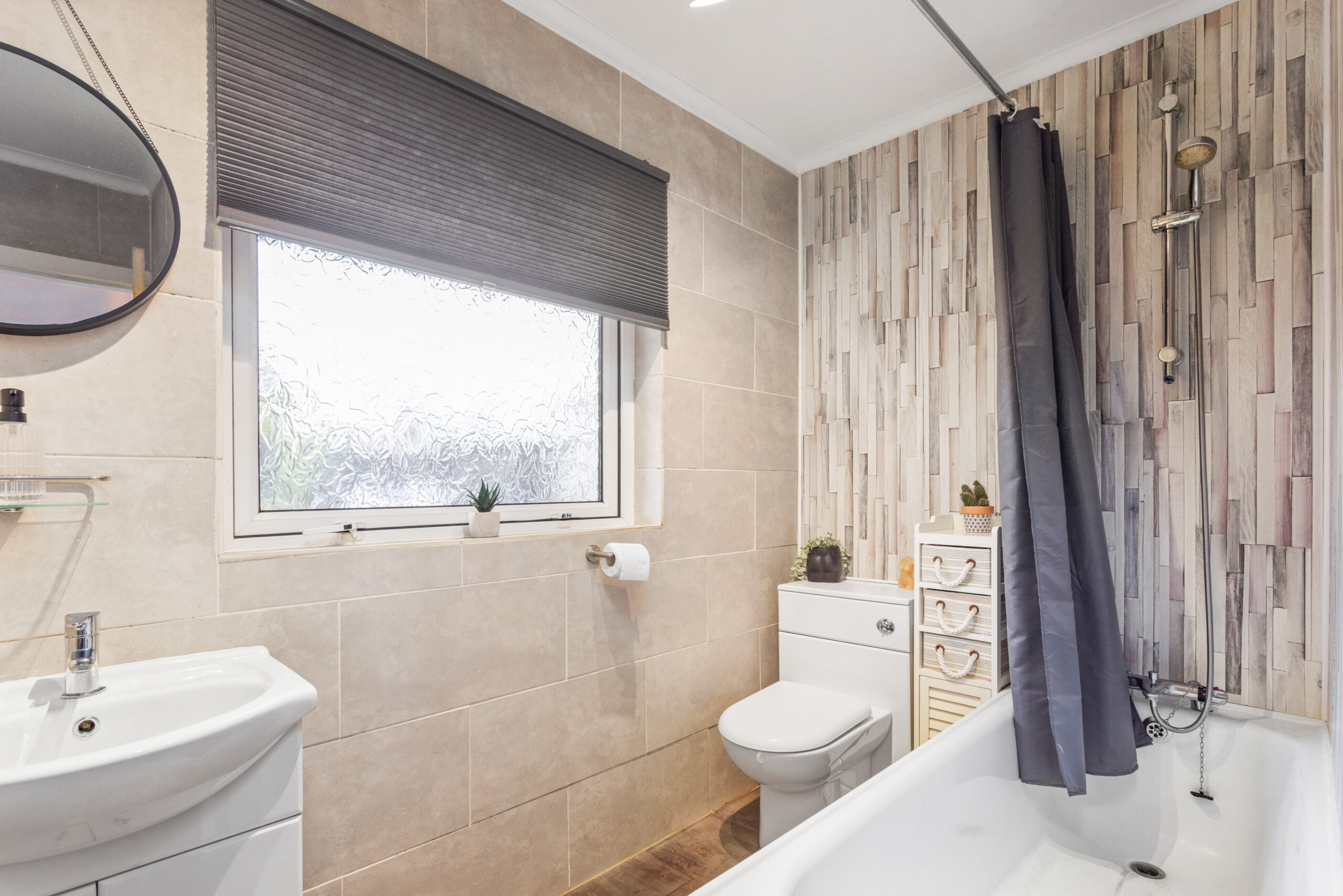 Completing the accommodation, the modern bathroom is fitted with a white WC, a sink with a high-gloss vanity unit, and a bath with an overhead shower. Attractive splashback tiling to the walls and wet wall panelling in the shower area add to the contemporary appeal, while the laminate tile-effect flooring enhances the stylish finish. A rear-facing window allows for natural light and ventilation.