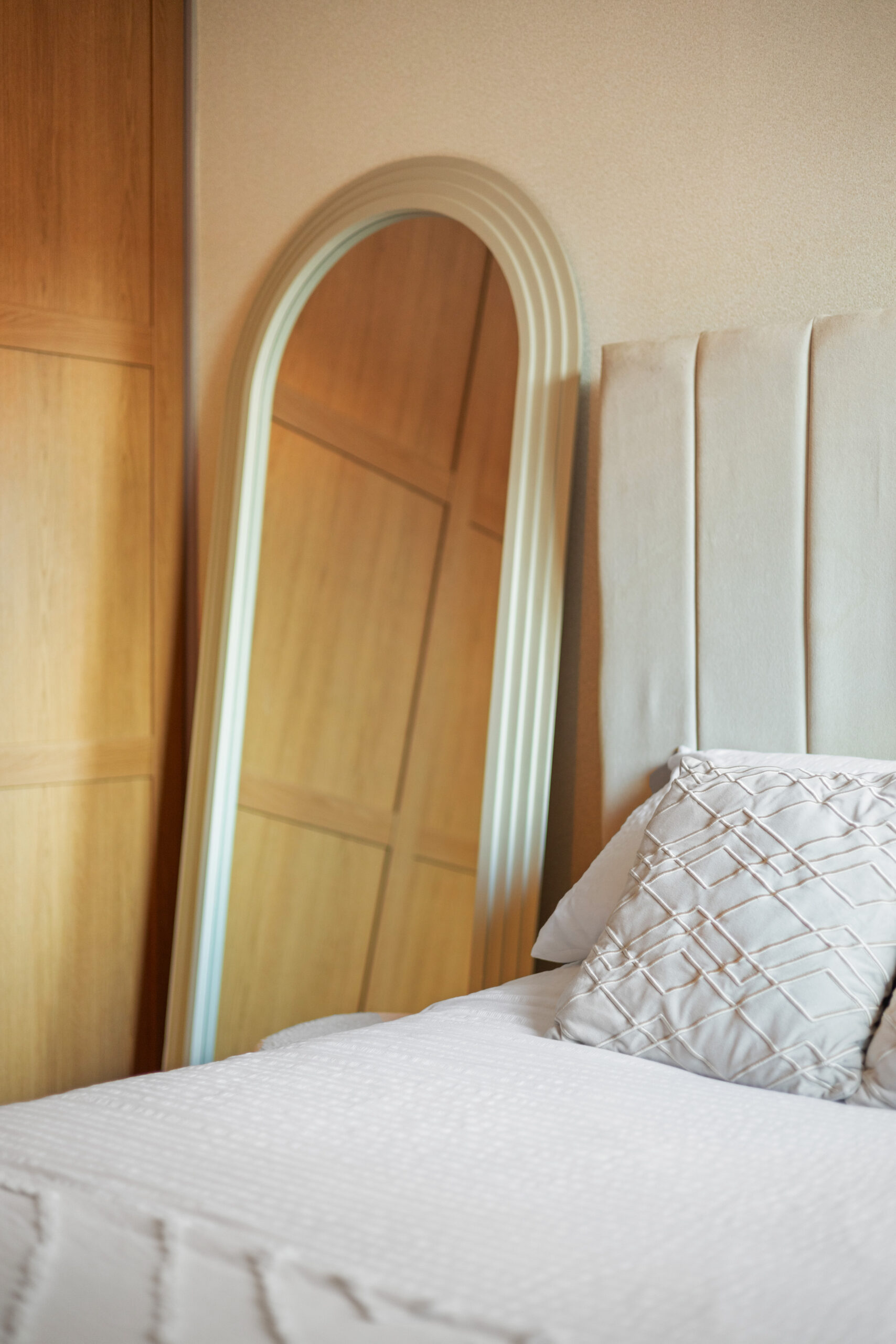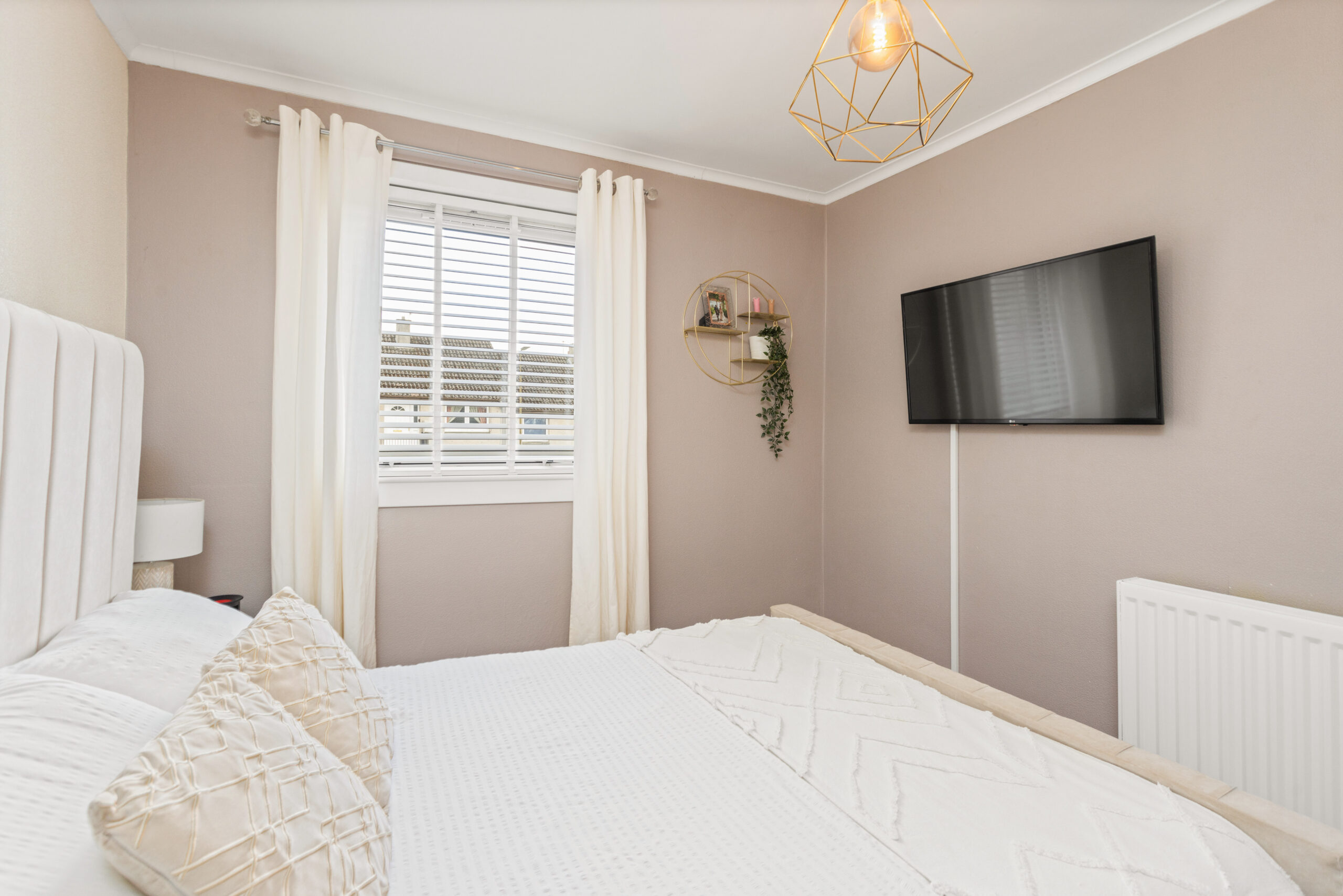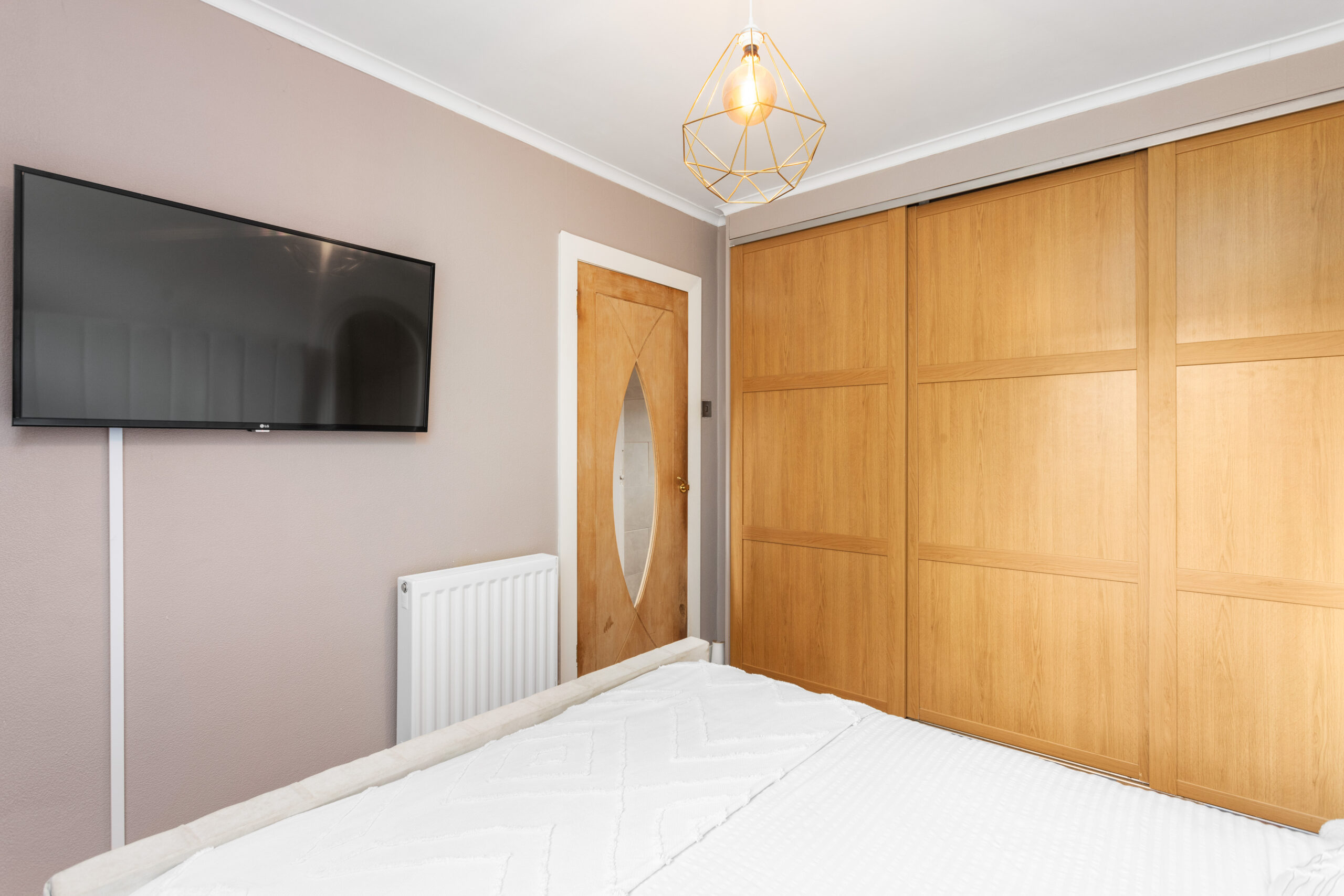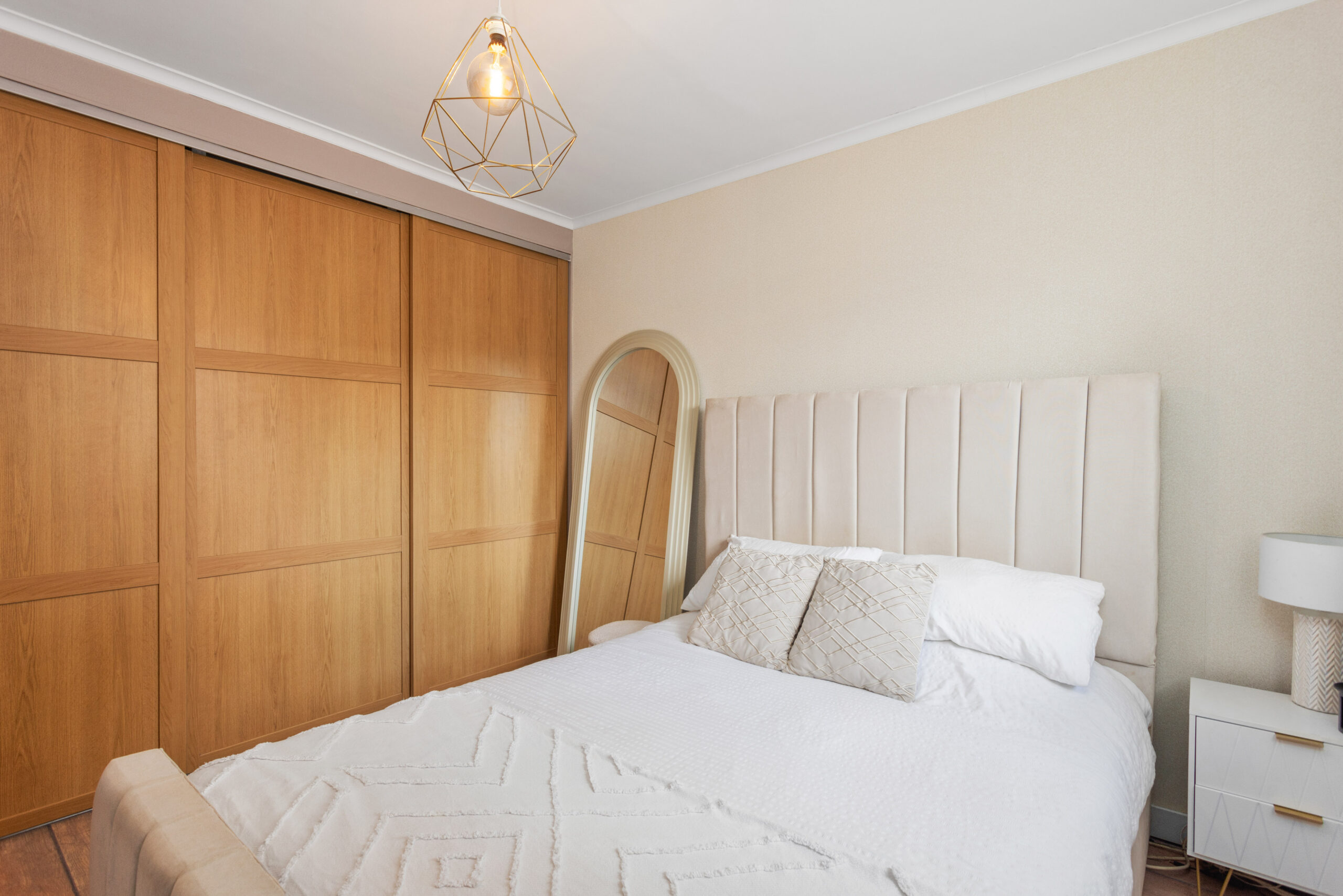 The spacious double bedroom is bathed in natural light thanks to a large front-facing window. A full wall of fitted wardrobes, with one section designed as a walk-in closet, ensures ample storage, while still leaving plenty of space for additional freestanding bedroom furniture.