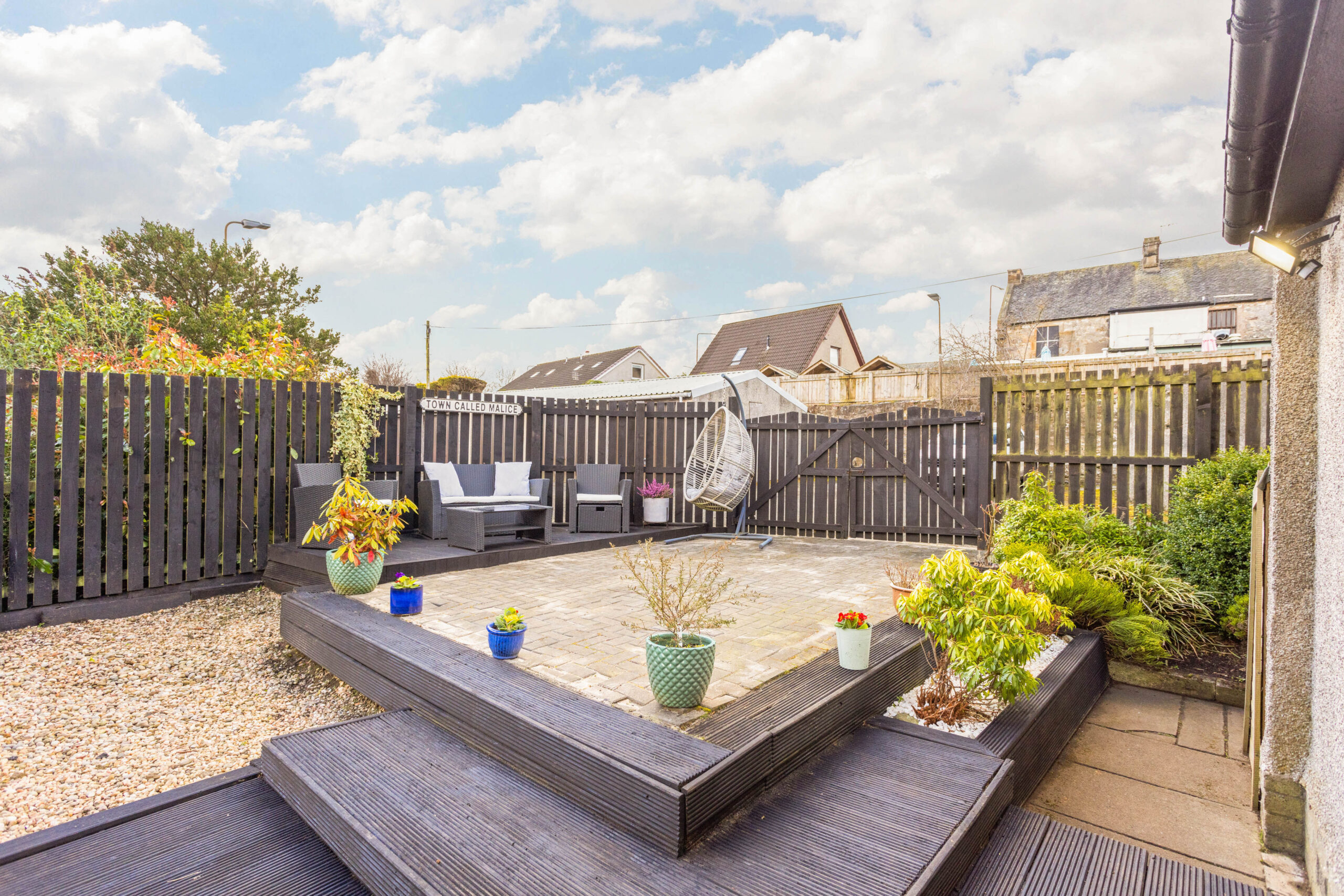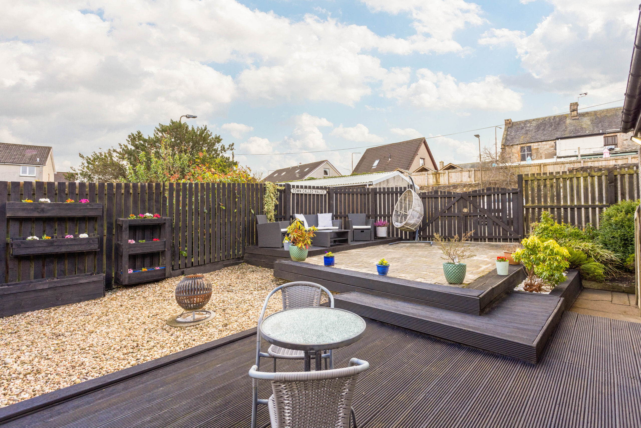 The fully enclosed rear garden has been designed for easy maintenance, featuring a combination of decorative chips and decking, ideal for outdoor dining and relaxation. A gated driveway to the rear provides secure off-street parking on a monoblocked area. Additional benefits include an external store cupboard and a charming, covered seating area just off the kitchen, allowing you to enjoy the fresh air even on rainy days.
