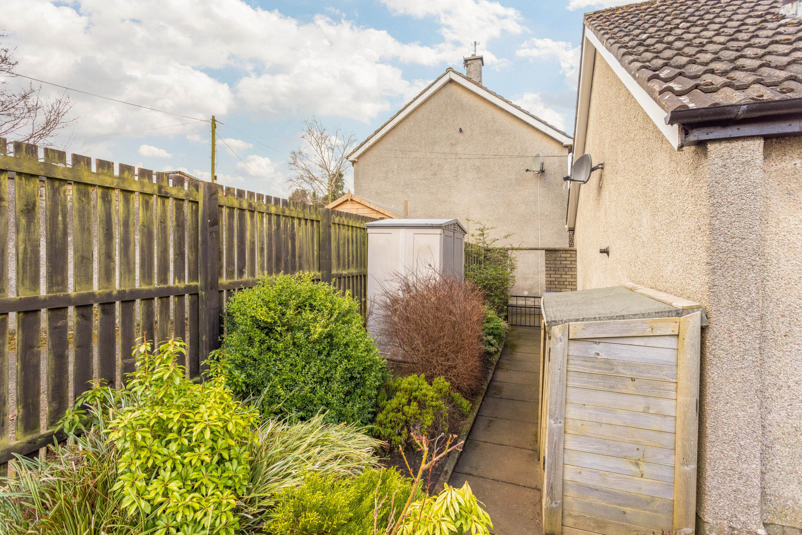The side garden is well maintained with established bushes and shrubs, while a garden shed provides extra storage. A gate offers convenient access to the front of the property.