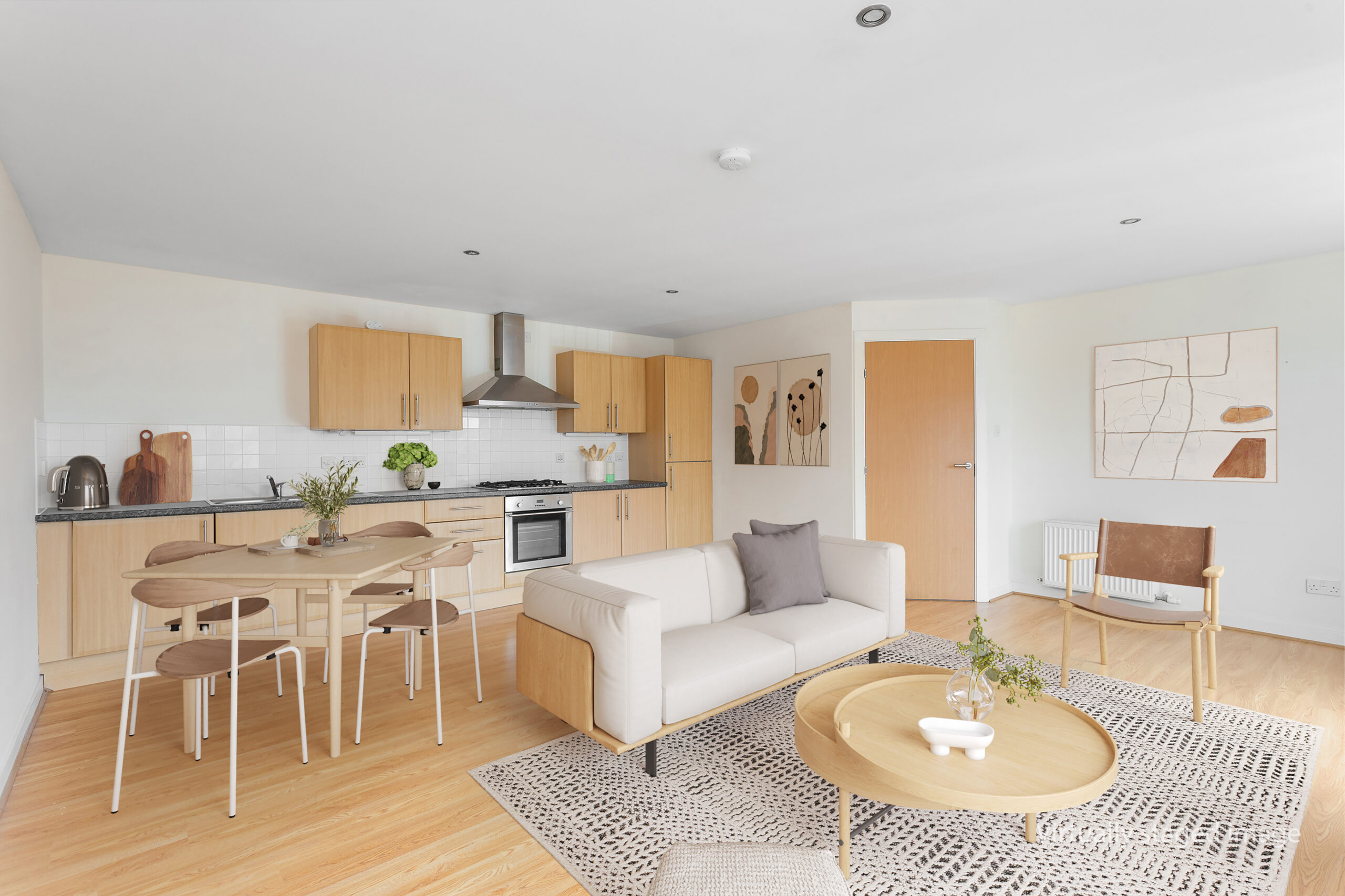 The heart of the home is the open-plan kitchen/diner/lounge, a bright and airy expanse boasting views from the front window and the charm of a Juliette balcony. The kitchen comes equipped with sleek base and wall units, integrated oven, hob, washing machine and fridge/freezer, all complemented by smart worktops and crisp white splashback tiles, set against a practical laminate flooring, a fabulous space to entertain and unwind.