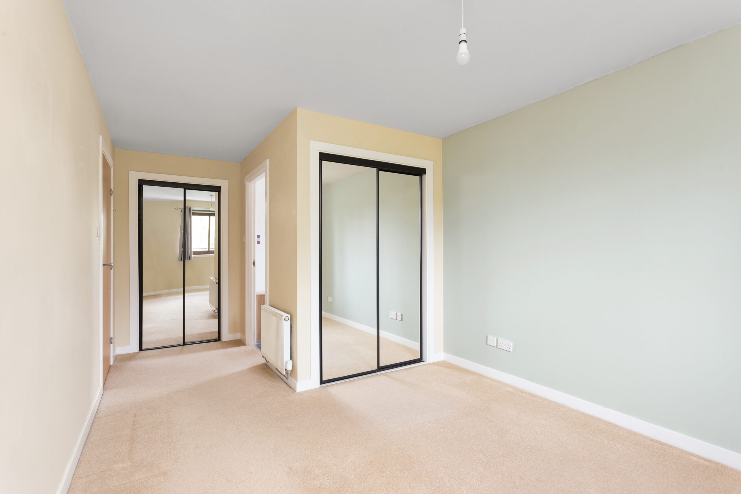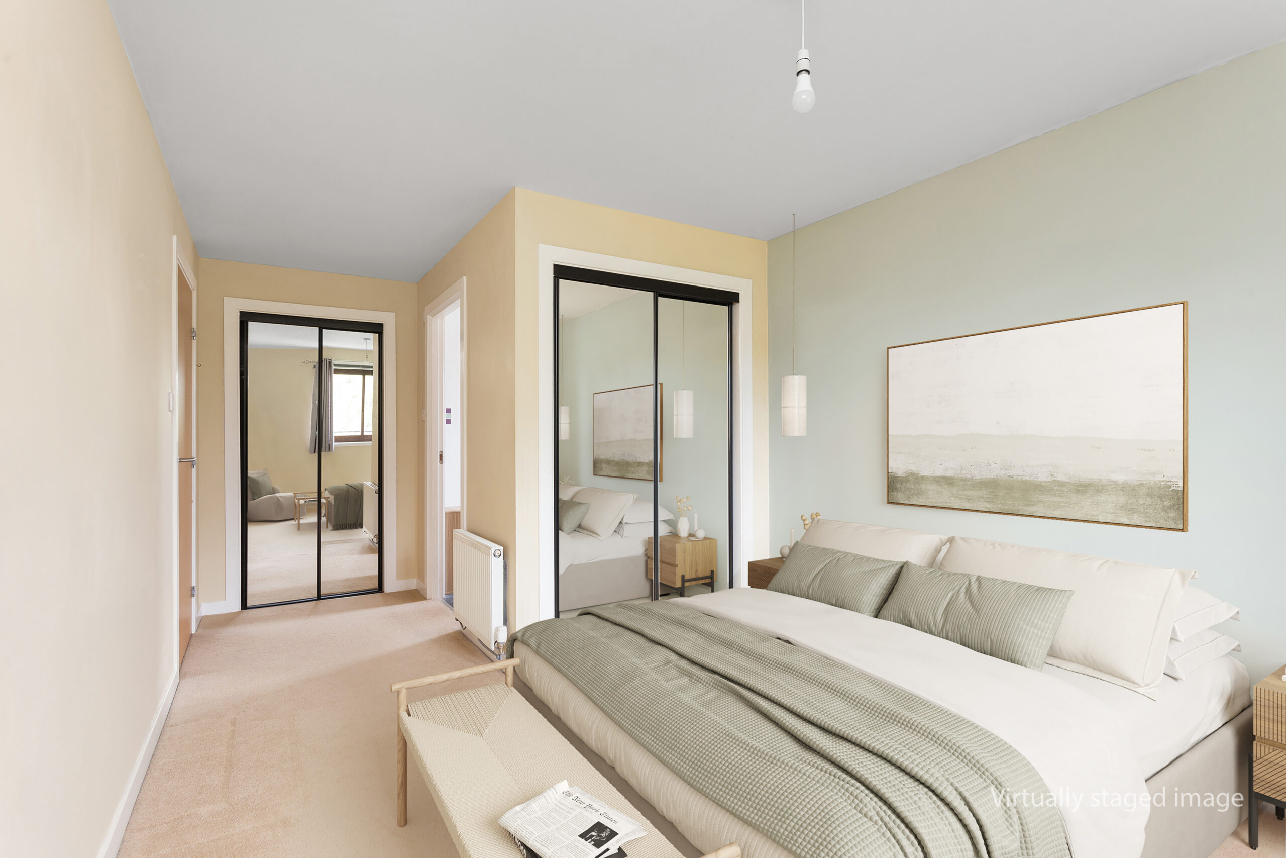 Retire to the master bedroom, which features two fitted wardrobes with mirrored sliding doors, soft carpeting, and the luxury of an en-suite bathroom with a classic white three-piece suite. Bedroom 2, another generous double, offers neutral decor and fitted wardrobes, ensuring ample space for additional furnishings.