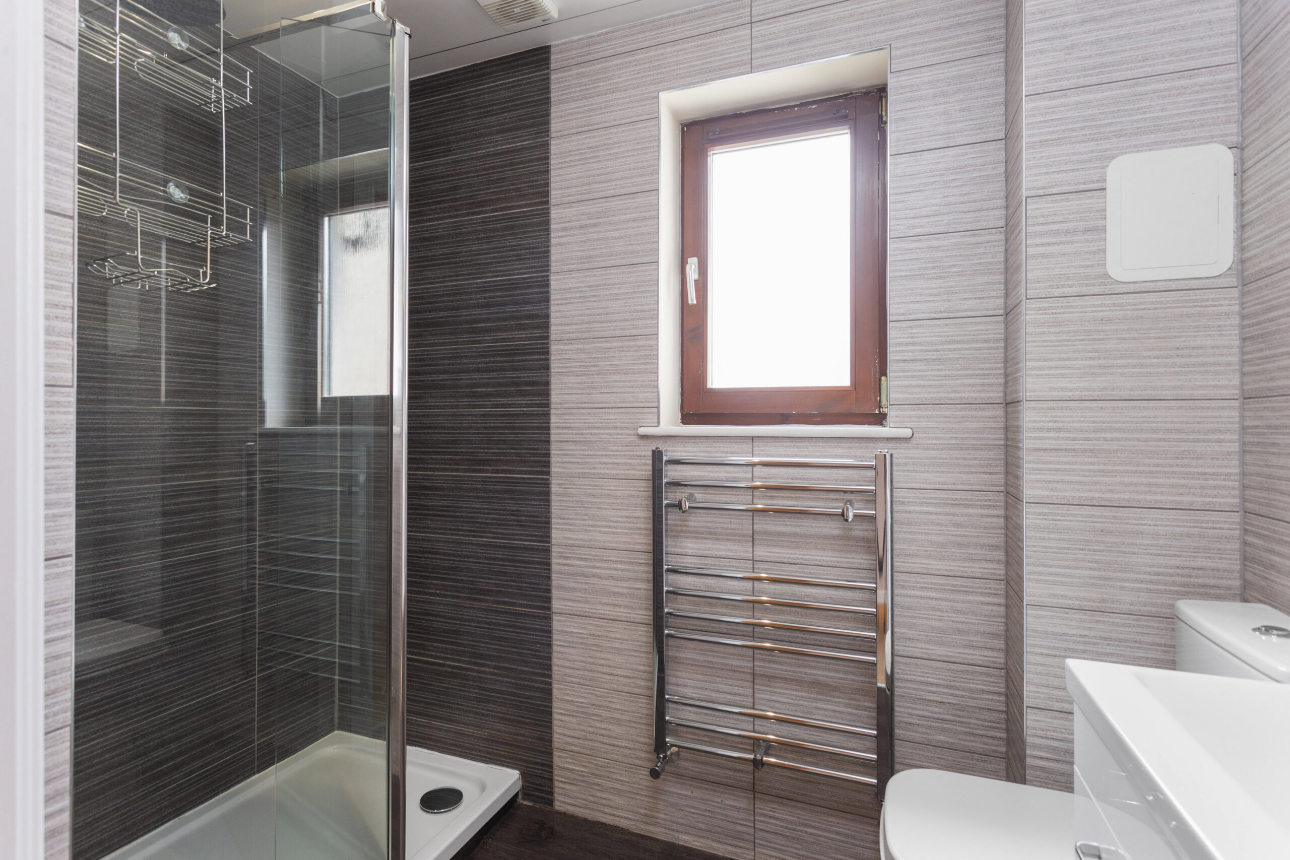 The contemporary shower room is a statement of modern living, complete with a stylish tiled finish, double shower, chic stainless steel heated towel rail, and sophisticated spotlights.