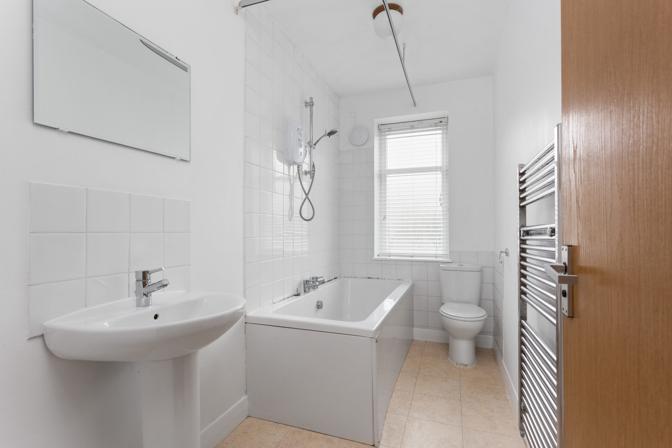 The bathroom, with its crisp white suite, includes an extra deep bath with side taps and a shower above, ensuring a refreshing start to your day. The opaque window provides privacy and light, while the laminate tile-effect flooring adds a modern touch.