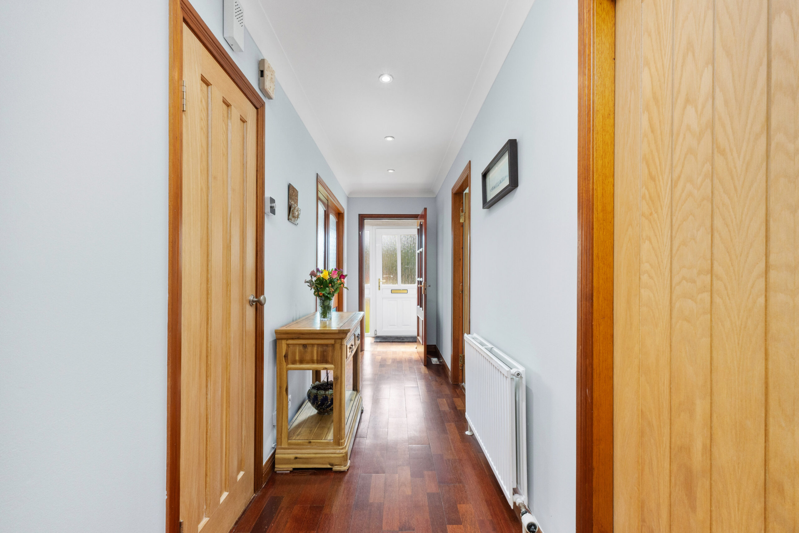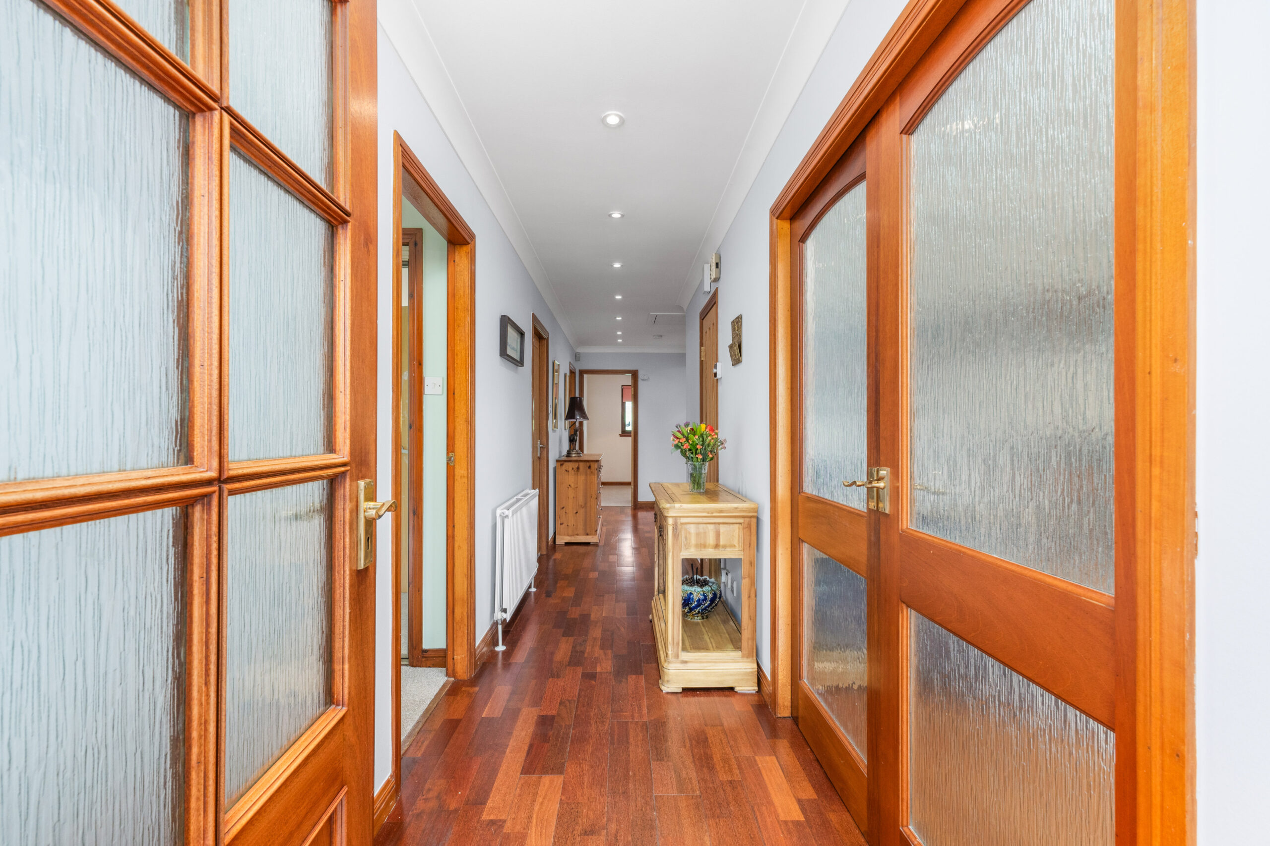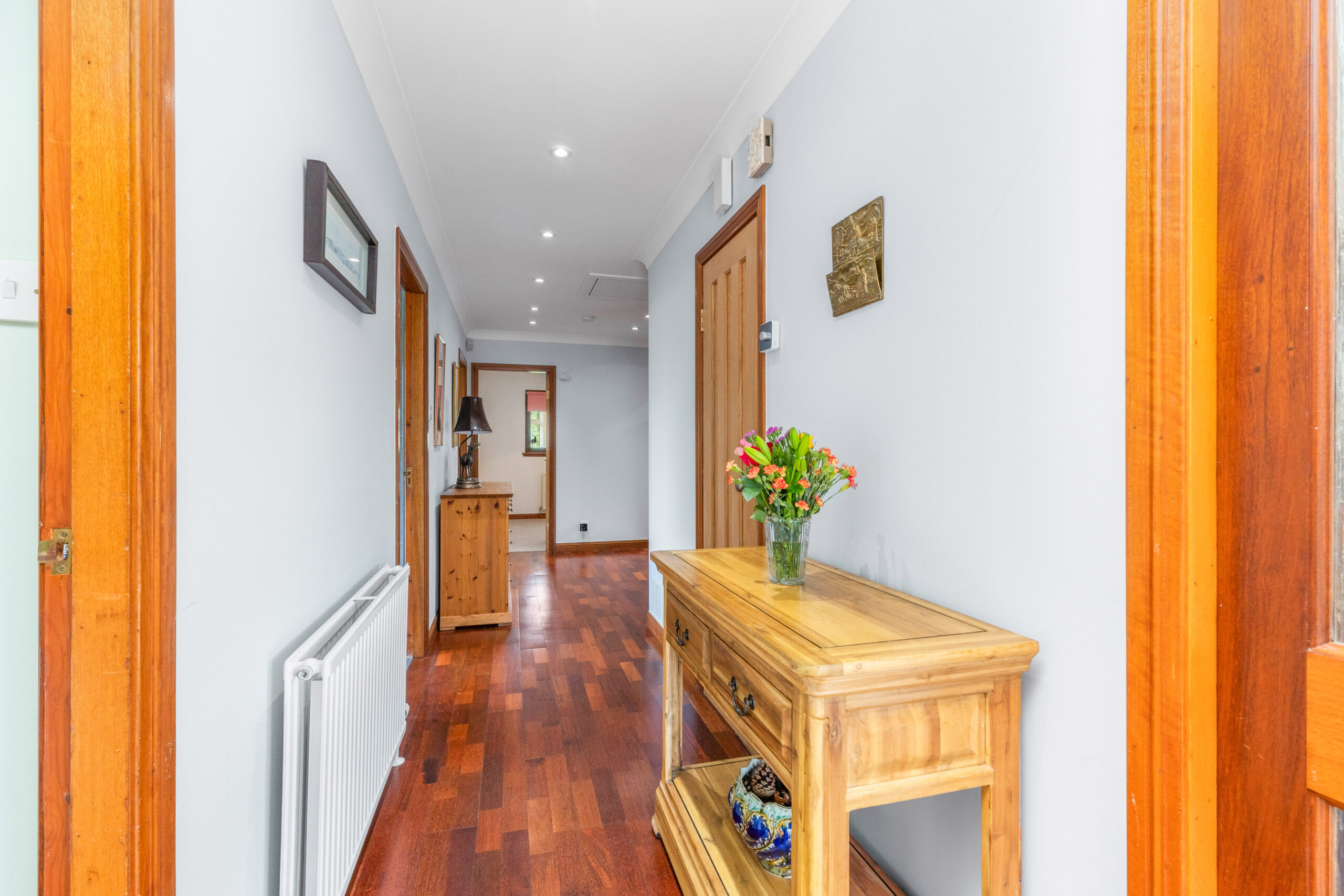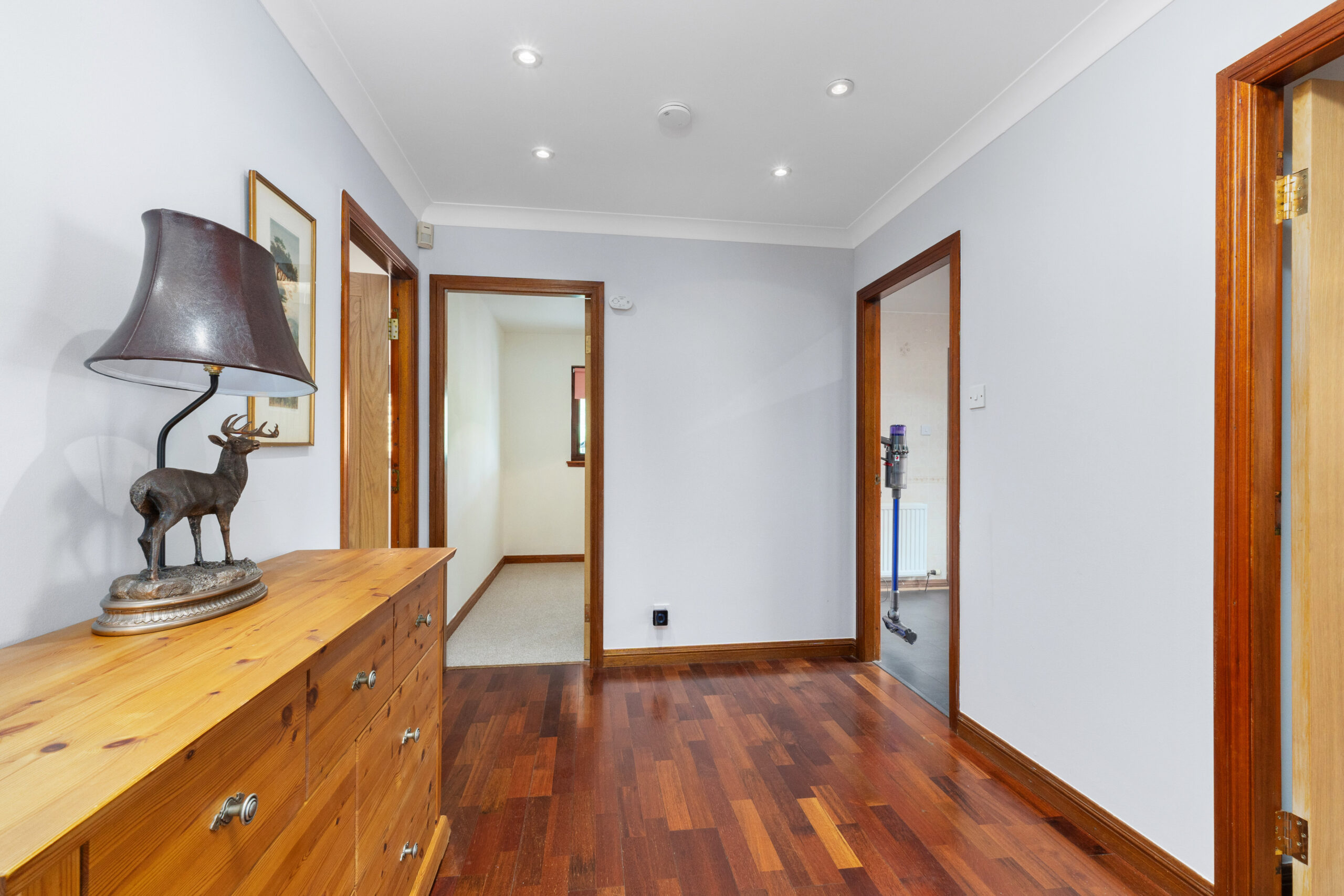 Step through the front door into a welcoming vestibule that opens into the main hallway, where rich hardwood flooring runs underfoot and a sense of warmth and flow is immediately felt. Two built-in store cupboards provide excellent storage, with one discreetly housing the boiler. A ceiling hatch offers access to the loft space above, while elegant double doors lead you into the heart of the home-the formal lounge.