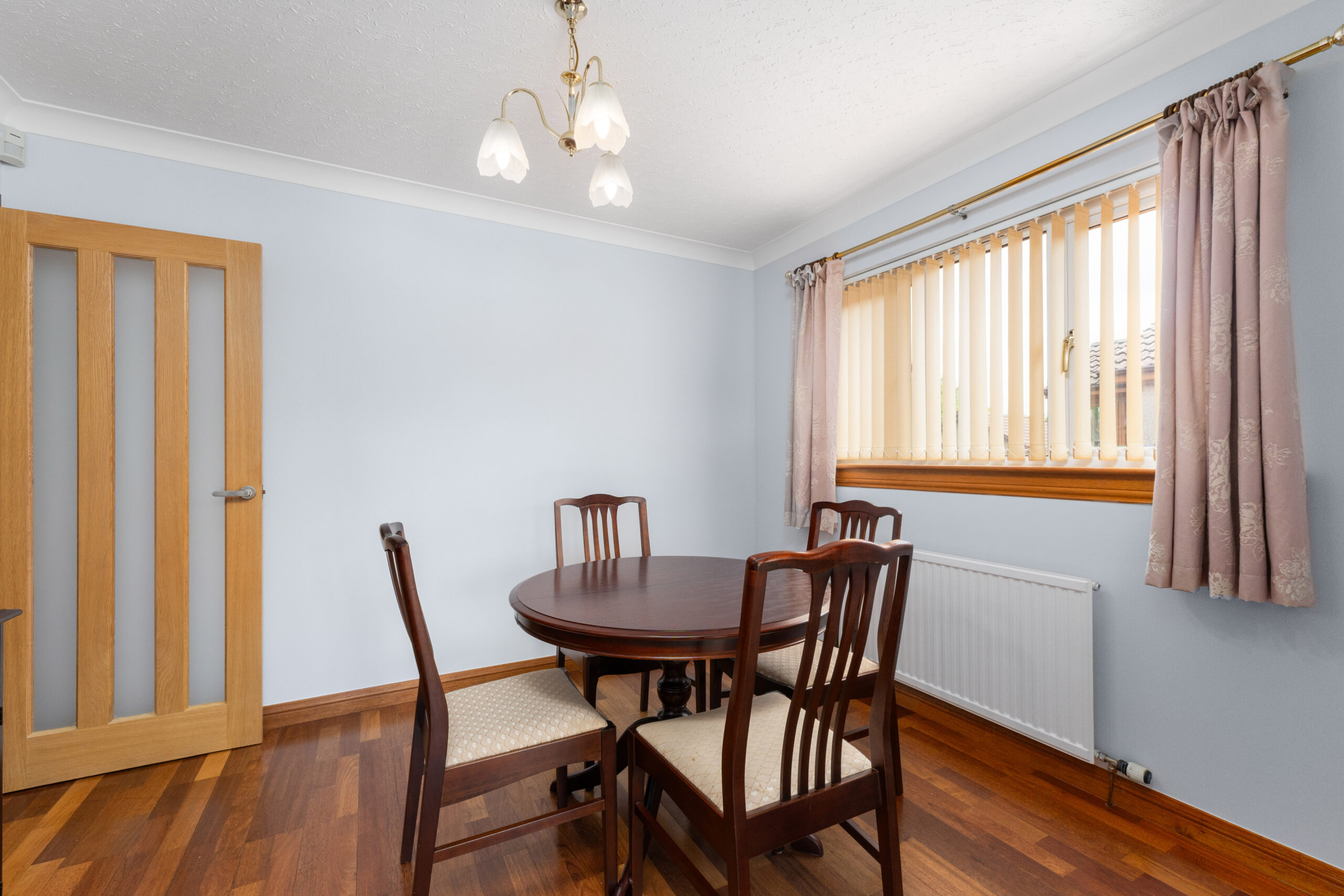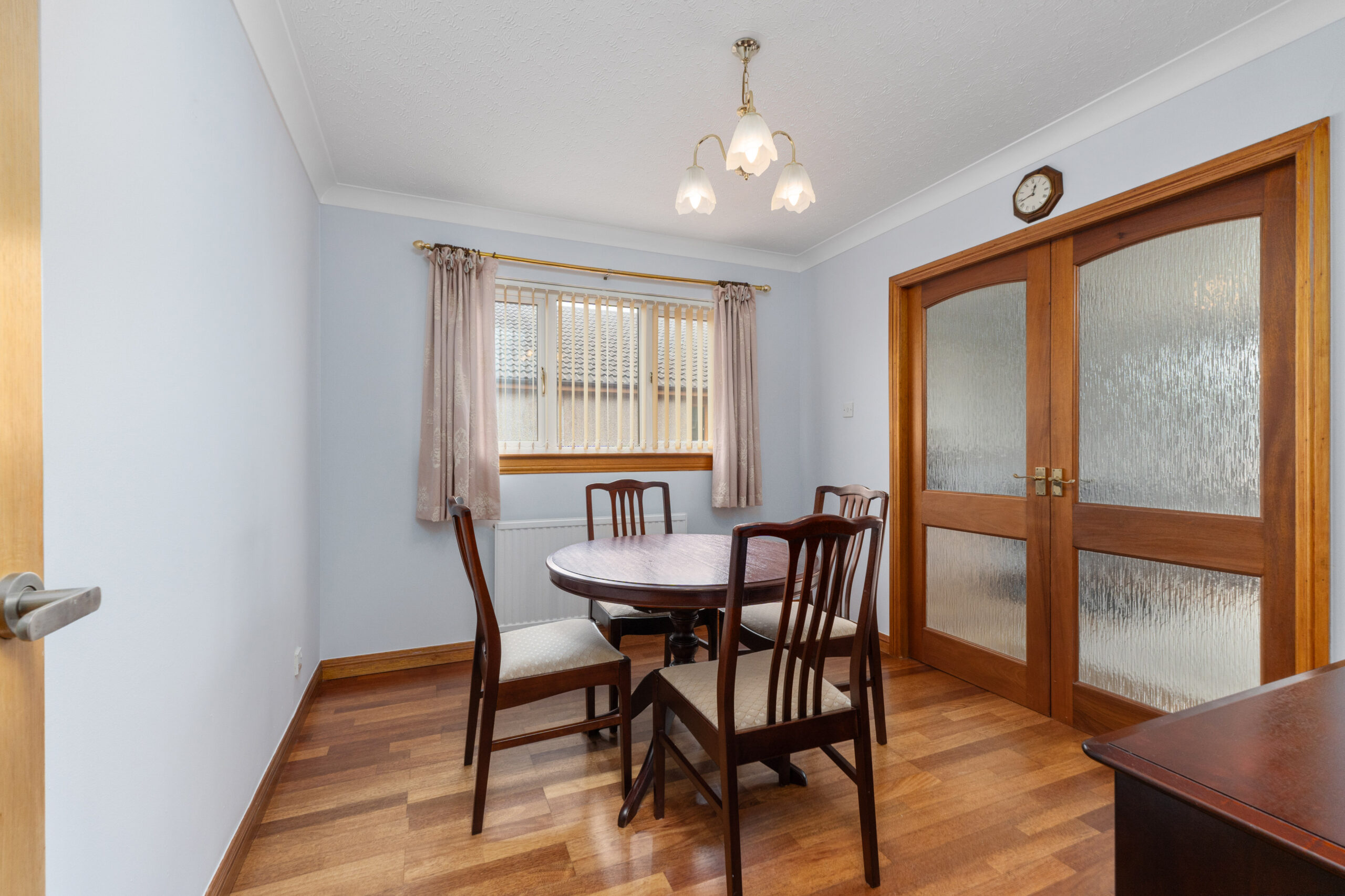 Bathed in natural light from a large front-facing window, the lounge is an inviting space with a calm, neutral palette and a striking wood-burning stove, creating the perfect focal point for cosy evenings. Finished with hardwood flooring, the lounge connects to the formal dining room via a set of double doors, offering the option for open-plan entertaining or quiet separation. The dining room also features hardwood flooring and offers great versatility-ideal as a traditional dining space, home office, playroom or snug, depending on your needs.