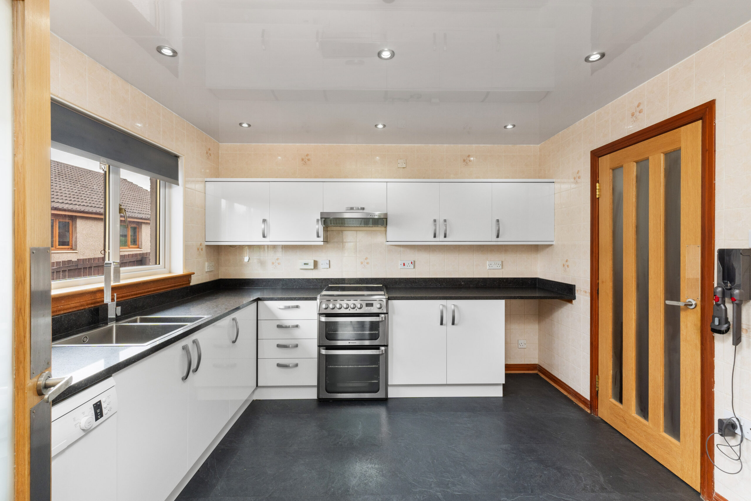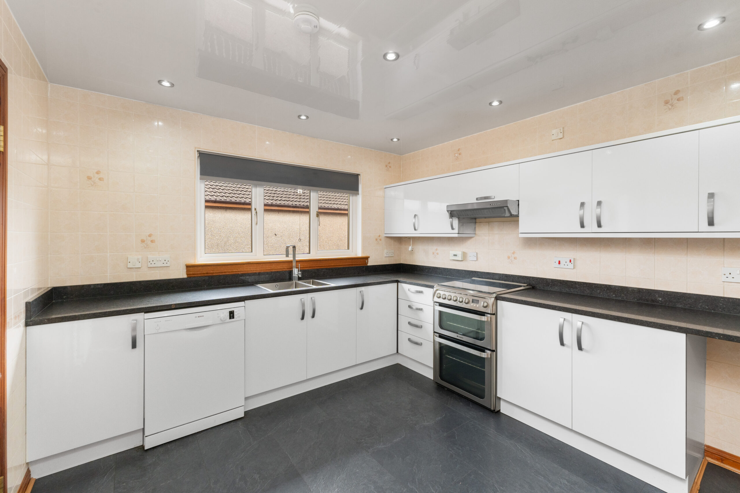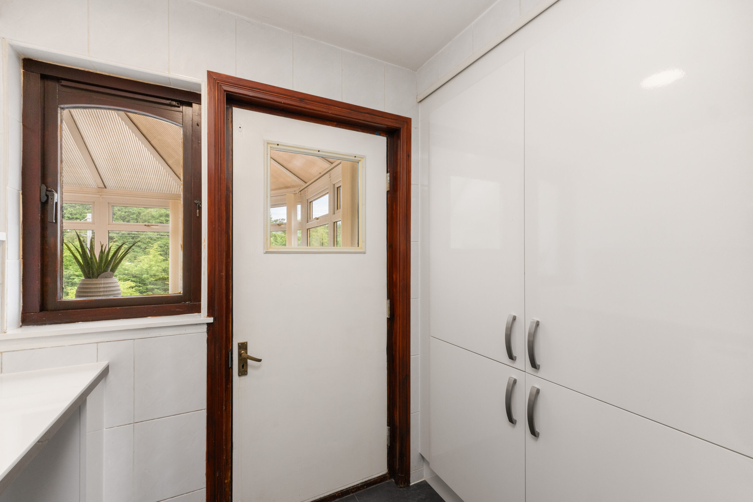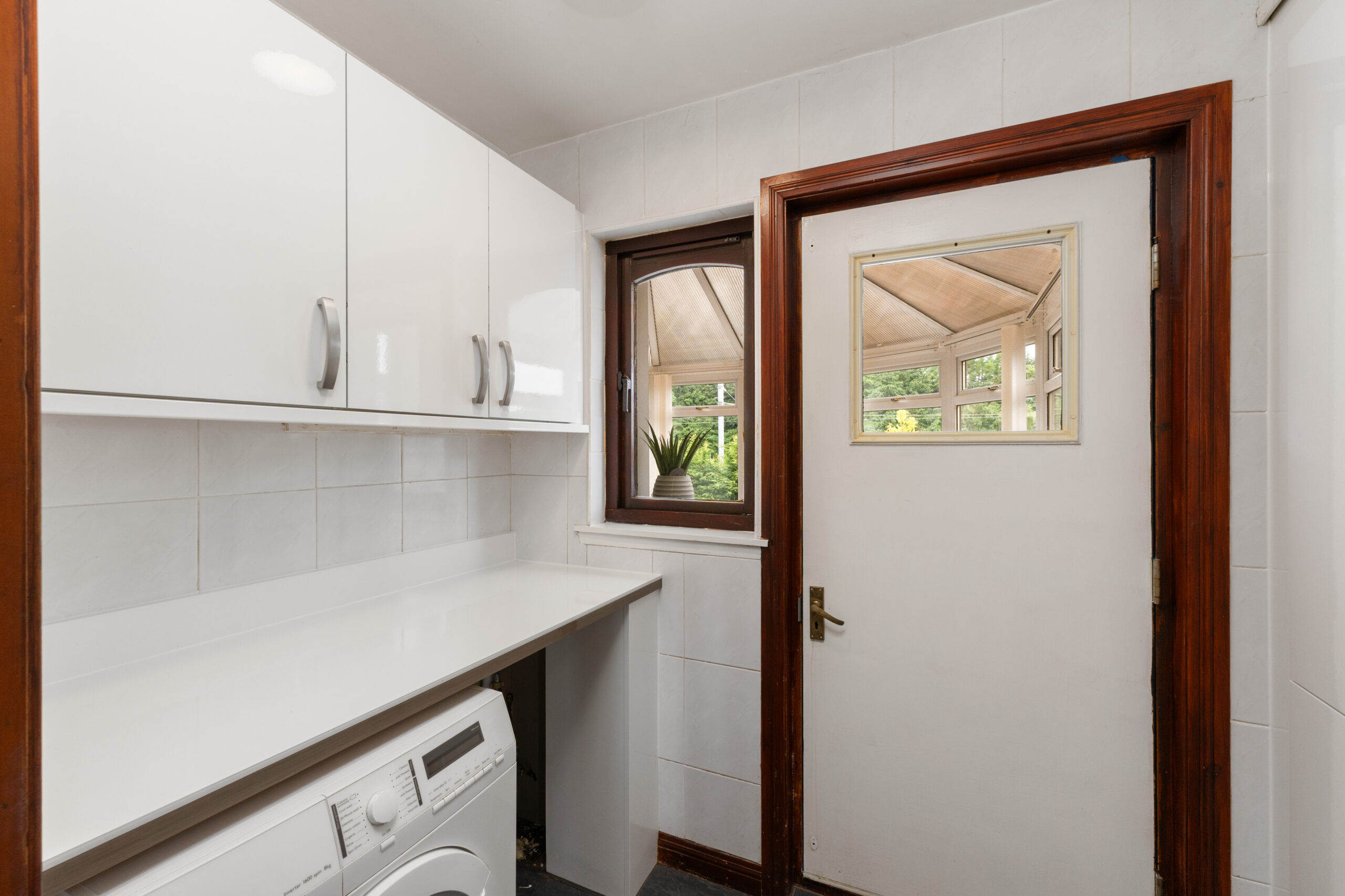 The kitchen is fitted with sleek white high-gloss base and wall units, providing ample storage and workspace. There is room for a free-standing cooker, fridge, and dishwasher, with tiled walls offering a practical backdrop. A door leads into the utility room, where additional storage and plumbing for a washing machine can be found, keeping the main kitchen area clutter-free.