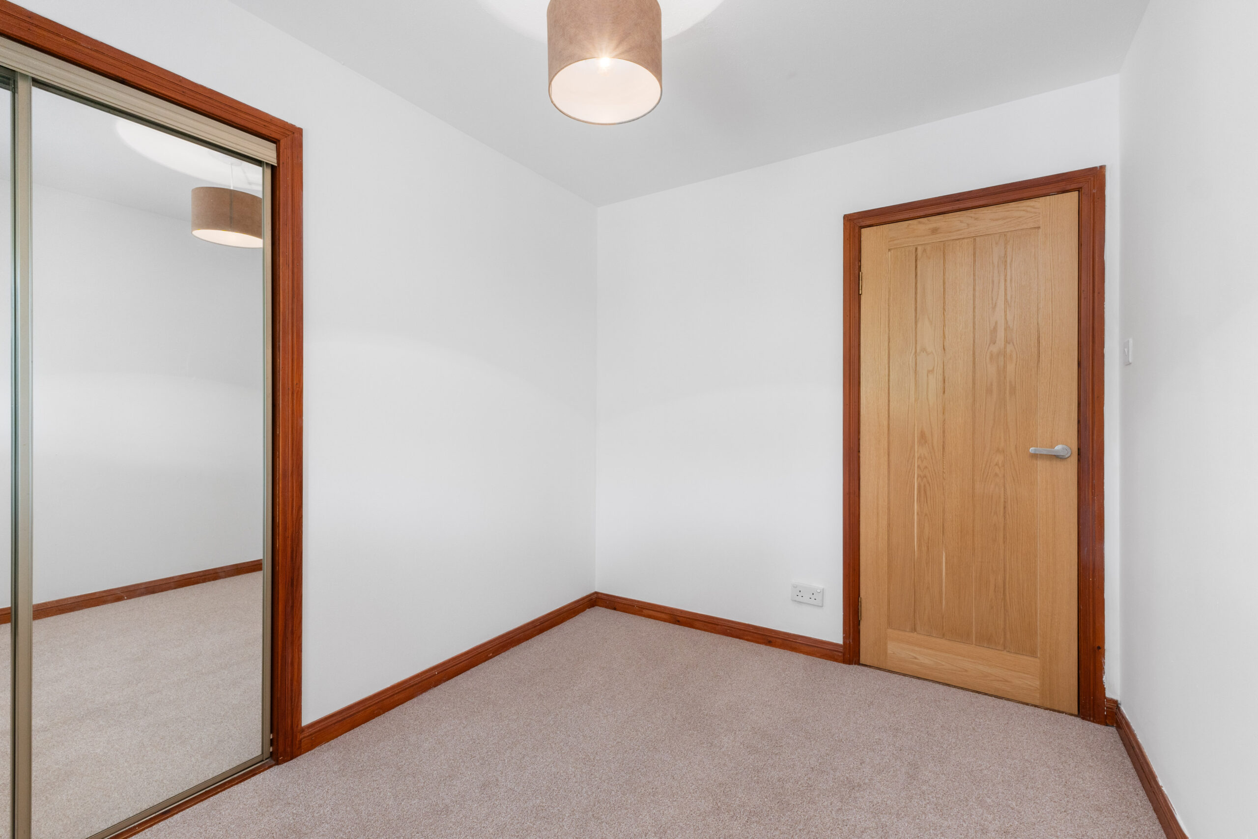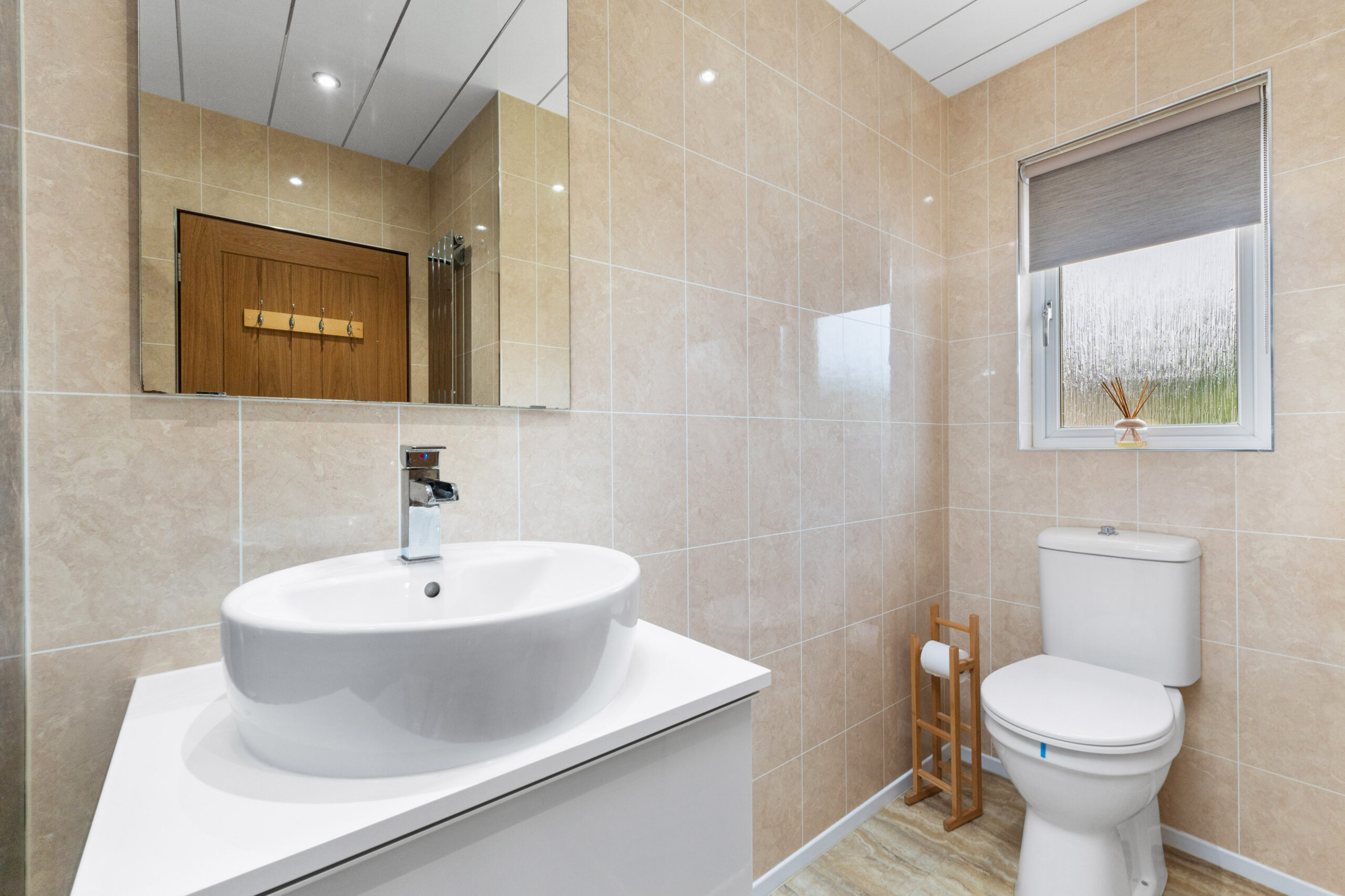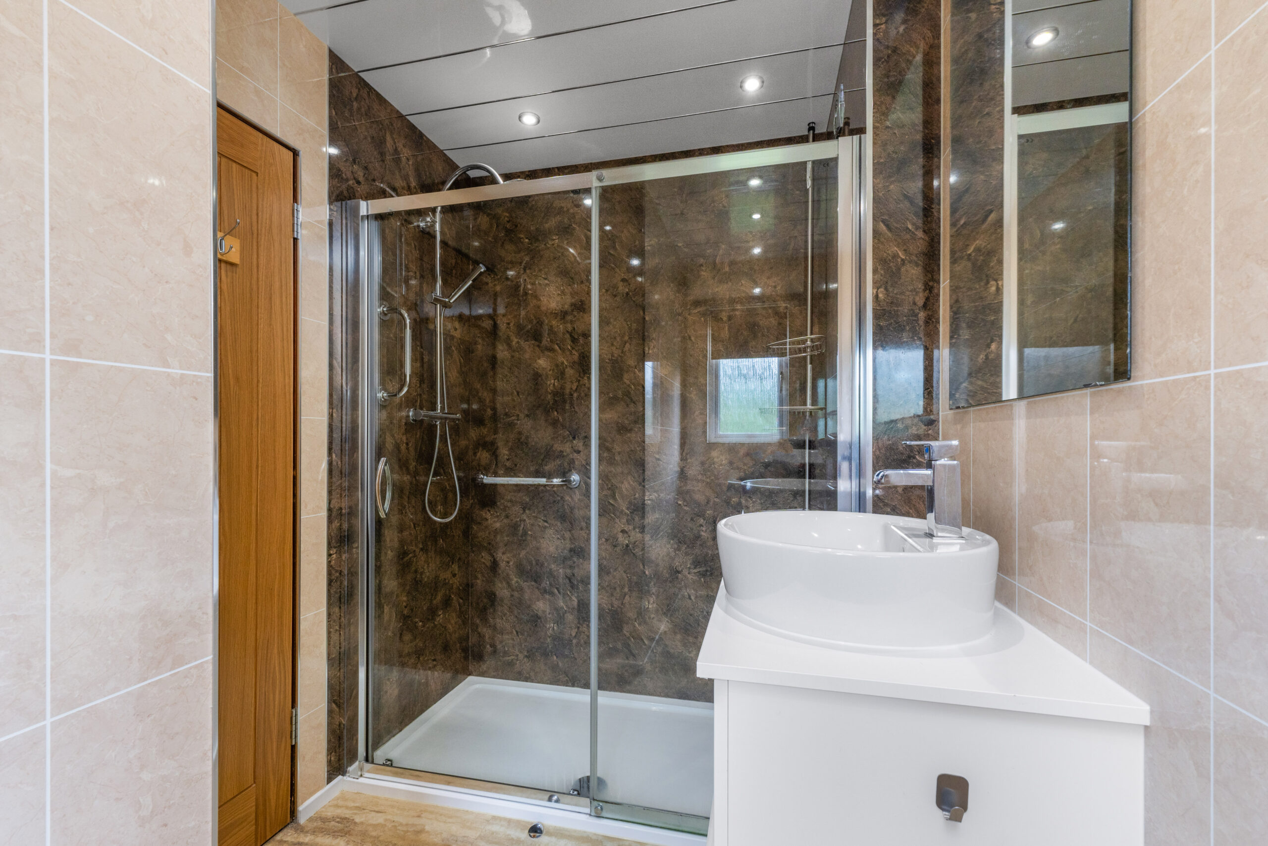 The property offers three generous double bedrooms, all beautifully finished and thoughtfully designed for comfort. The master bedroom features soft neutral decor, fitted mirrored wardrobes and the added luxury of an en suite. This stylish en suite includes a double shower enclosure, a high-gloss vanity unit with circular basin, and a white three-piece suite, all complemented by a chic combination of modern tiles and wet wall panelling, with a panelled ceiling and spotlighting adding to the contemporary finish. Bedrooms two and three also boast excellent proportions, mirrored wardrobes, and soft carpets underfoot.
