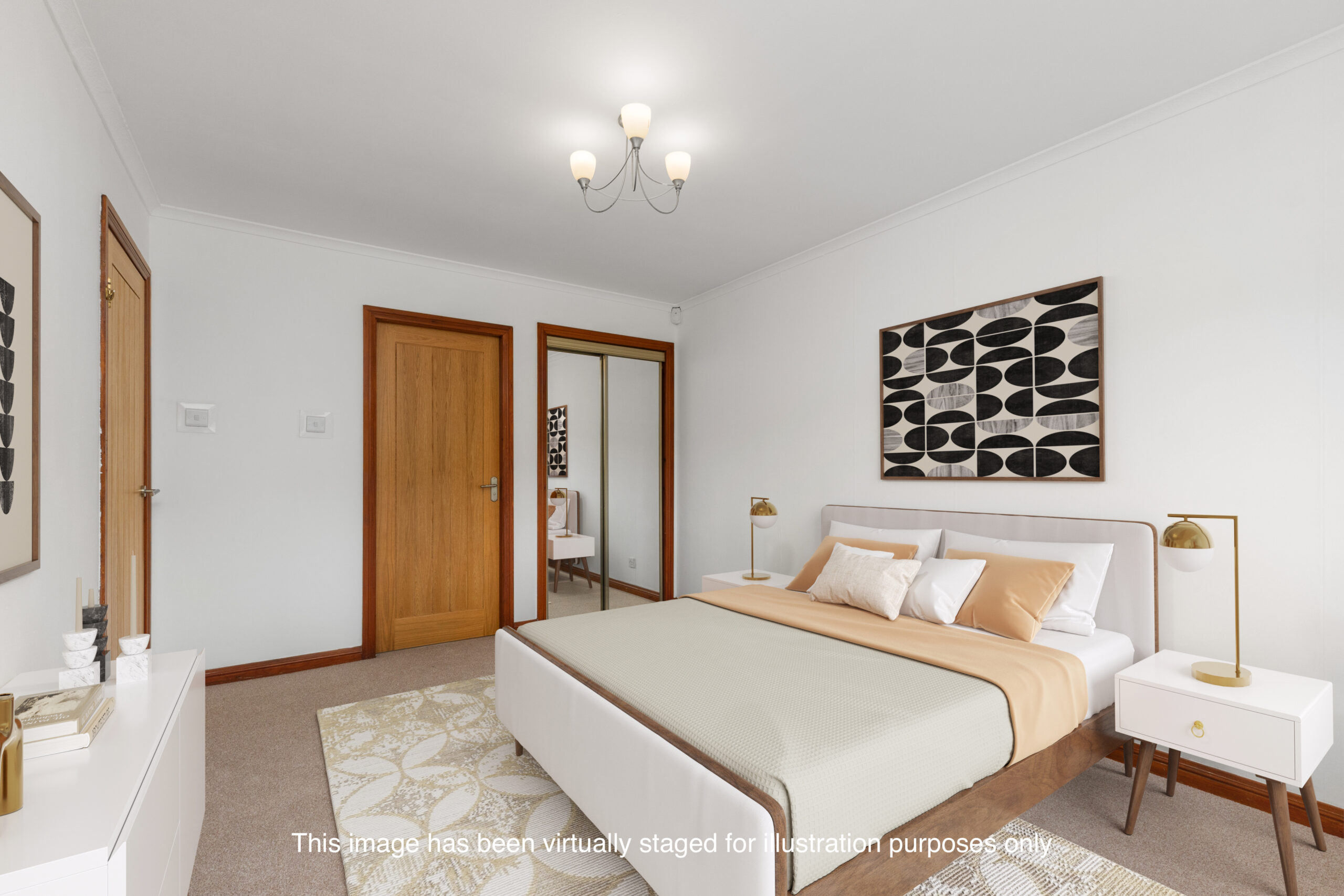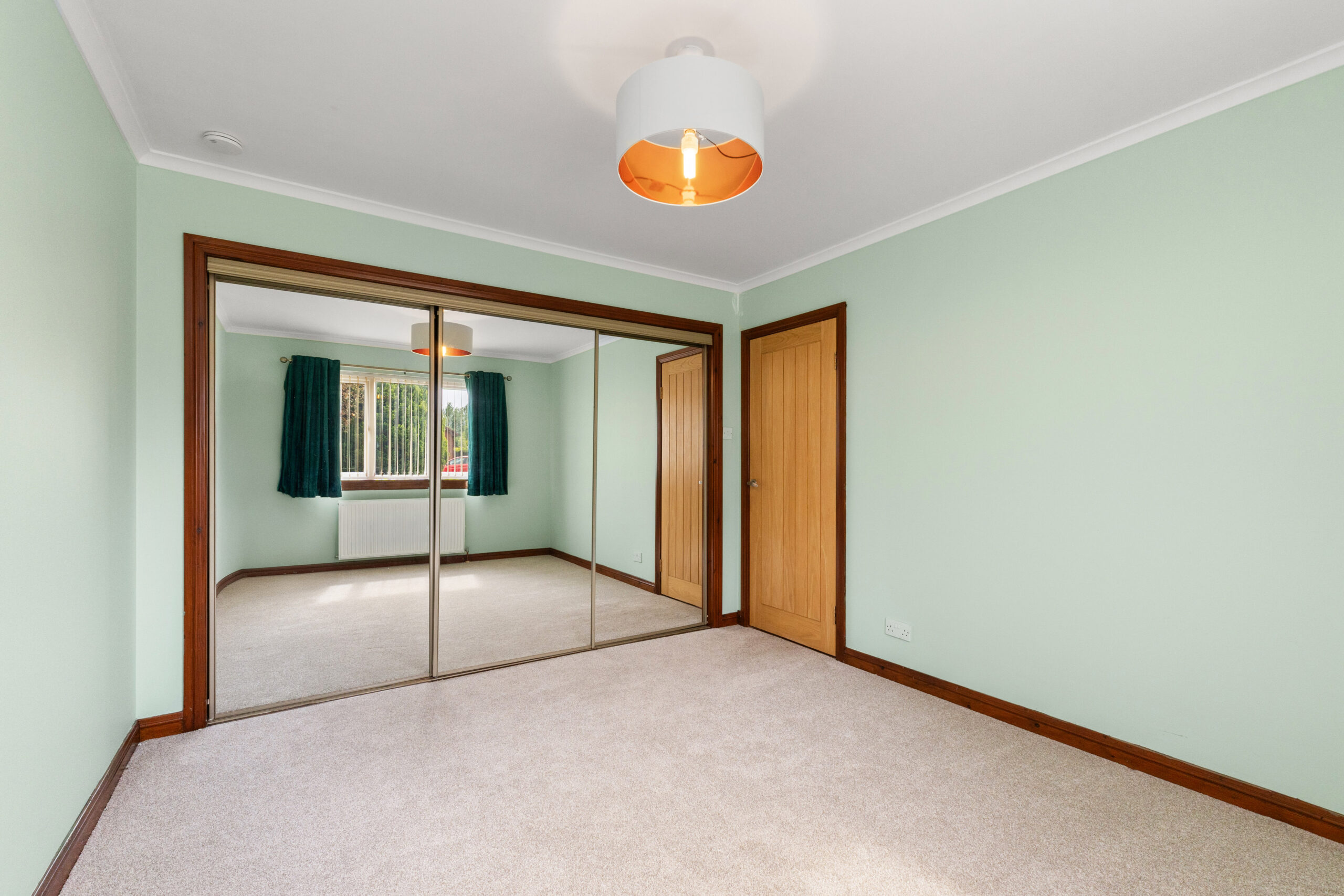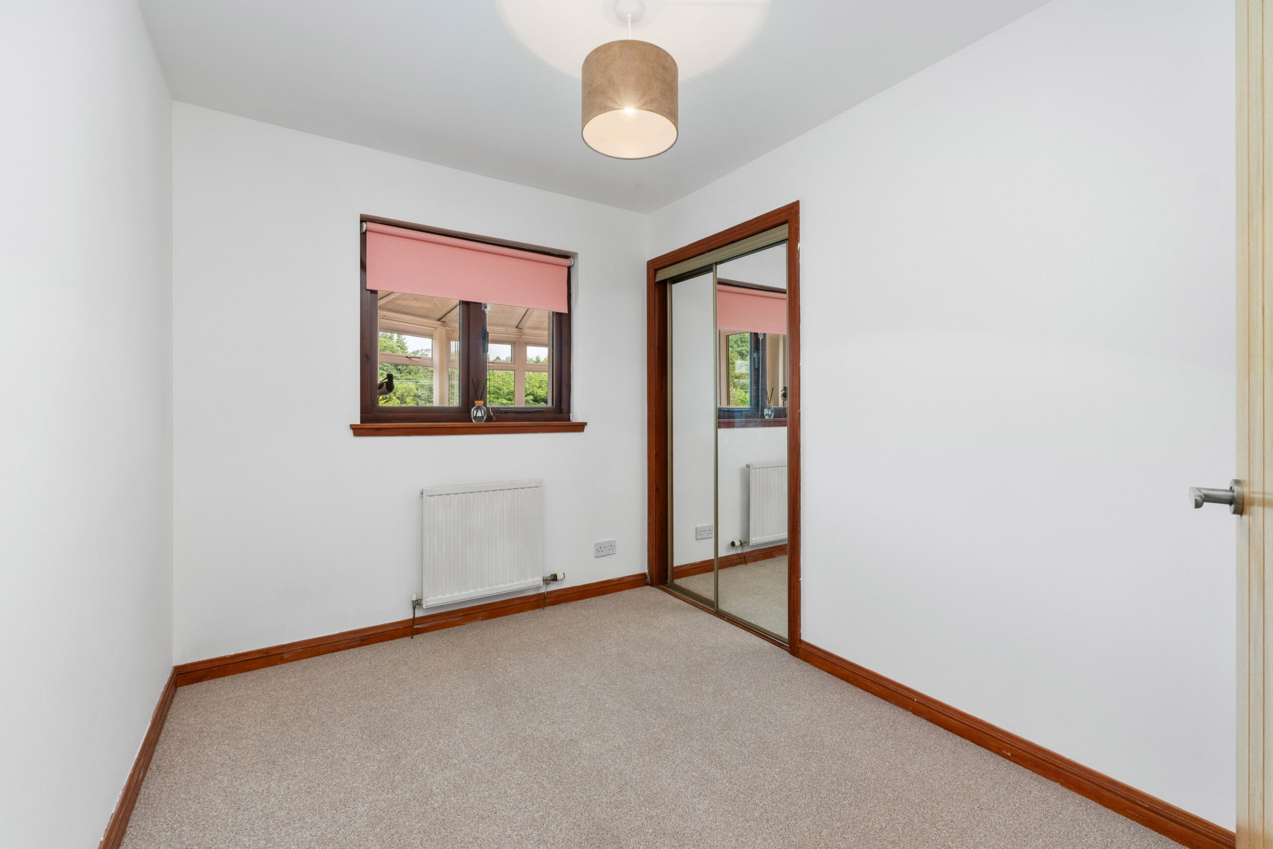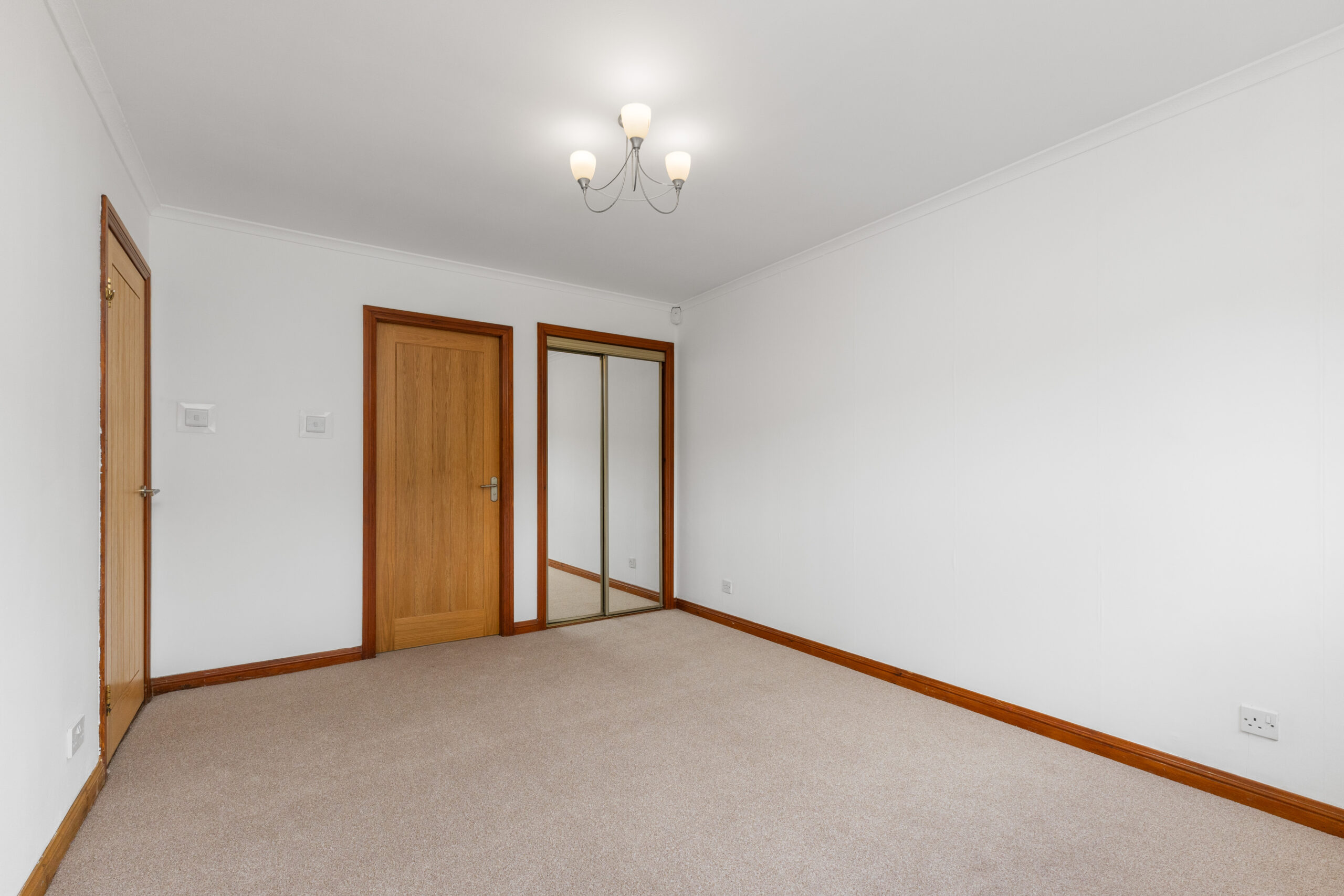 The property offers three generous double bedrooms, all beautifully finished and thoughtfully designed for comfort. The master bedroom features soft neutral decor, fitted mirrored wardrobes and the added luxury of an en suite. This stylish en suite includes a double shower enclosure, a high-gloss vanity unit with circular basin, and a white three-piece suite, all complemented by a chic combination of modern tiles and wet wall panelling, with a panelled ceiling and spotlighting adding to the contemporary finish. Bedrooms two and three also boast excellent proportions, mirrored wardrobes, and soft carpets underfoot.