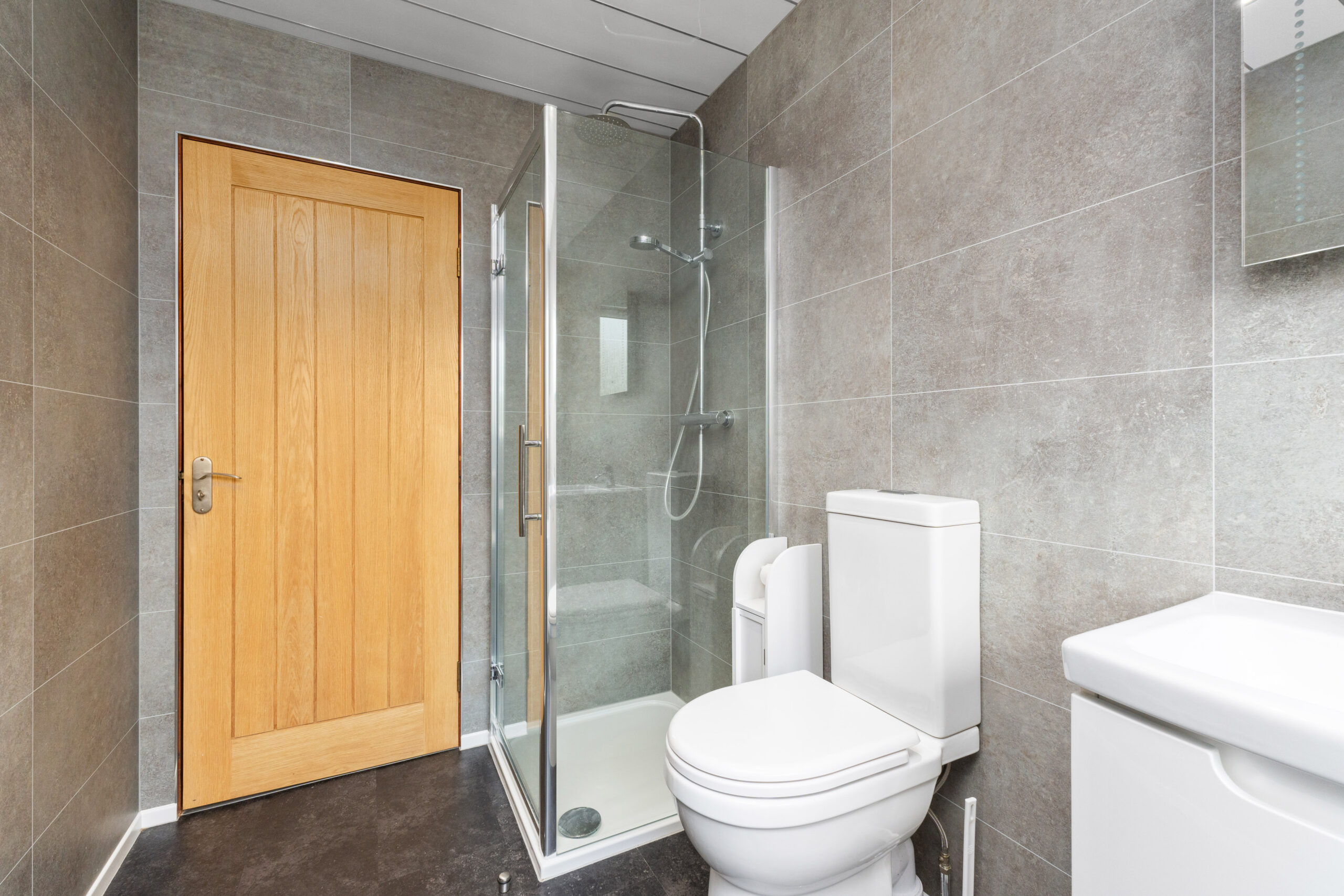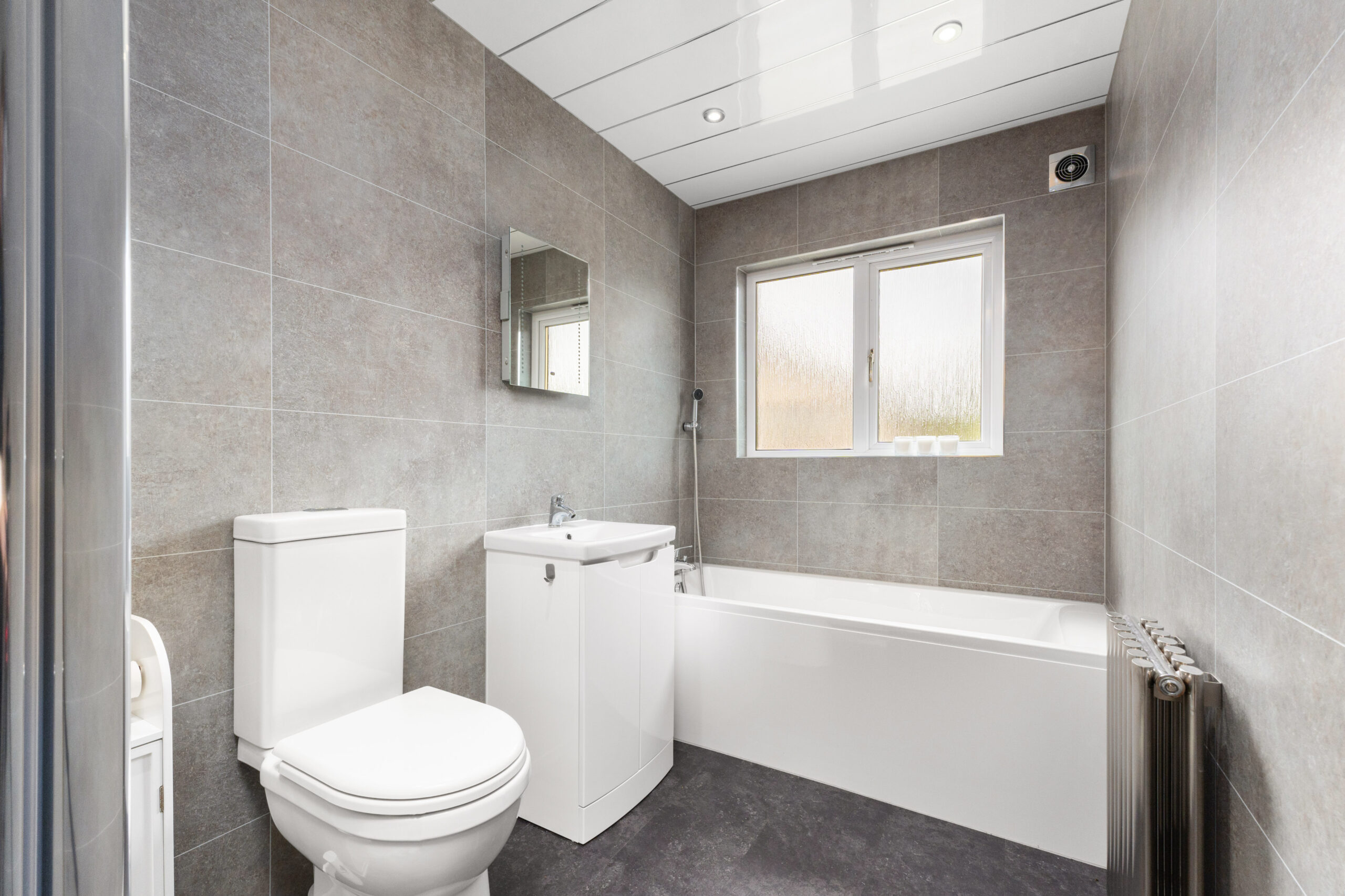 The main bathroom provides a striking, modern feel, featuring a crisp white four-piece suite comprising a bath with hand-held shower head, a separate free-standing shower cubicle, toilet, and sink-all set against contemporary grey wet wall panelling and a panelled ceiling with recessed lighting, creating a relaxing and stylish environment.