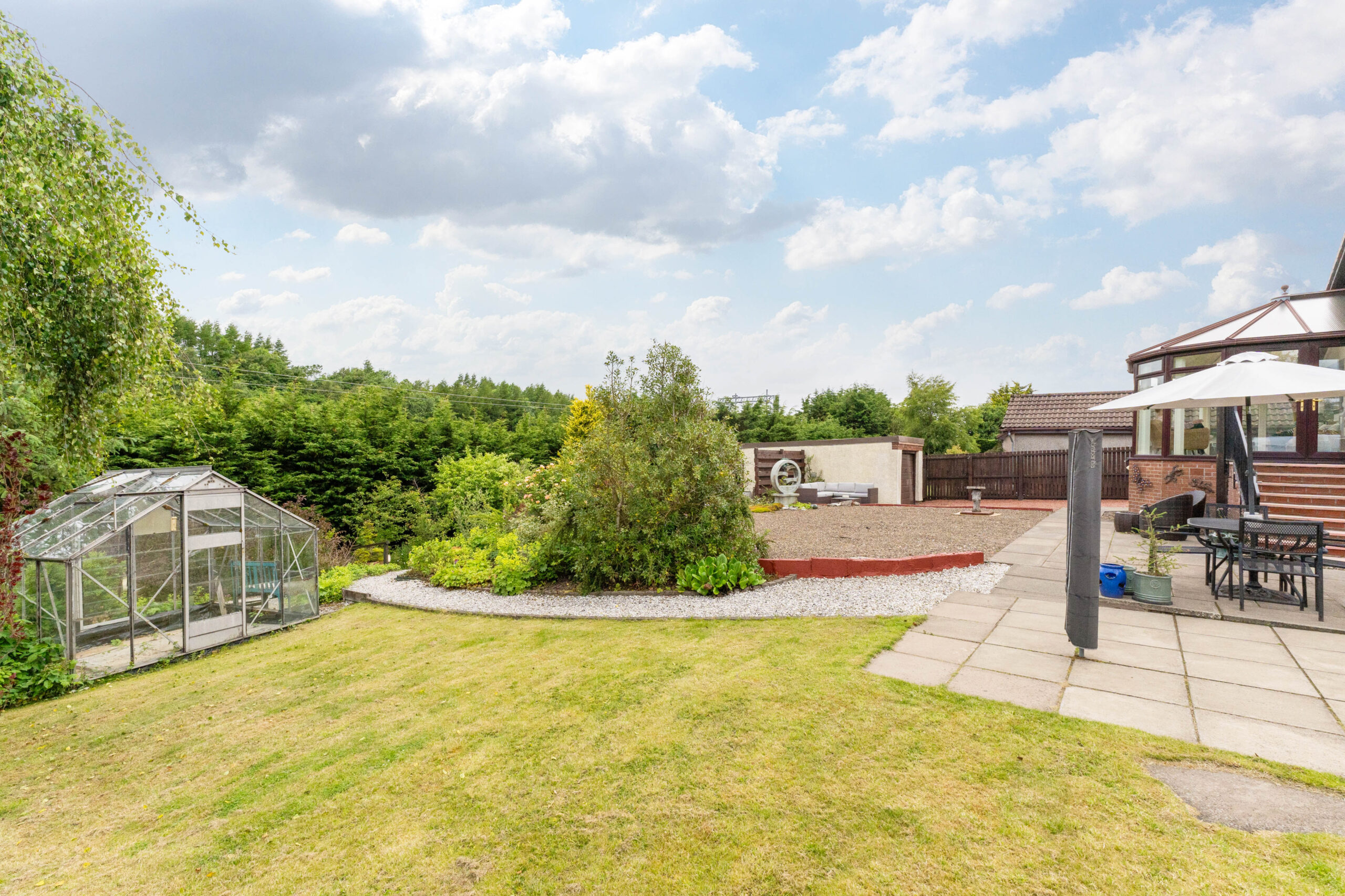 Extras: Floor coverings, blinds, curtains, light fittings, integrated oven, hob, hood, free-standing cooker, dishwasher, washing machine, greenhouse, water feature, poly tunnel, garden shed and metal table and chairs (no warranty)