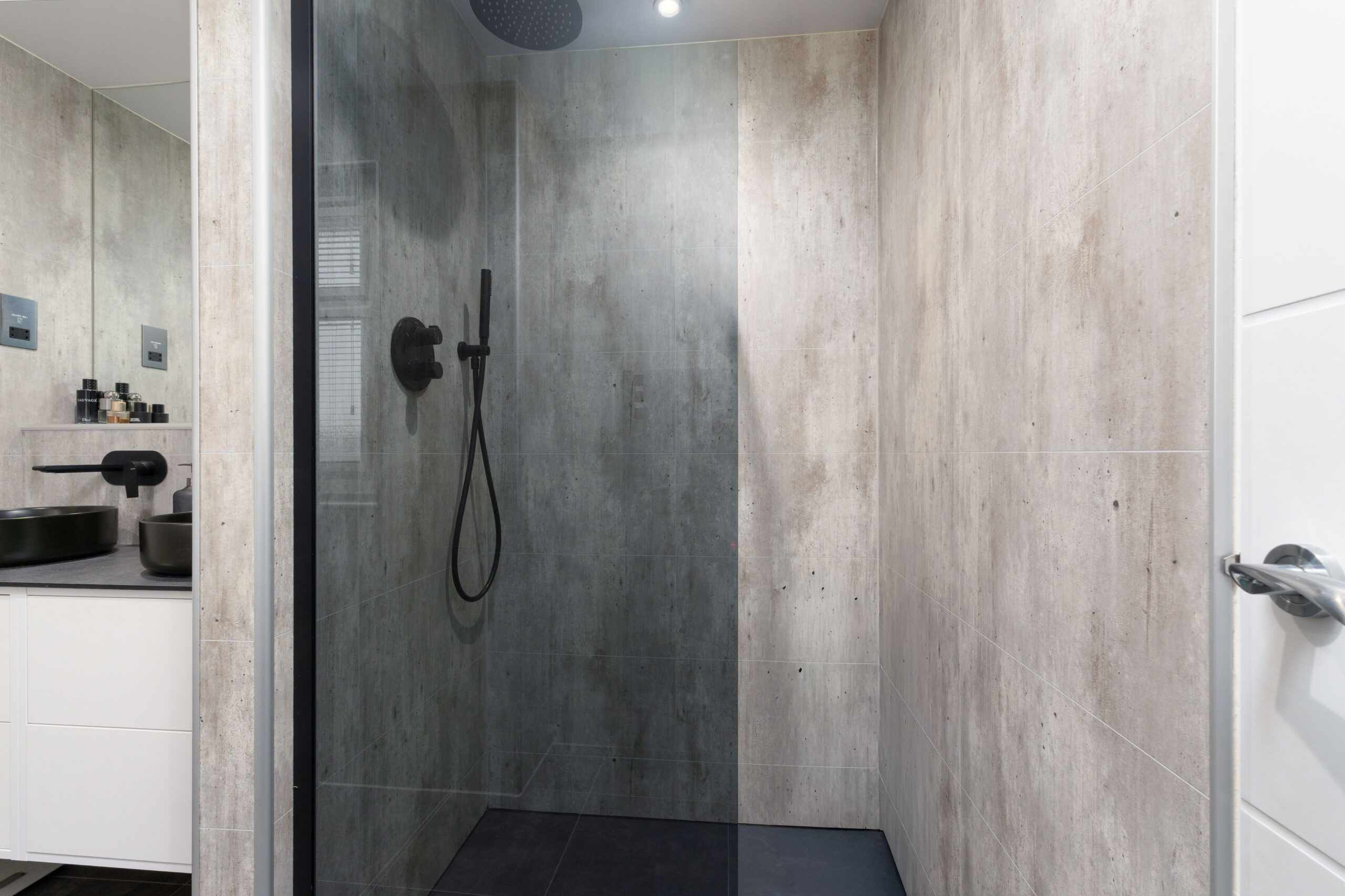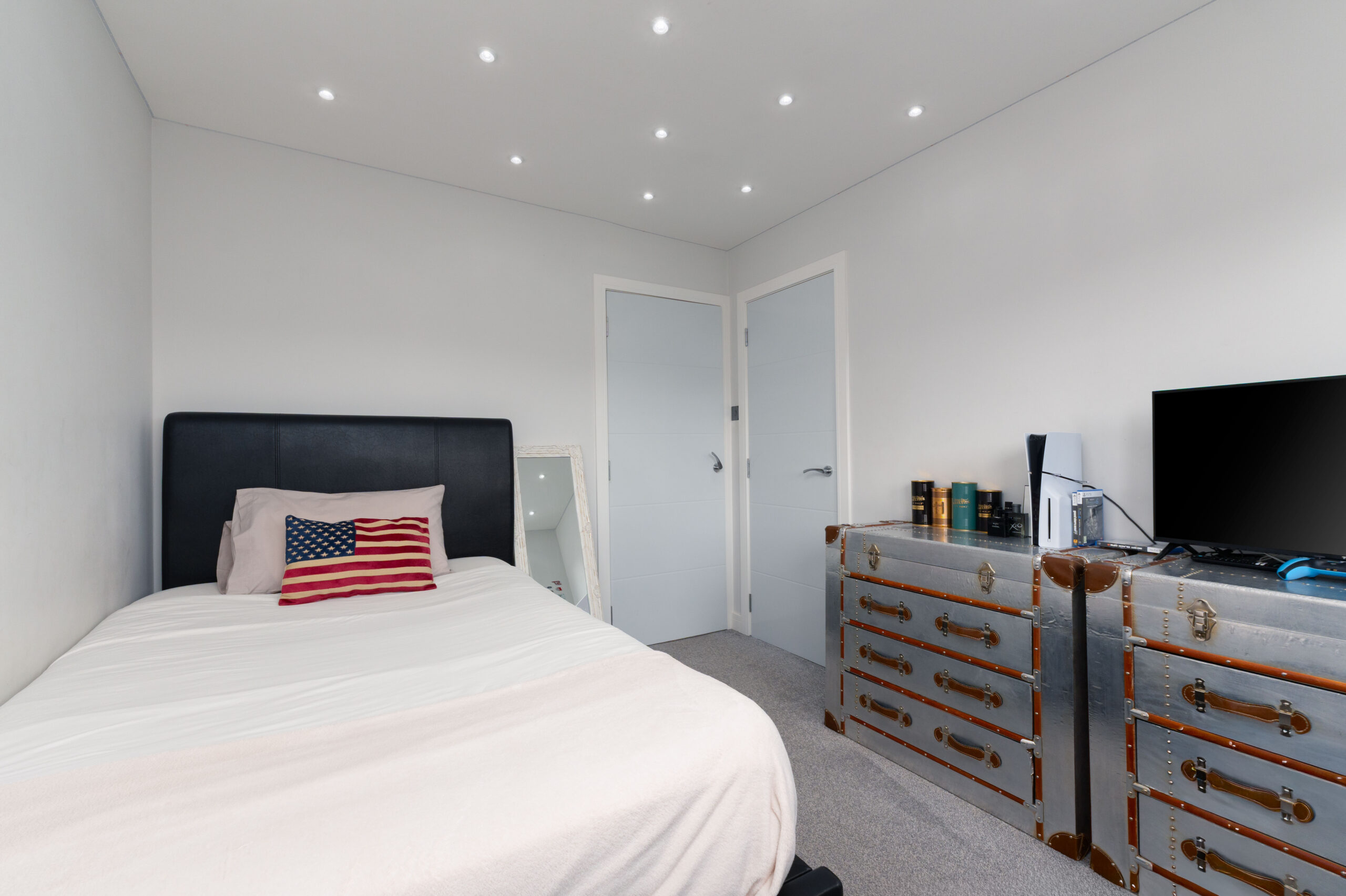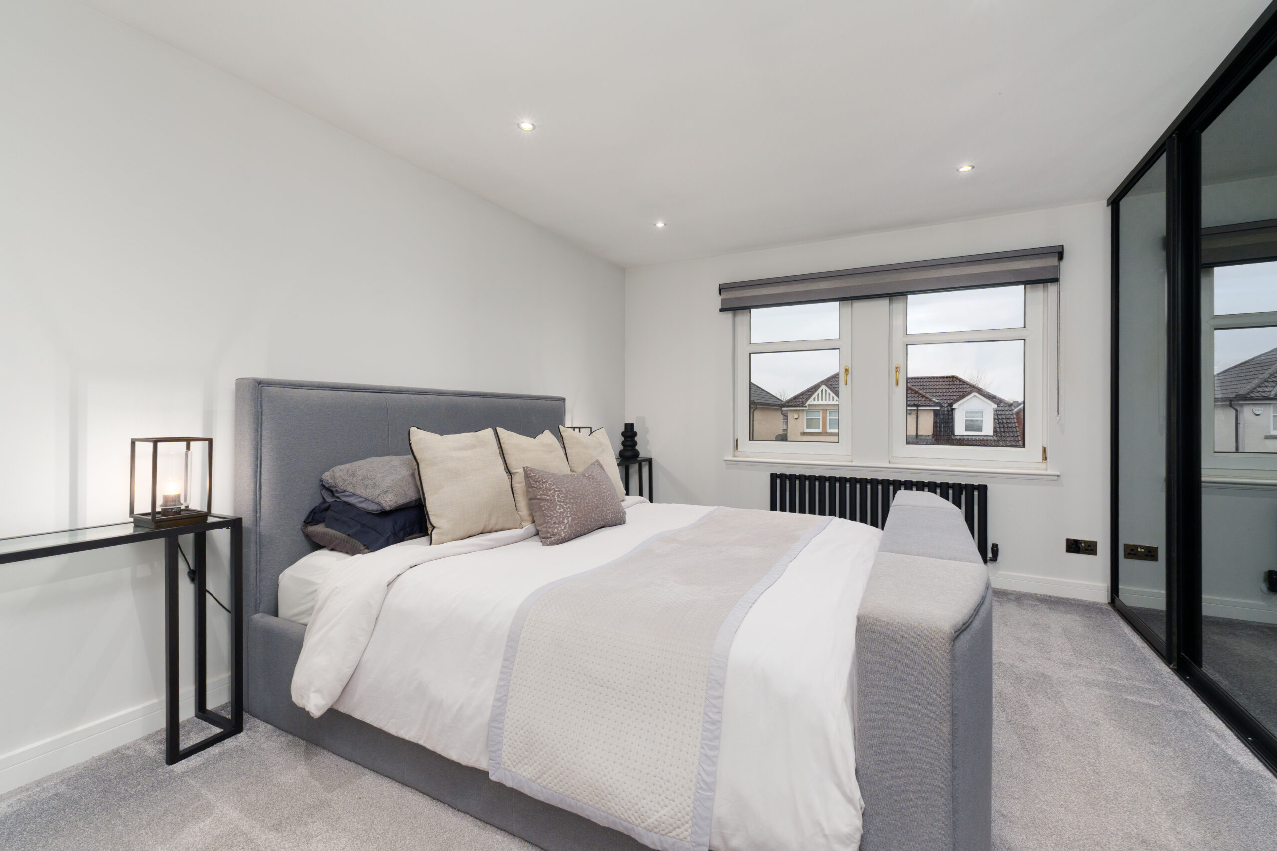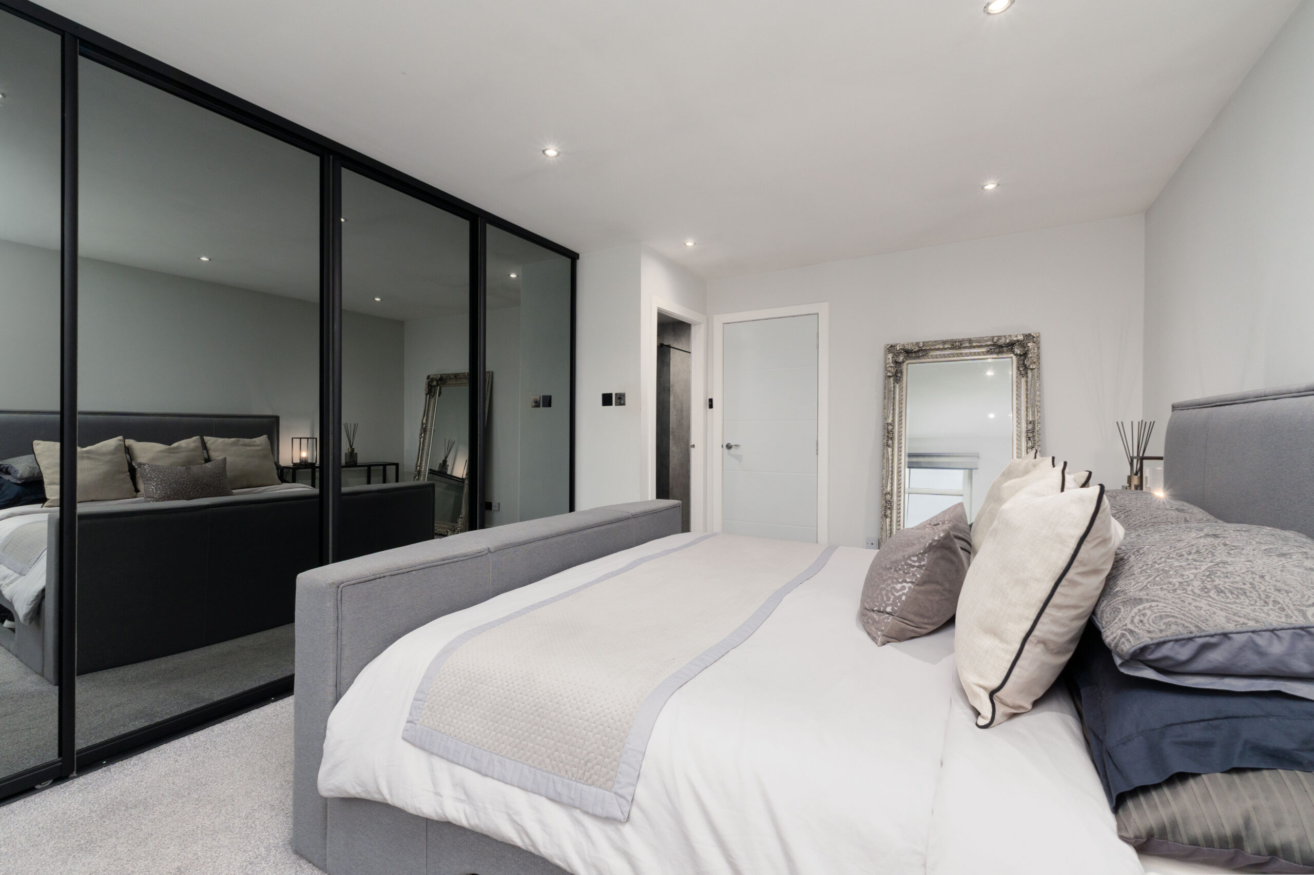 The principal bedroom is beautifully styled and features a full wall of black mirrored glass wardrobes, expertly fitted with drawers, hanging space and shelving. This room also benefits from a stunning en suite, finished to a spa-like standard. Wet wall panelling, a three-piece suite, black fixtures, a sleek black shower screen, double black sinks and a bespoke mirror combine to create a luxurious and striking space.