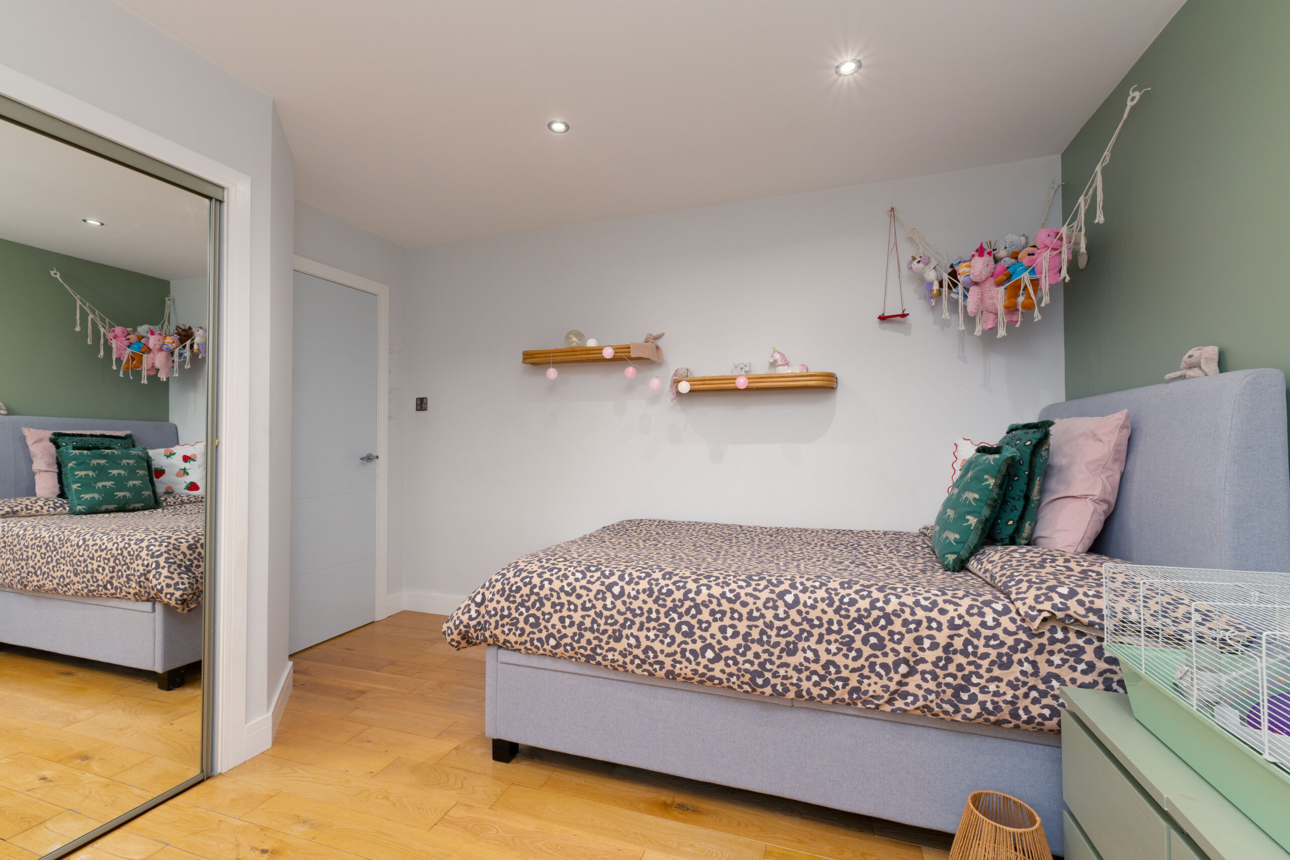 Bedrooms two, three and four are all well-proportioned, finished to a high standard and benefit from built-in storage, with plenty of space for additional free-standing furniture. The family bathroom is equally impressive, featuring a white free-standing bath, elegant wet wall panelling and a bespoke mirror, offering a calm and stylish space for relaxation.