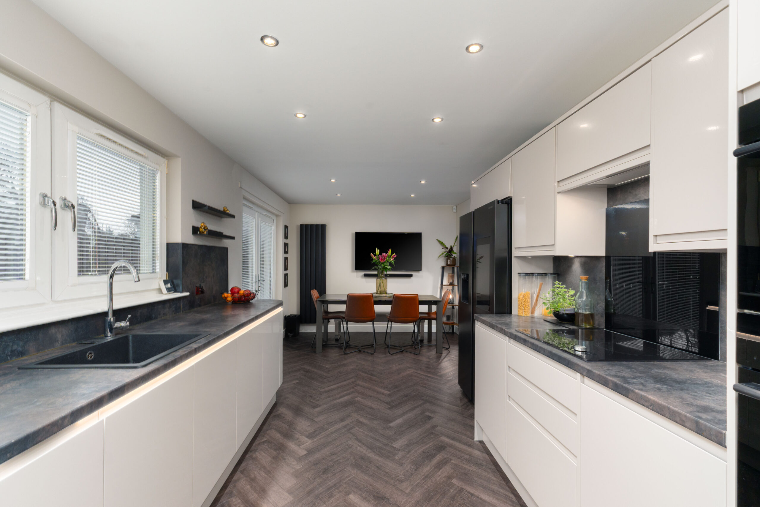 • Schedule Text: This exceptional detached family home is impeccably presented and finished to the very highest standard, offering true move-in-ready living in a superb setting. Every inch of the property has been carefully upgraded and thoughtfully styled, creating a home that feels luxurious, contemporary and effortlessly functional. From the outset, the home makes a strong first impression. Enhanced kerb appeal is provided by upgraded soffits and fascias, complemented by stylish external downlights that add ambience and impact. A generous double driveway sits alongside a neatly laid front lawn, while a double garage with power and lighting offers excellent practicality. The garage is accessed directly from the utility room and has been cleverly sectioned, creating a versatile space ideal for a home office, workshop or additional storage. The front door opens into a welcoming entrance vestibule, which leads into a cloakroom and a bright central hallway. From here, the quality of finish is immediately apparent, with stunning herringbone flooring flowing throughout the ground floor, setting the tone for the rest of the home. The hallway provides access to the lounge and the impressive kitchen/diner, with stairs rising to the upper level and a handy storage cupboard tucked neatly beneath. The lounge is a beautifully styled retreat, designed with comfort and relaxation in mind. Finished in rich, deep tones, the space feels warm and inviting, perfect for unwinding at the end of the day. A striking black slatted feature wall adds texture and depth. Generous proportions allow for a variety of furniture layouts, while the overall ambience is calm, cosy and effortlessly stylish - a room that truly invites you to slow down and relax. The heart of the home is undoubtedly the kitchen and dining space, a true showpiece ideal for modern family life and entertaining. Finished in elegant cashmere high-gloss units with soft curved cabinetry, the kitchen is complemented by co-ordinating worktops and a matching splashback for a seamless look. Integrated appliances include an induction hob, oven, microwave and dishwasher, while there is space for a premium American-style fridge freezer complete with a sleek, iPad-style touchscreen control panel, which is included within the sale price. LED lighting above the cabinets enhances both function and atmosphere, while French doors open directly onto the rear garden, flooding the space with natural light. There is ample room for a full-sized dining table and chairs, making this a perfect setting for family meals and social gatherings. A door leads through to the utility room, which provides space for a free-standing washing machine and dryer, keeping everyday practicality neatly tucked away. A door also provides access to the garden. Upstairs, the sense of quality continues throughout. The upper hallway leads to four generously proportioned bedrooms and benefits from another store cupboard ideal for linen and household items to be neatly stored away. There is access to the loft via a hatch, with the loft partially floored, offering excellent additional storage. The principal bedroom is beautifully styled and features a full wall of black mirrored glass wardrobes, expertly fitted with drawers, hanging space and shelving. This room also benefits from a stunning en suite, finished to a spa-like standard. Wet wall panelling, a three-piece suite, black fixtures, a sleek black shower screen, double black sinks and a bespoke mirror combine to create a luxurious and striking space.