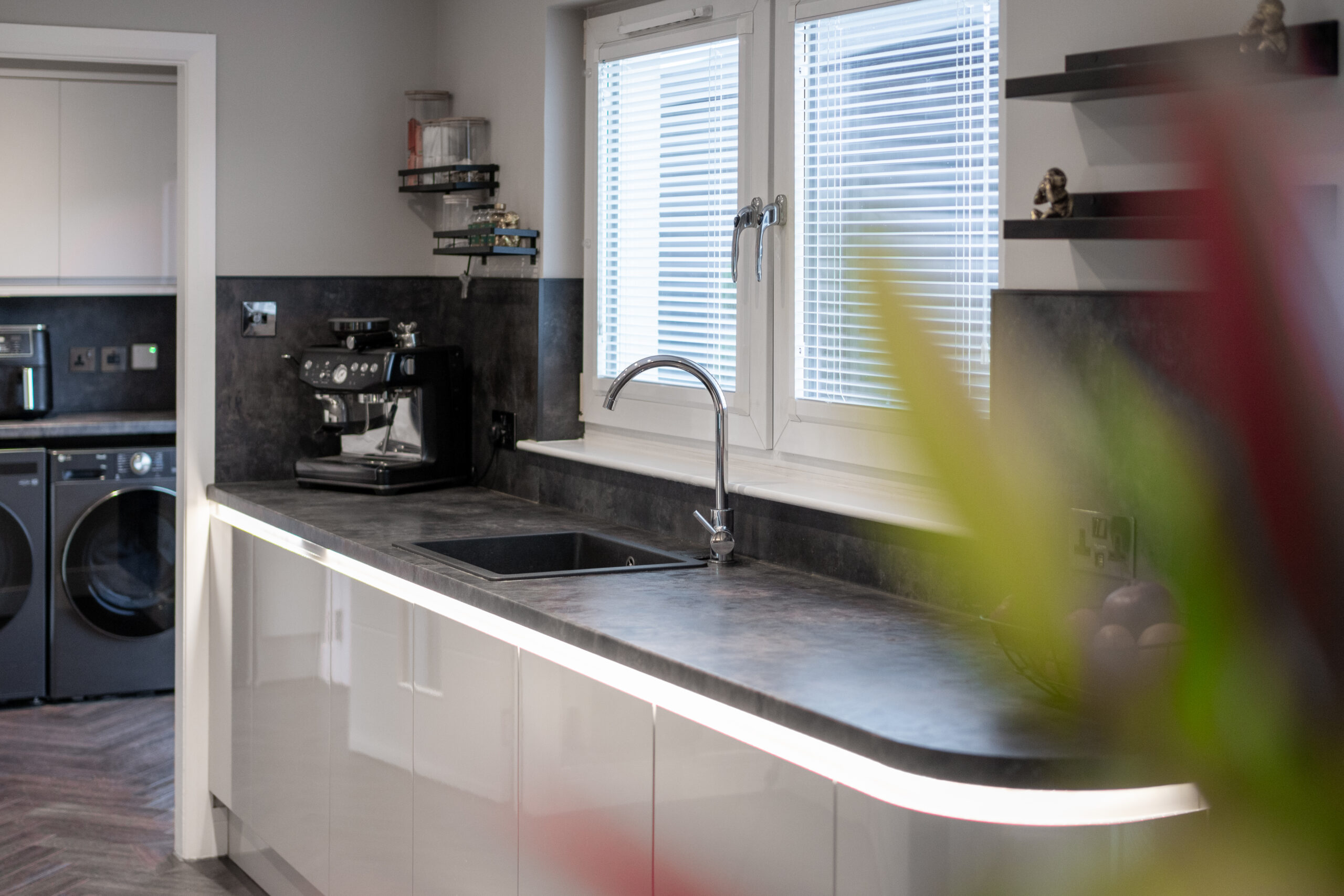 The heart of the home is undoubtedly the kitchen and dining space, a true showpiece ideal for modern family life and entertaining. Finished in elegant cashmere high-gloss units with soft curved cabinetry, the kitchen is complemented by co-ordinating worktops and a matching splashback for a seamless look. Integrated appliances include an induction hob, oven, microwave and dishwasher, while there is space for a premium American-style fridge freezer complete with a sleek, iPad-style touchscreen control panel, which is included within the sale price. LED lighting above the cabinets enhances both function and atmosphere, while French doors open directly onto the rear garden, flooding the space with natural light. There is ample room for a full-sized dining table and chairs, making this a perfect setting for family meals and social gatherings. A door leads through to the utility room, which provides space for a free-standing washing machine and dryer, keeping everyday practicality neatly tucked away. A door also provides access to the garden.