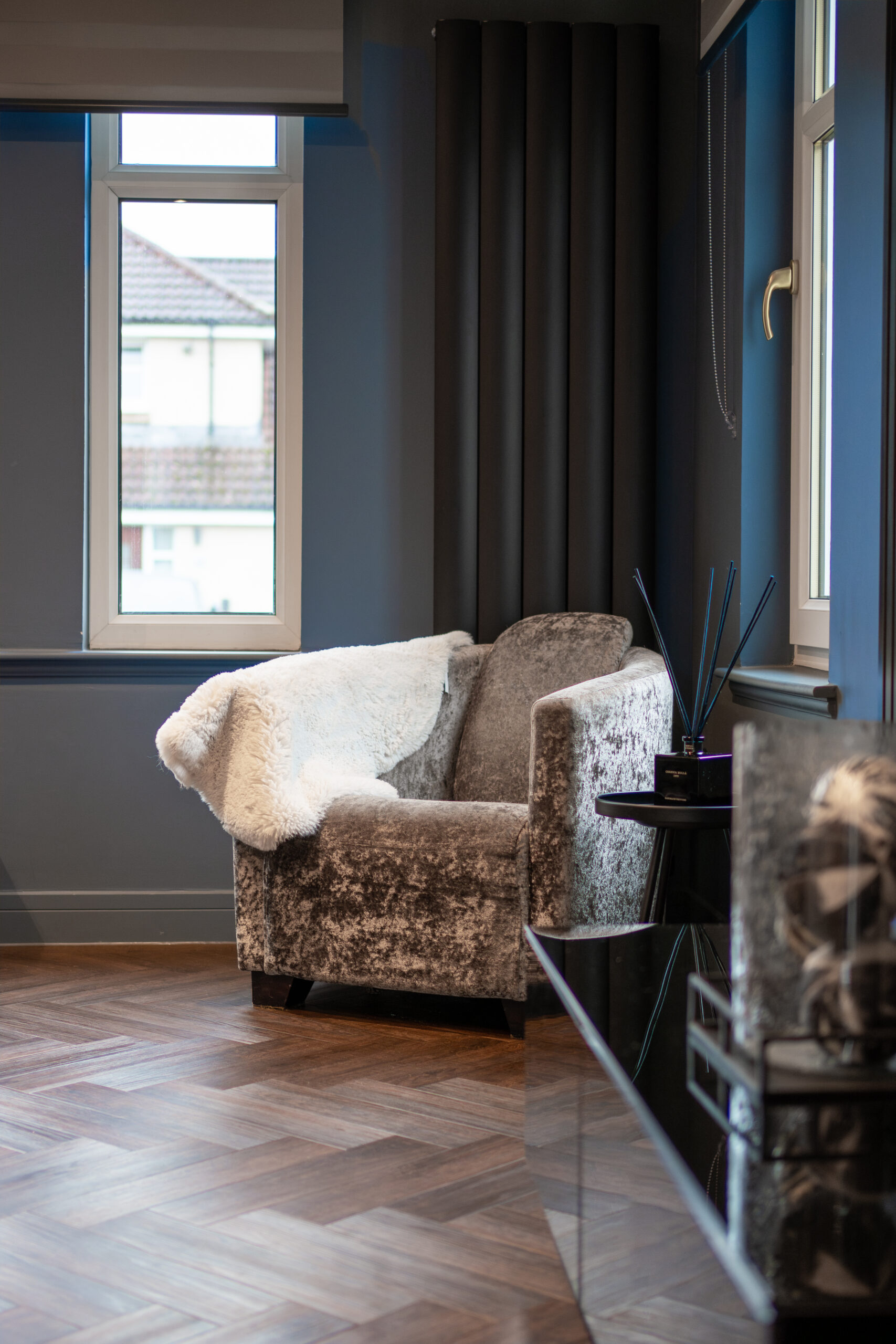 The lounge is a beautifully styled retreat, designed with comfort and relaxation in mind. Finished in rich, deep tones, the space feels warm and inviting, perfect for unwinding at the end of the day. A striking black slatted feature wall adds texture and depth. Generous proportions allow for a variety of furniture layouts, while the overall ambience is calm, cosy and effortlessly stylish - a room that truly invites you to slow down and relax.