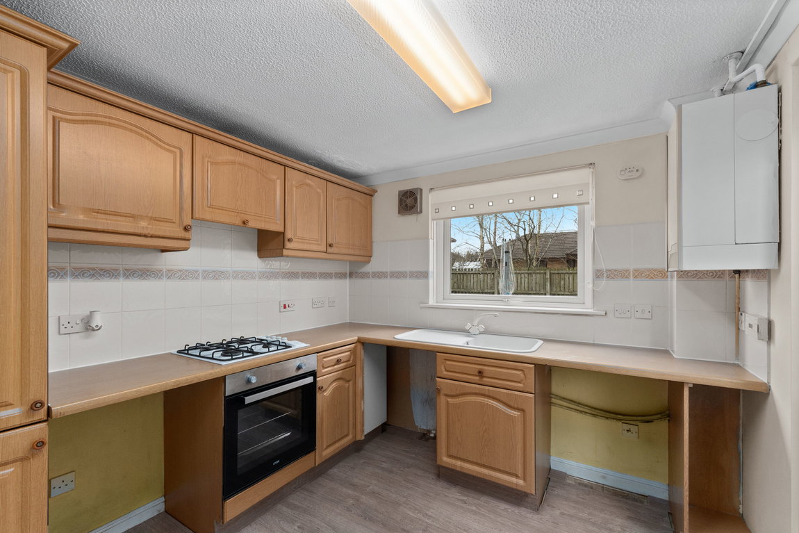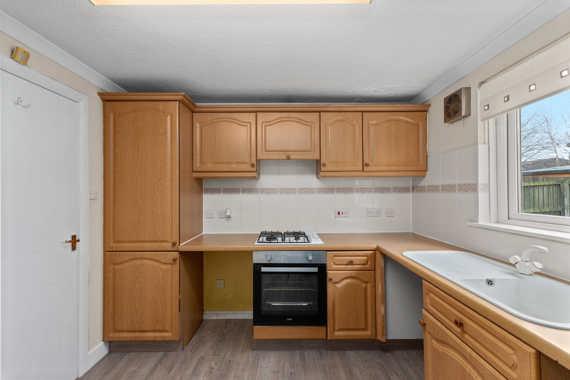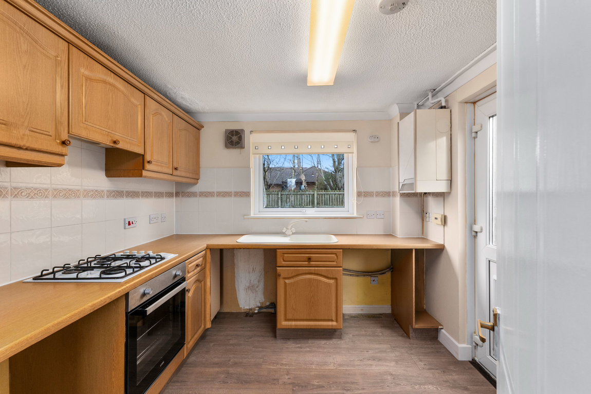 The kitchen is well-equipped with a wide range of base and wall-mounted units, offering excellent storage and workspace. It includes an integrated oven and hob, along with space for free-standing appliances such as a washing machine, dishwasher and fridge/freezer. A door from the kitchen provides direct access to the rear garden, adding to the practicality of the layout.