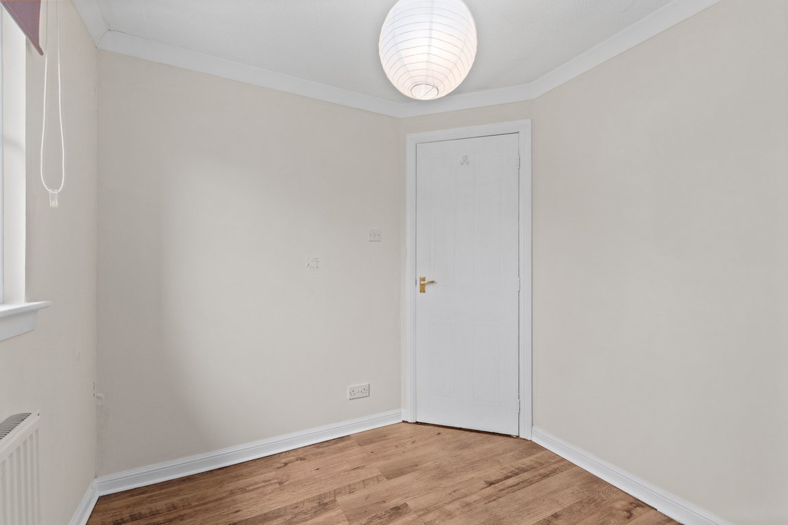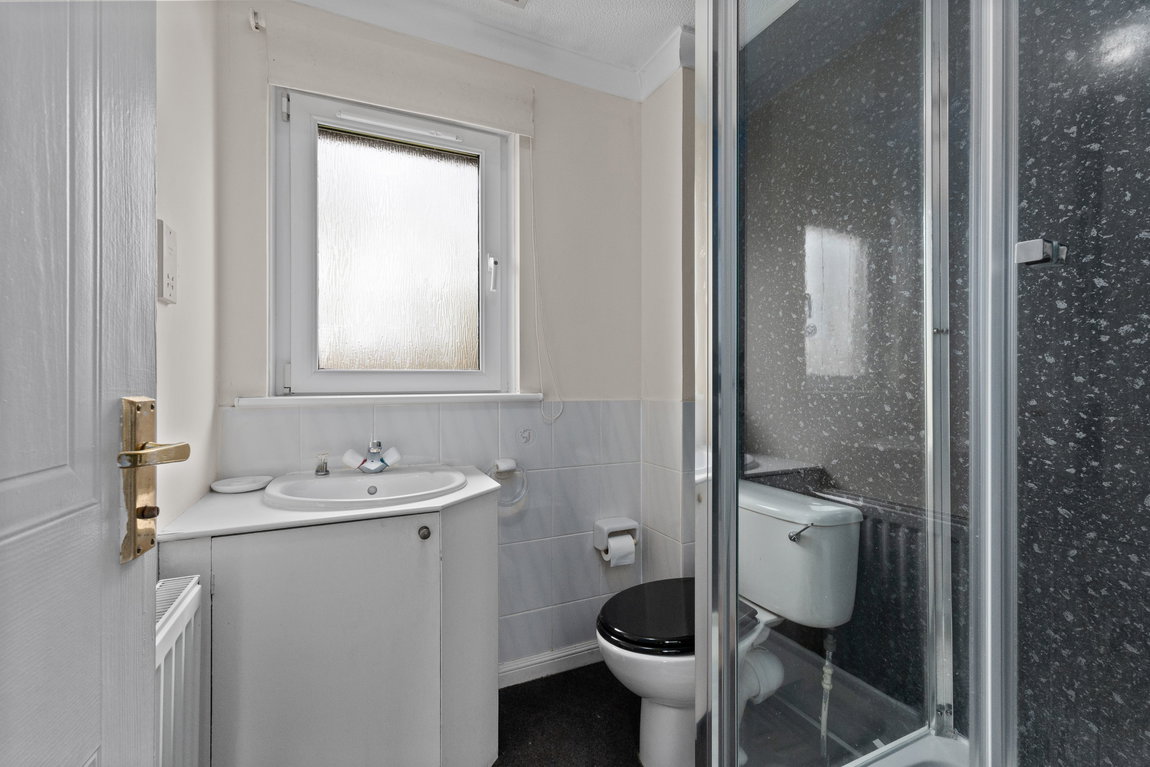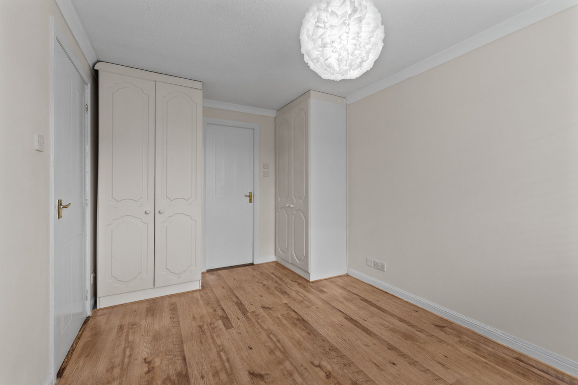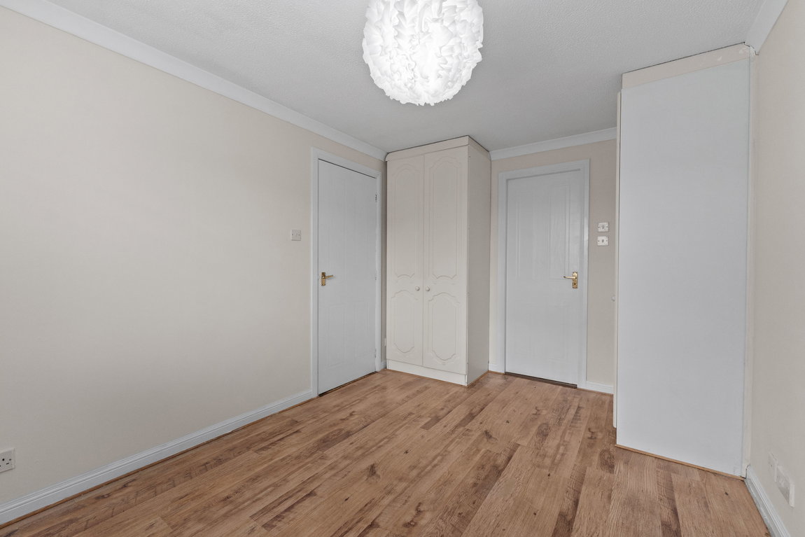 Upstairs, the property continues to impress with three well-proportioned bedrooms and a family bathroom. There is also a handy storage cupboard on the landing, which houses the water tank. The principal bedroom is positioned to the front and features two fitted wardrobes, laminate flooring and neutral decor, along with the added benefit of an en suite shower room complete with WC, wash hand basin and shower cubicle with wet wall panelling. Bedroom two is another generous double room, also front-facing, and offers excellent storage with two built-in cupboards, one with shelving and the other providing both shelving and hanging space. The third bedroom is a bright single room with neutral decor and laminate flooring, ideal as a child’s room, nursery or home office. The family bathroom is fitted with a white suite including WC, wash hand basin and bath, complemented by white tiling to the walls and a rear-facing window.