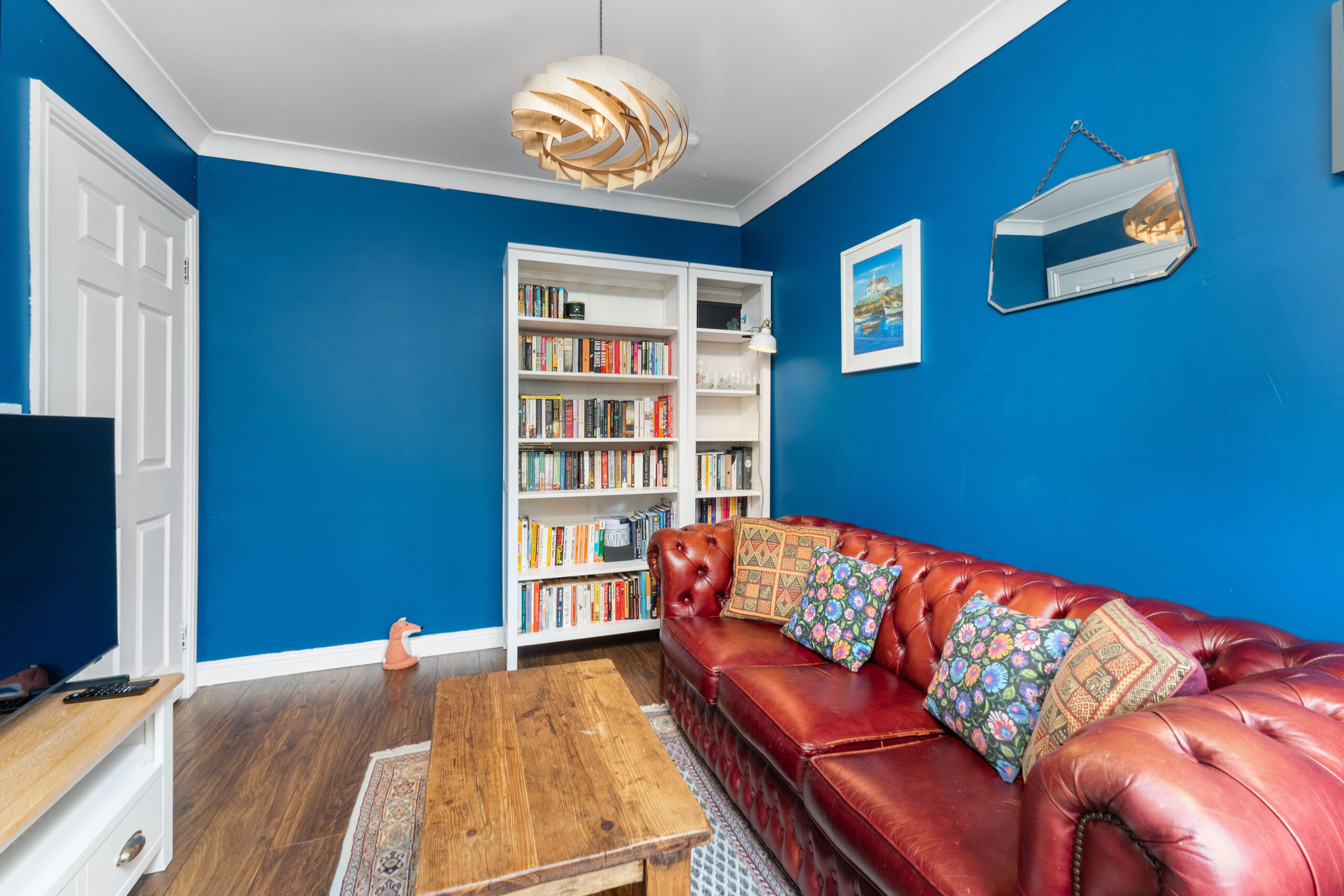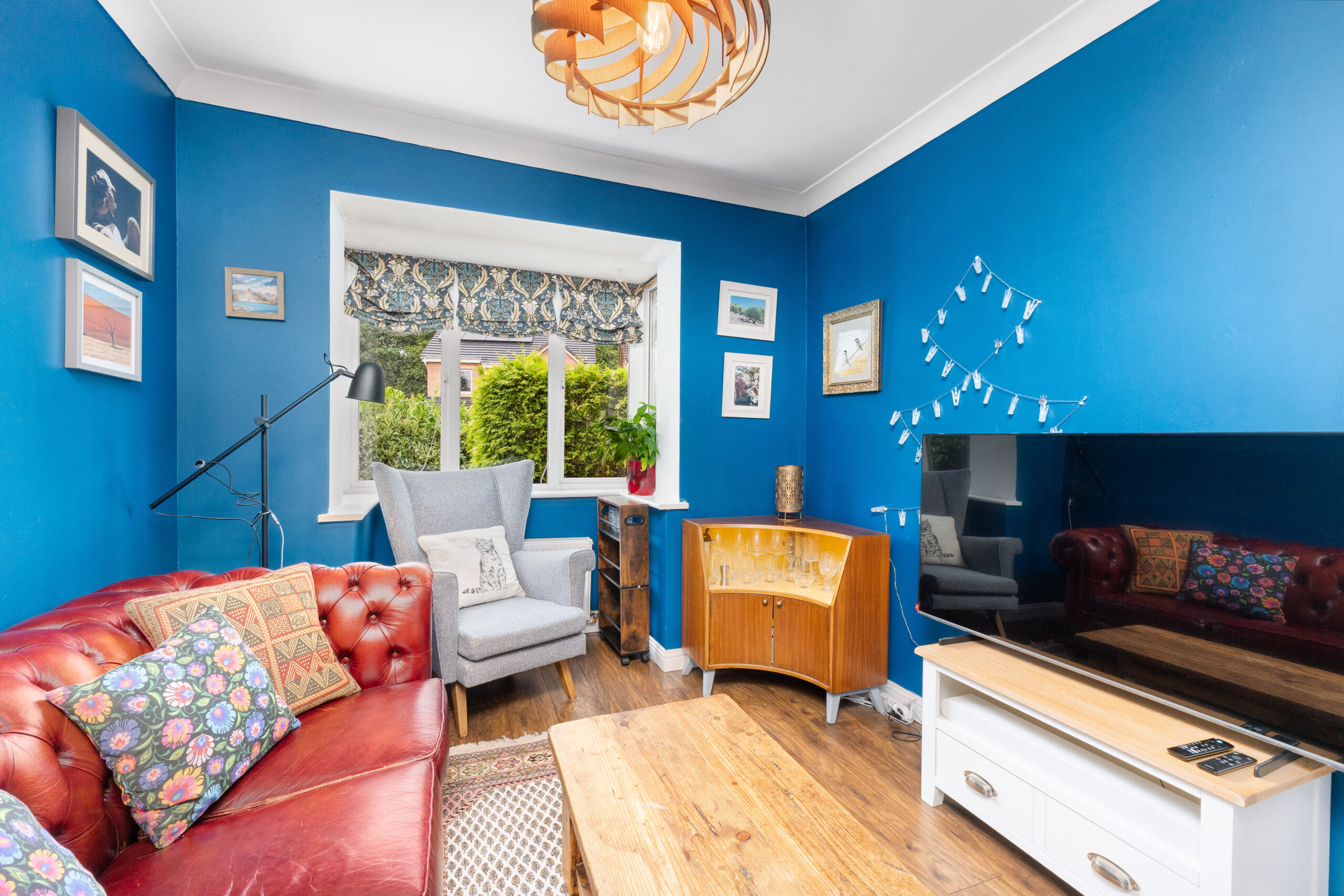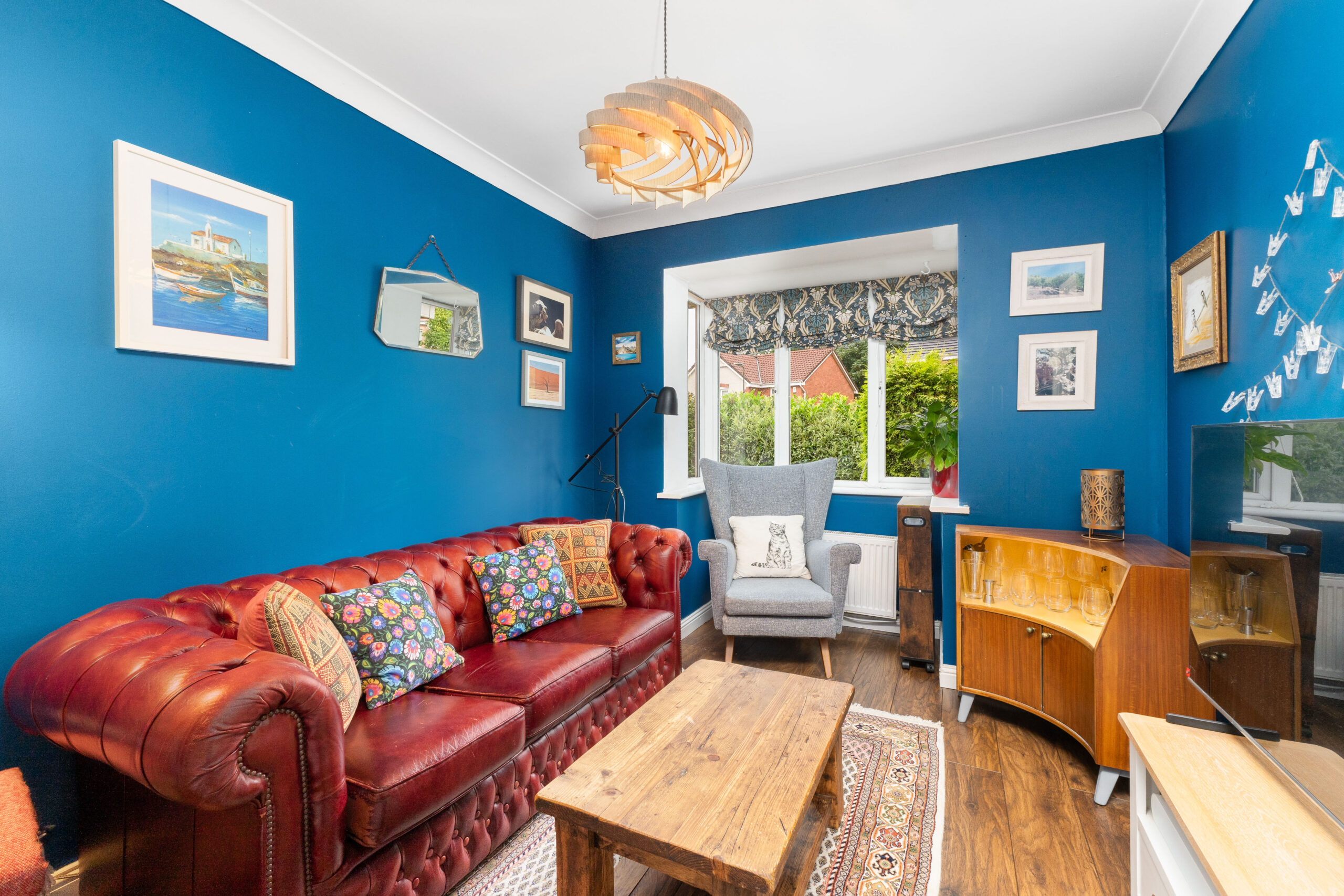To the front of the home, a flexible second reception room is currently styled as a second lounge but would work equally well as a formal dining room, home office, or playroom. Decorated in a deep navy blue with a bay window to the front, it's a sophisticated and adaptable space that can evolve with your family's needs.